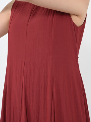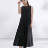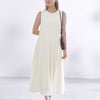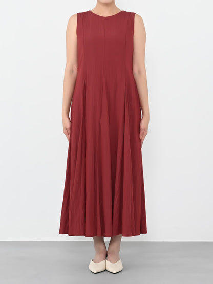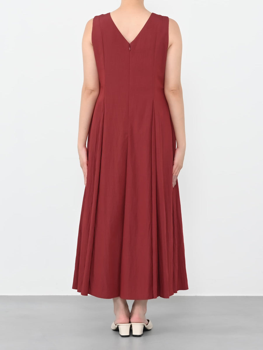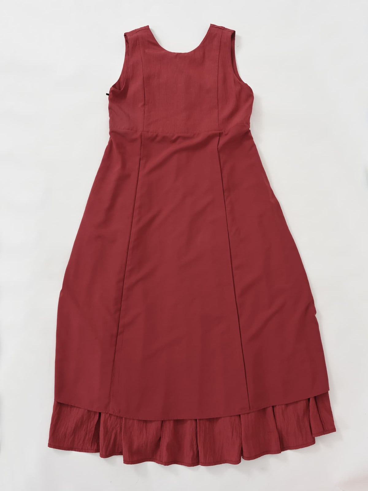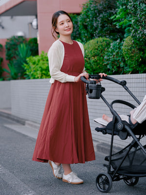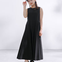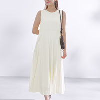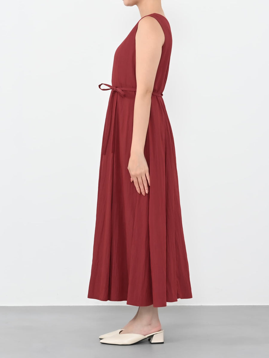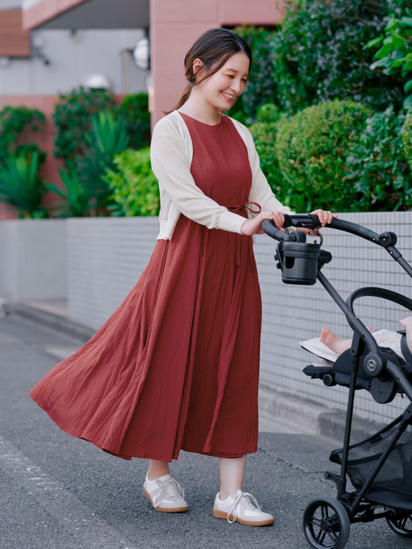 付属のリボンをつけているので、ウエストマークも。リボンを後ろで結ぶとよりすっきりとしたシルエットに。暖かい季節も涼しく乗り切れるノースリーブで、カーディガンやシャツなど羽織りやすいのもポイントです。