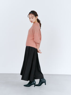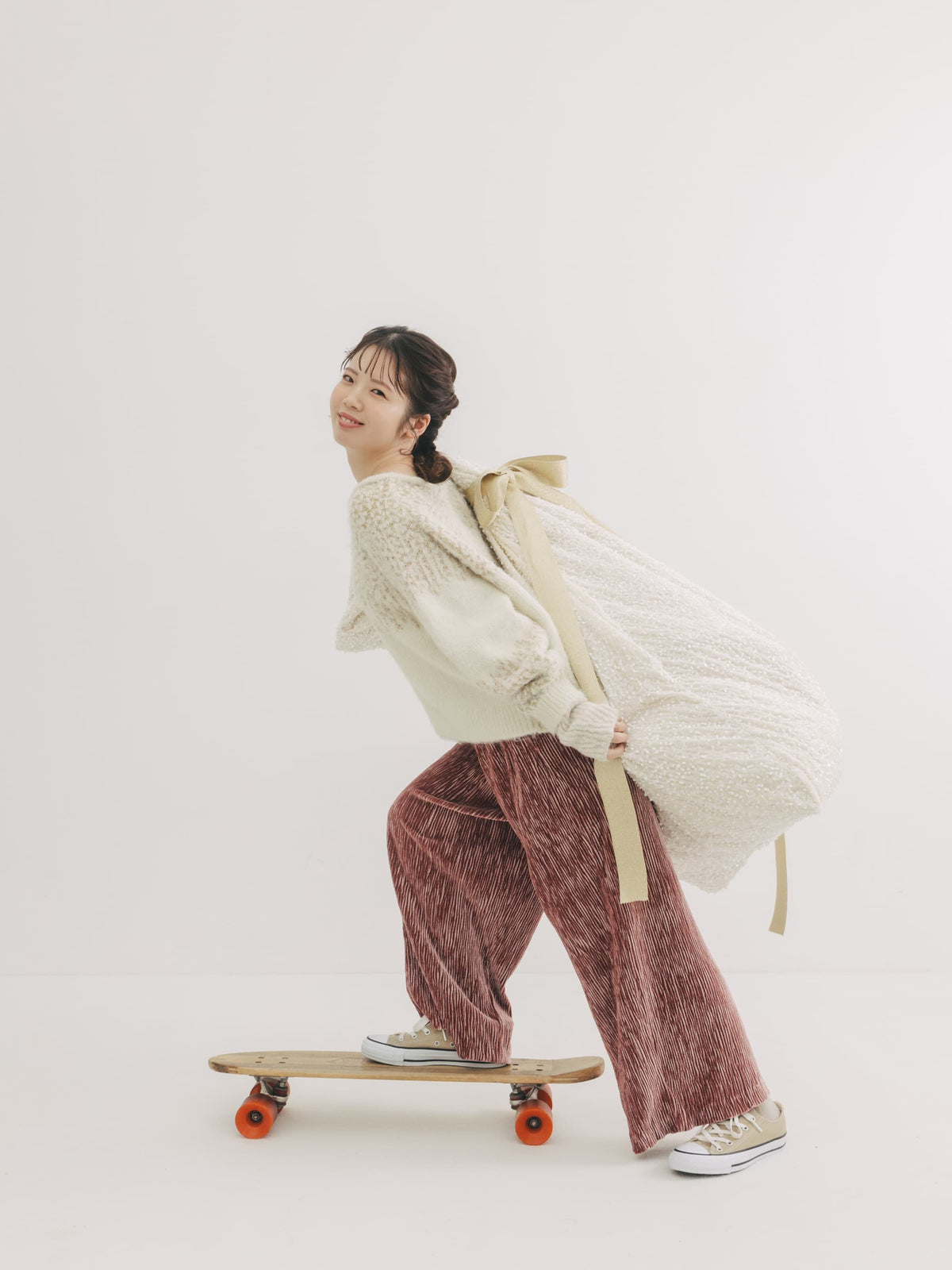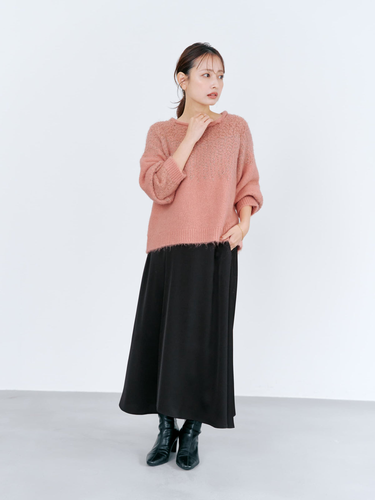 ふわふわとしたヘアリーな糸が、冬の空気に柔らかさと女性らしさをプラスします。シルエットはゆるっとしているけど、前後差のある着丈と落ち感のおかげで、ちゃんとすっきり見えるのも推しポイント♡