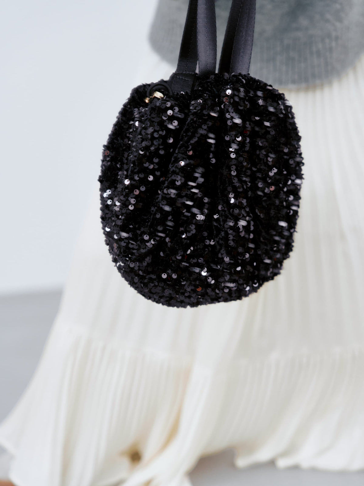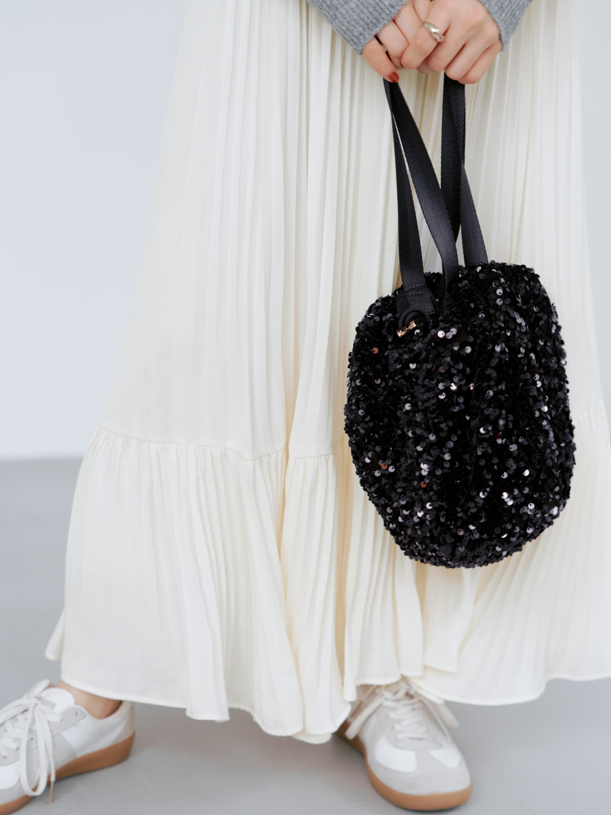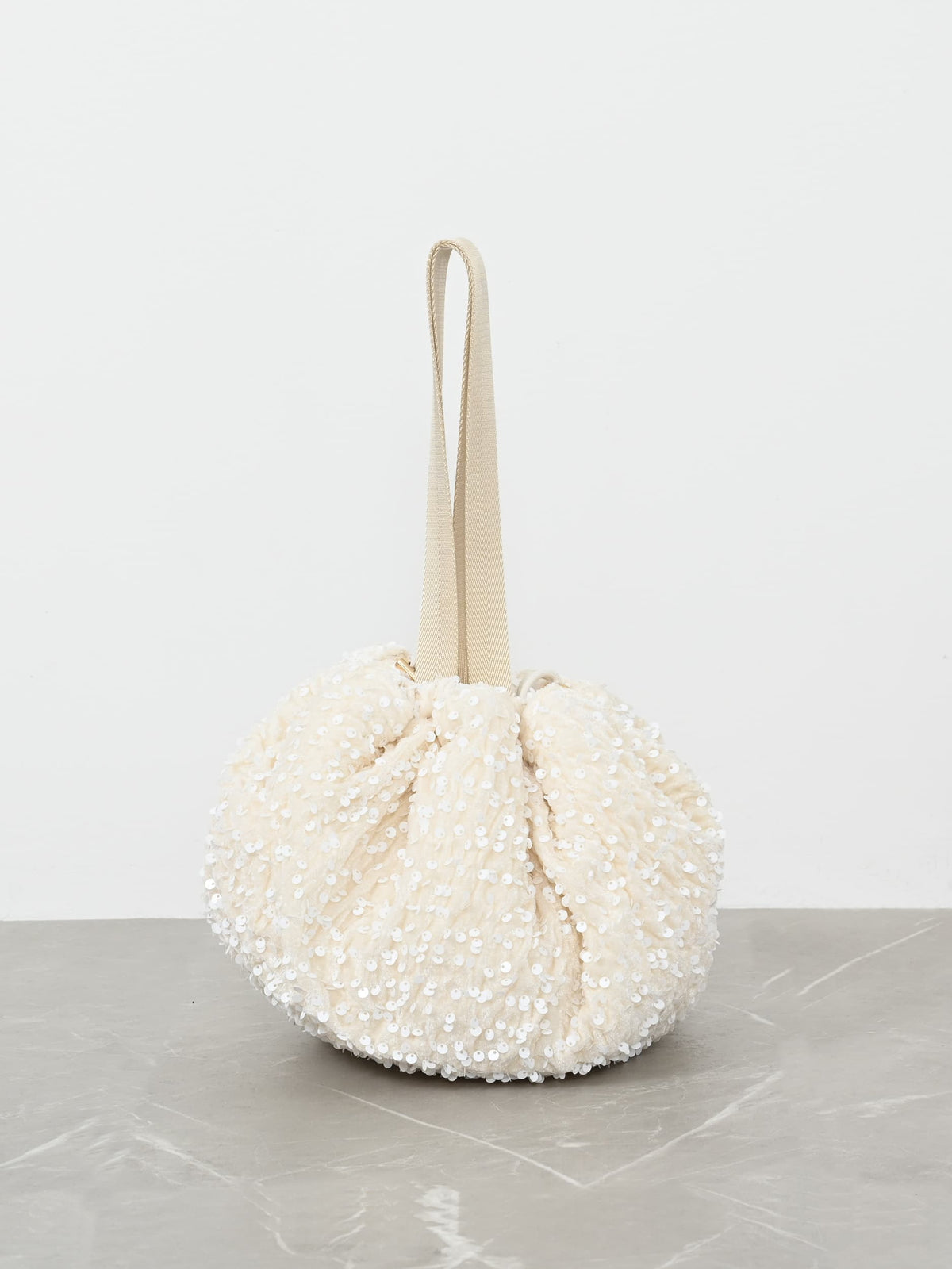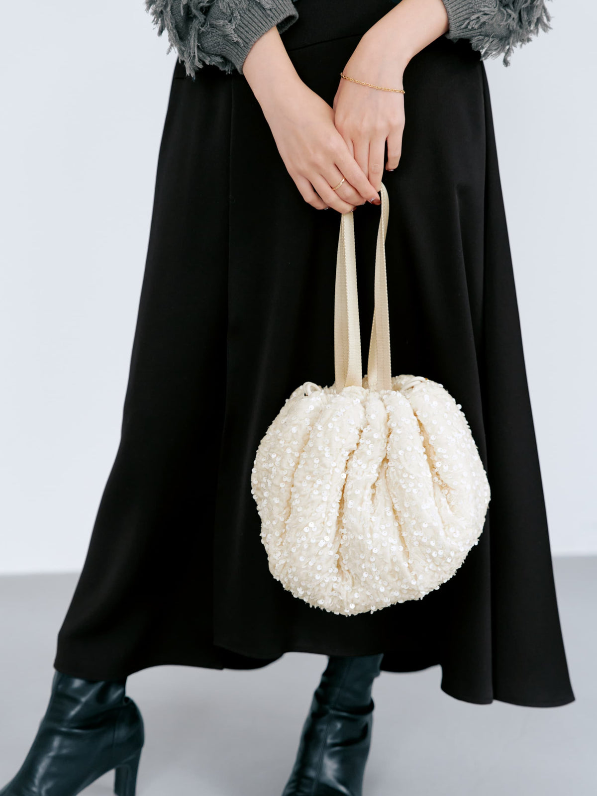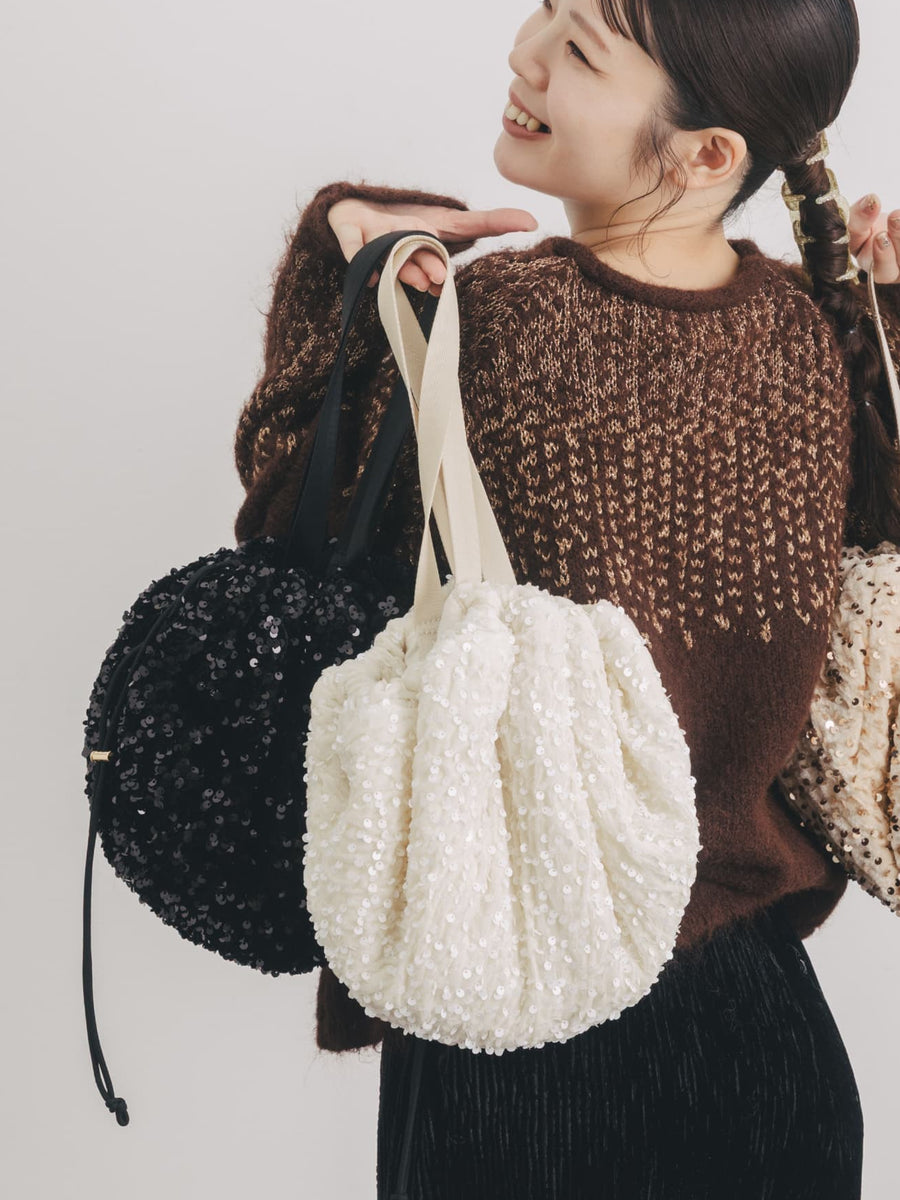 スノーホワイトやシャンパンは、トーンを揃えた淡色コーデに特に好相性。ざっくりニットにデニムというラフな着こなしも、スパンコールの光が加わることでほどよくドレッシーに。ドロストをしっかり絞り、丸い巾着シルエットで持つとドレスにも合う上品な存在感に。