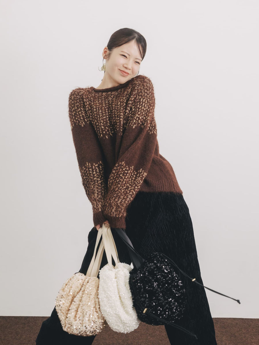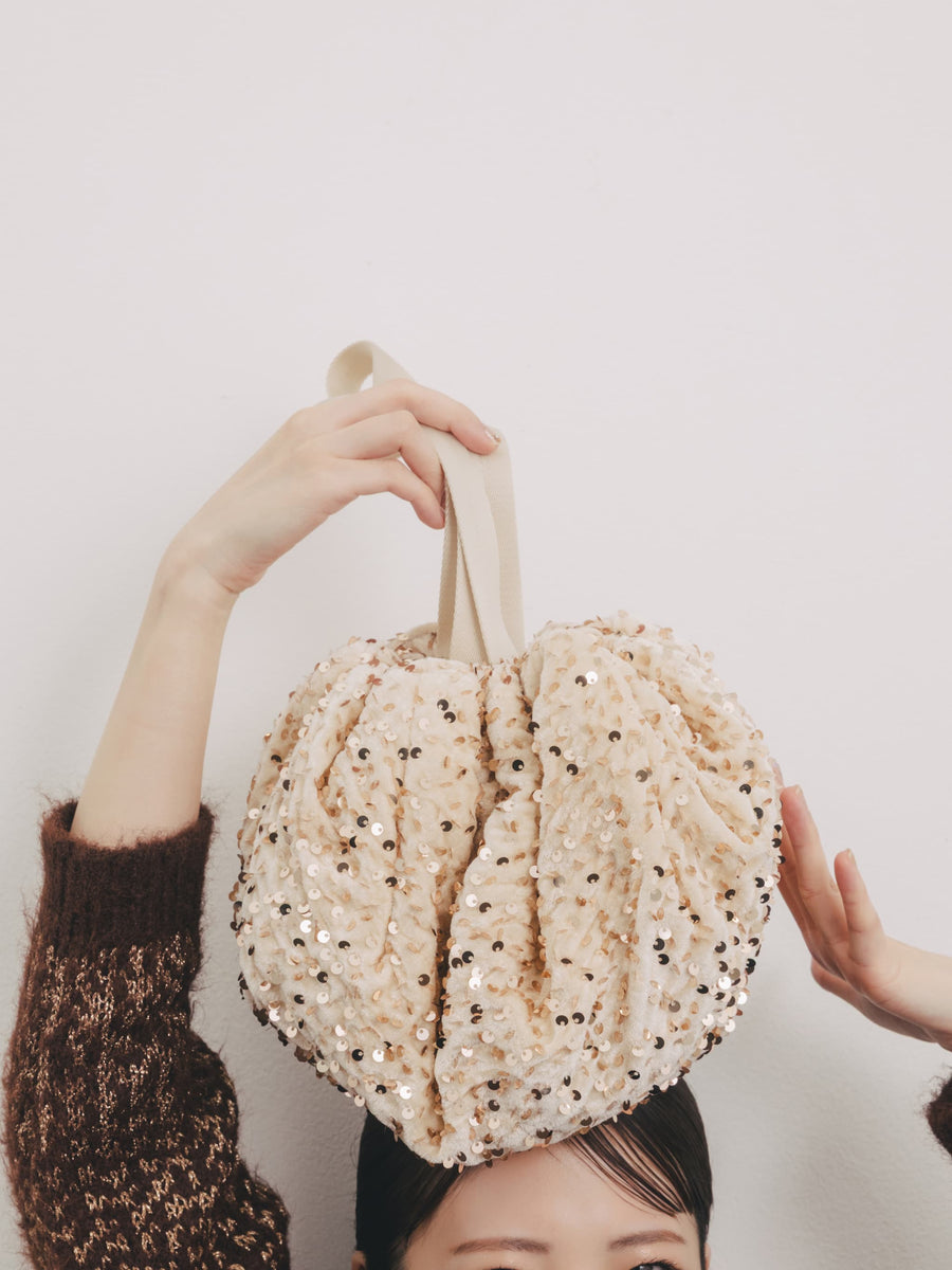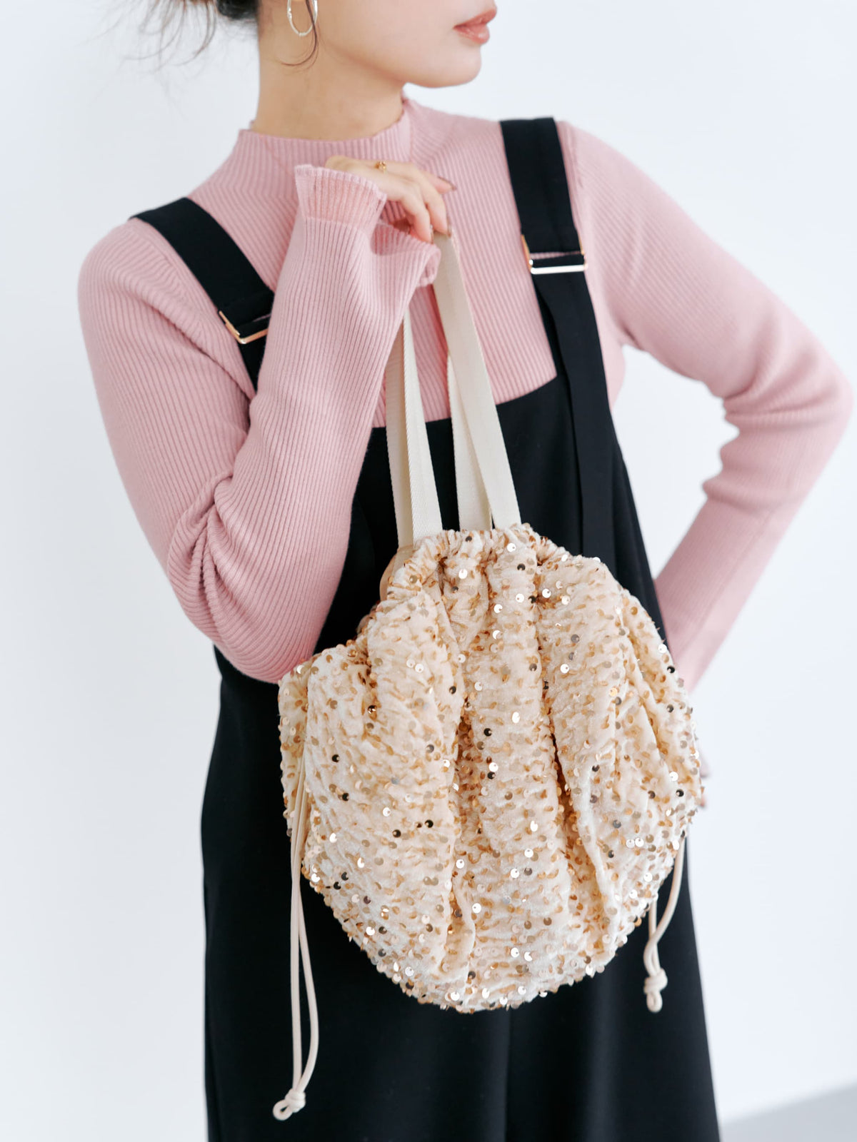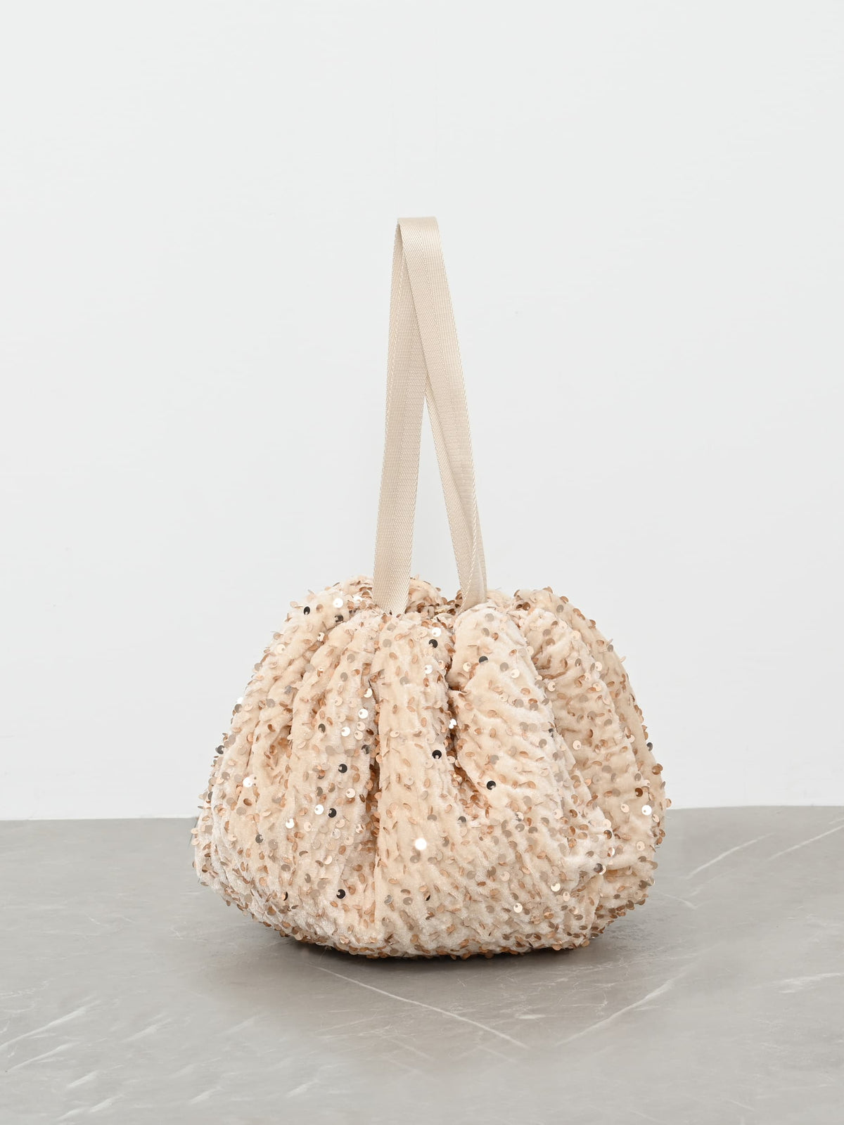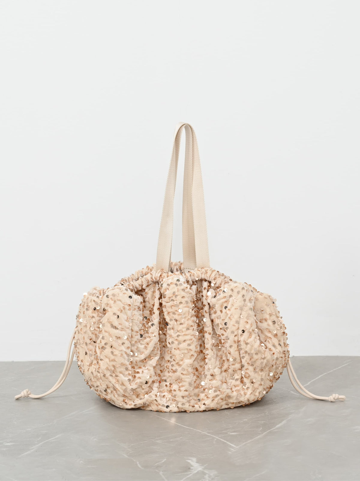 スノーホワイトやシャンパンは、トーンを揃えた淡色コーデに特に好相性。ざっくりニットにデニムというラフな着こなしも、スパンコールの光が加わることでほどよくドレッシーに。ドロストをしっかり絞り、丸い巾着シルエットで持つとドレスにも合う上品な存在感に。