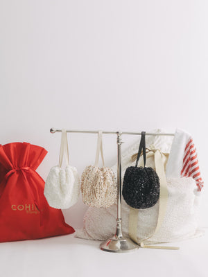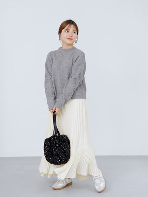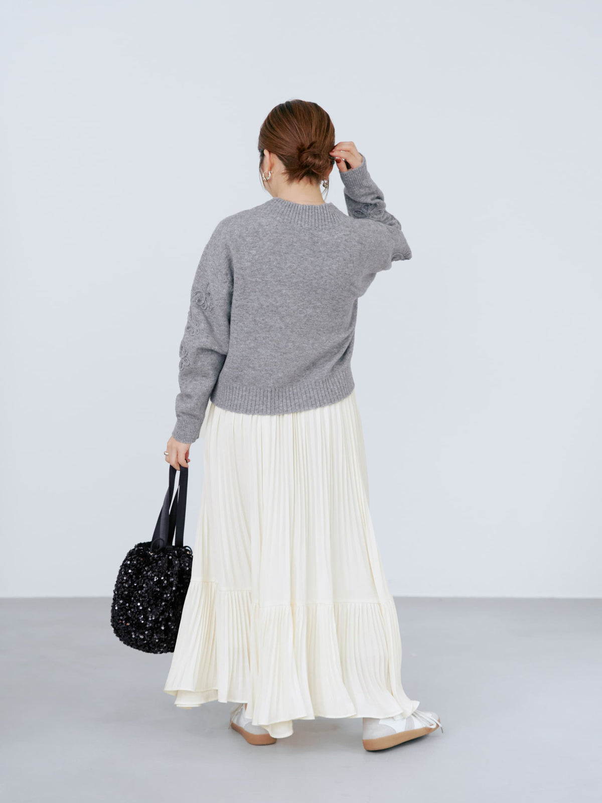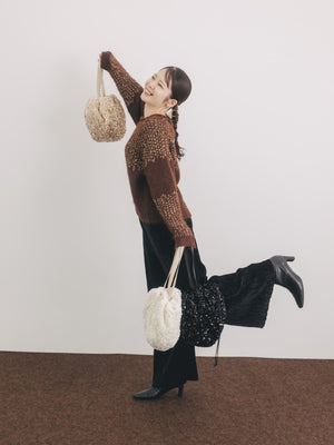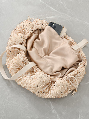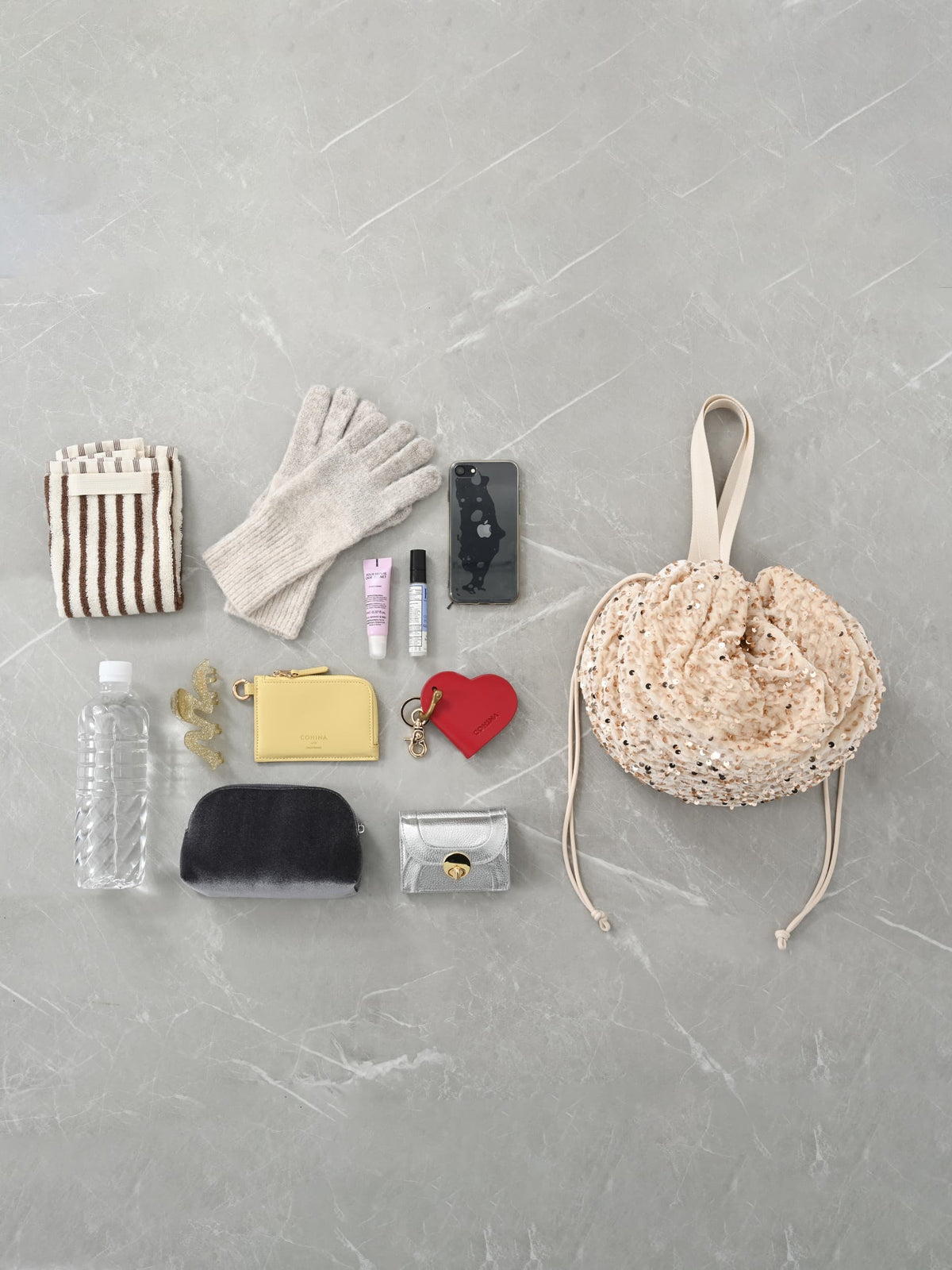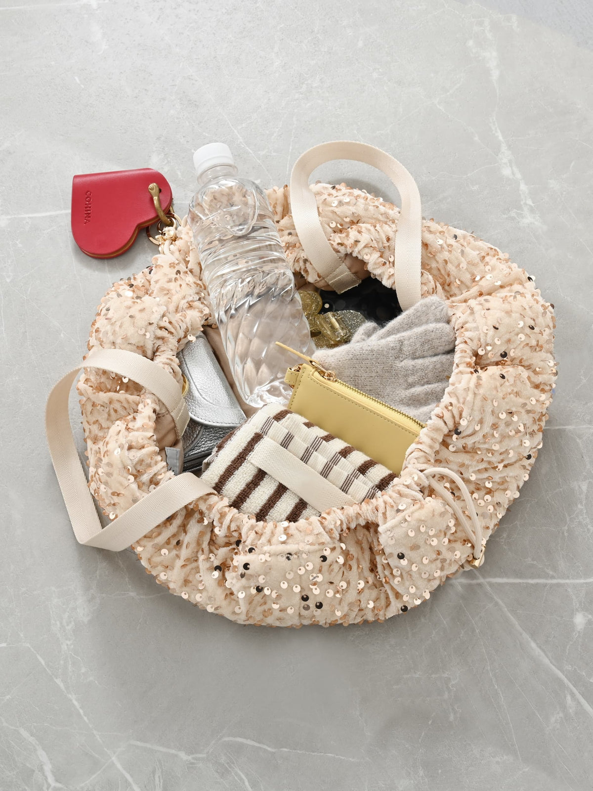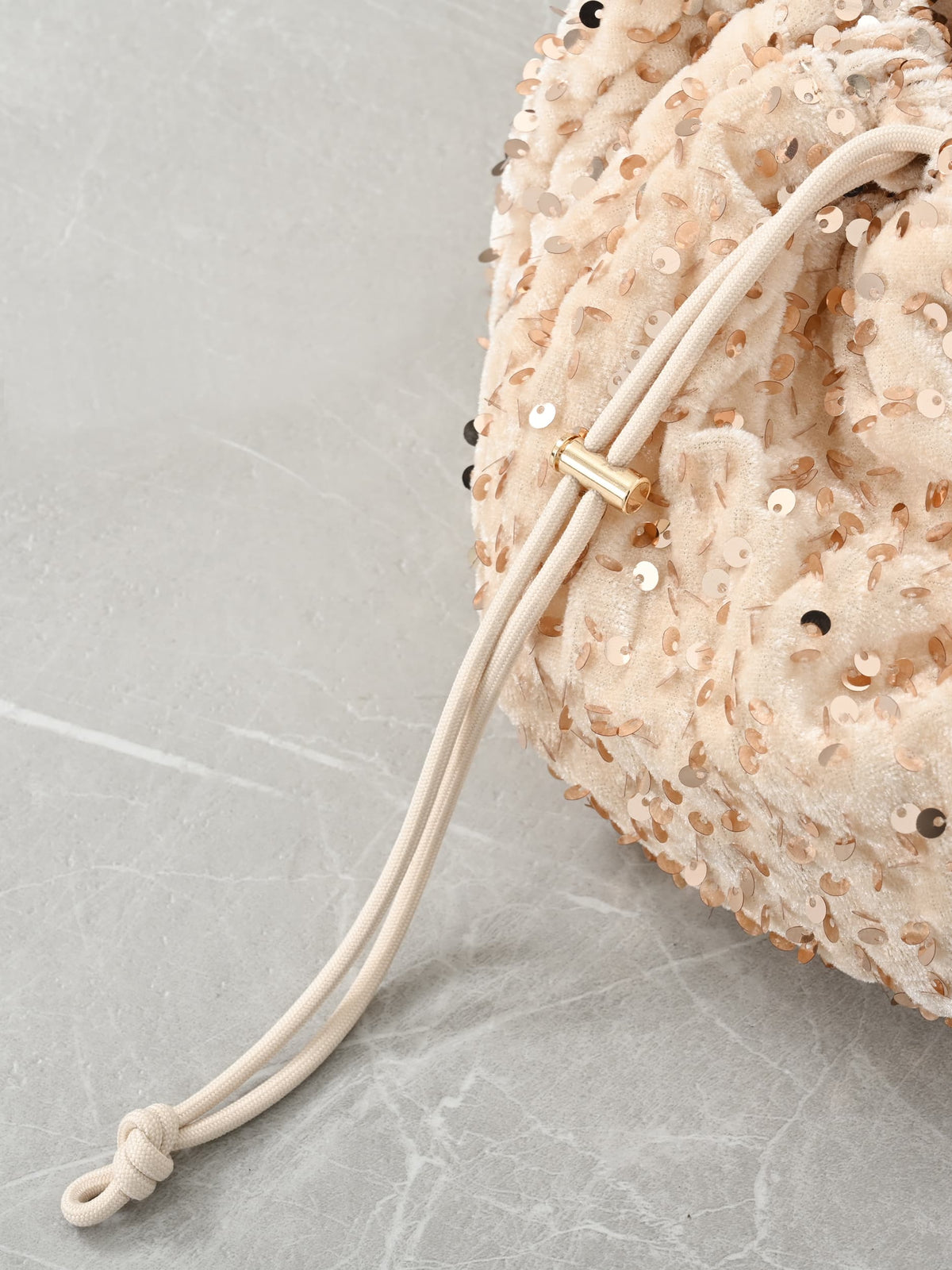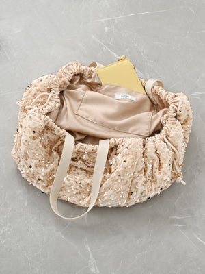 スノーホワイトやシャンパンは、トーンを揃えた淡色コーデに特に好相性。ざっくりニットにデニムというラフな着こなしも、スパンコールの光が加わることでほどよくドレッシーに。ドロストをしっかり絞り、丸い巾着シルエットで持つとドレスにも合う上品な存在感に。