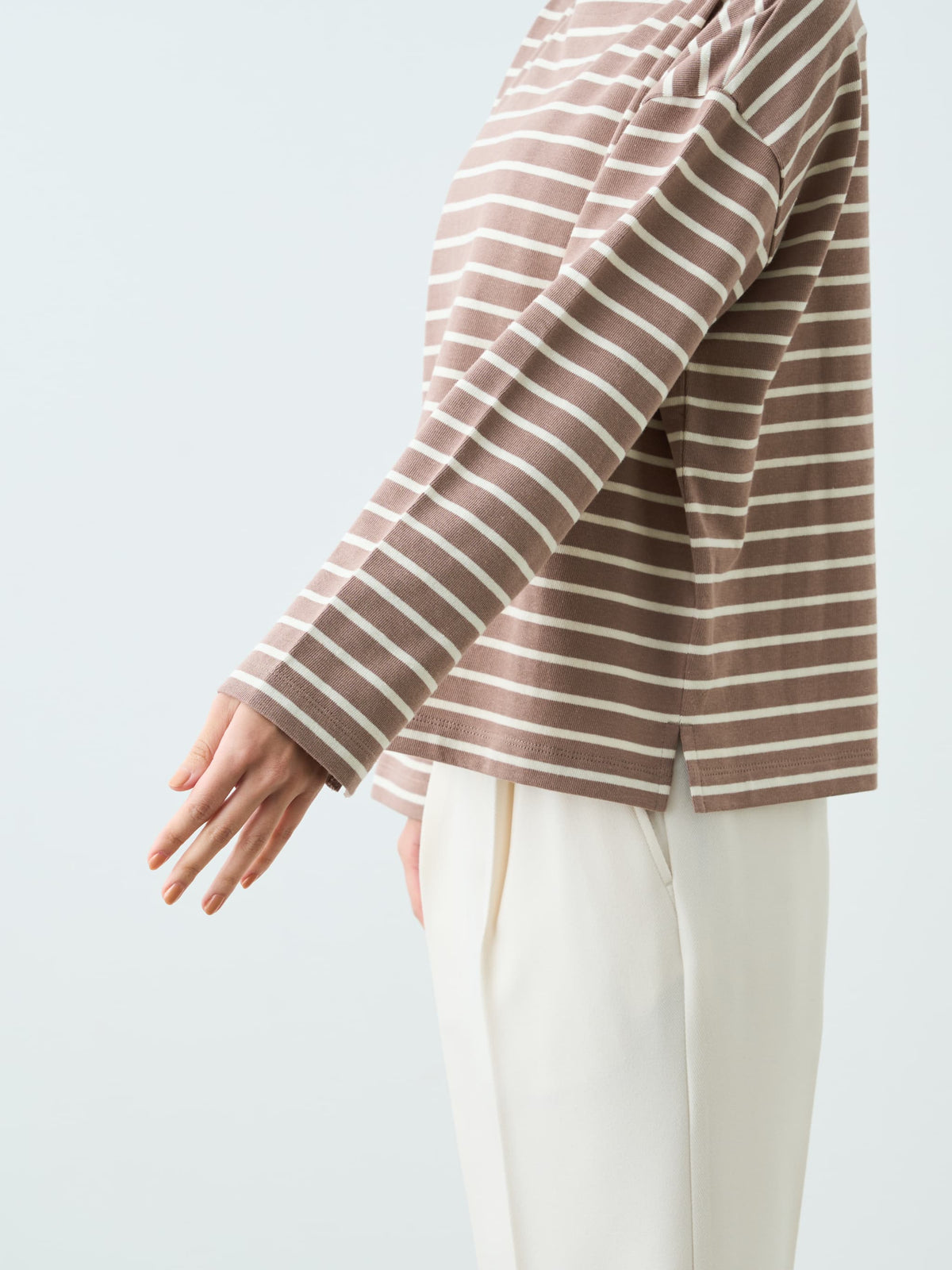 襟周りは抜け感がありつつもインナーが覗かない絶妙なボートネックになっています。裾や袖口に入れたスリットでさりげなく抜け感を演出。サイジングとディティールにこだわったCOHINAならではを実感していただけるベーシックアイテム。