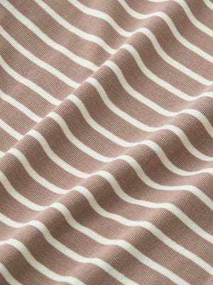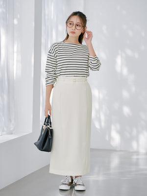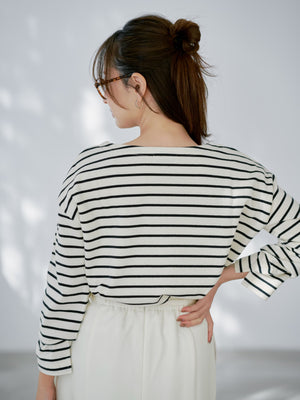 程よい開きのボートネックが首元をすっきり見せるバスクシャツ。ゆったりとしたシルエットで体型カバーも叶い、ボーダー柄がコーデのアクセントに◎