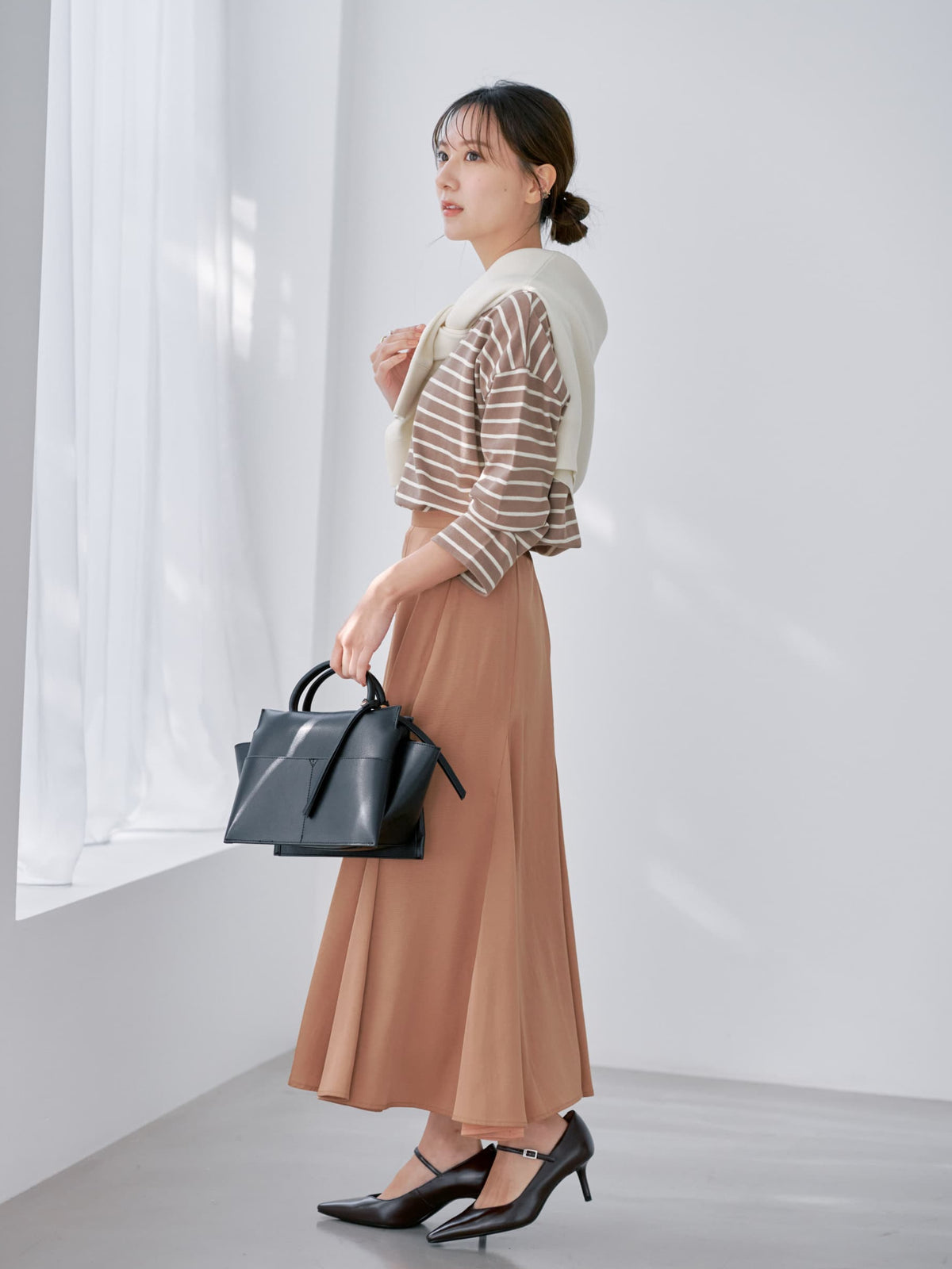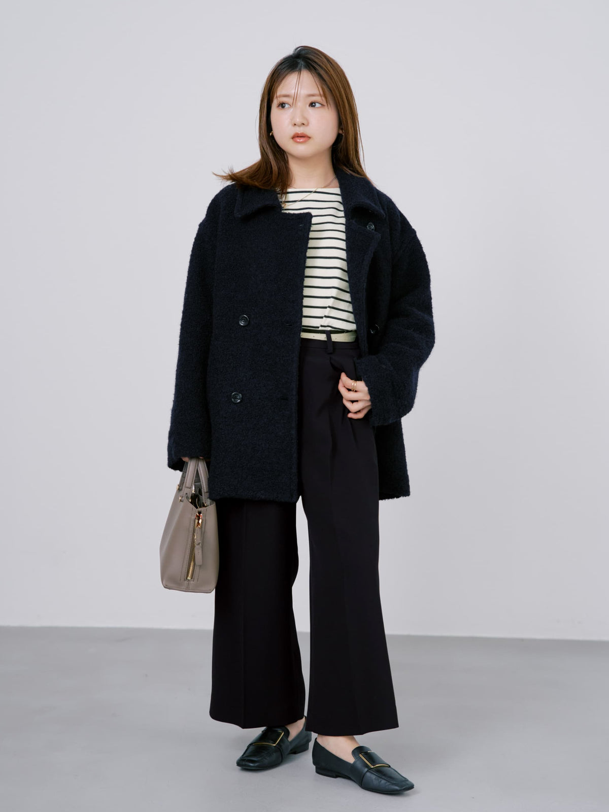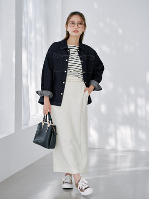 着丈は骨盤あたりで長すぎず、インスタイルもしやすいのがポイント。カジュアルにもきれいめにも合わせやすく、デイリーに活躍する1枚です。