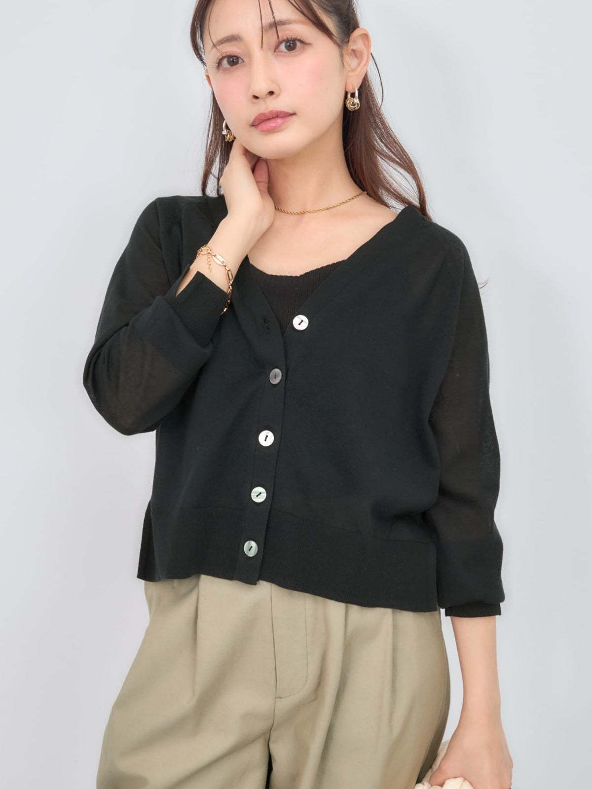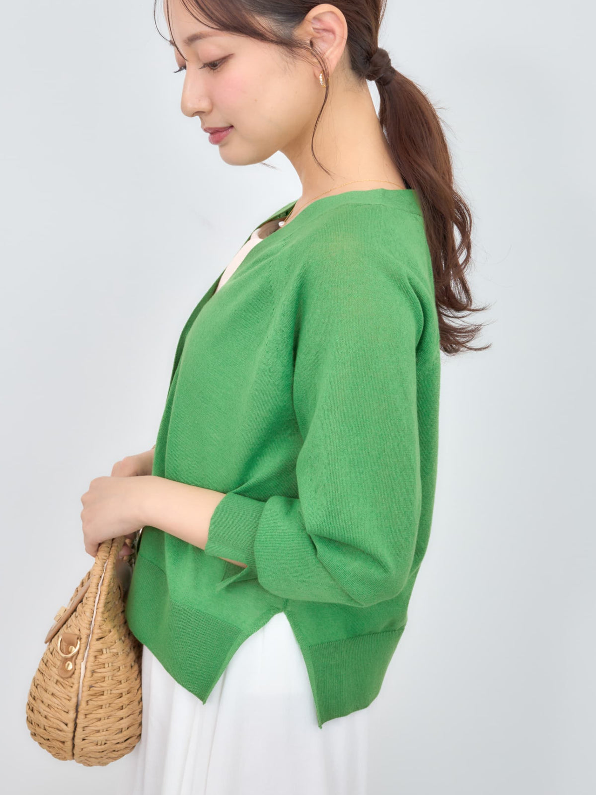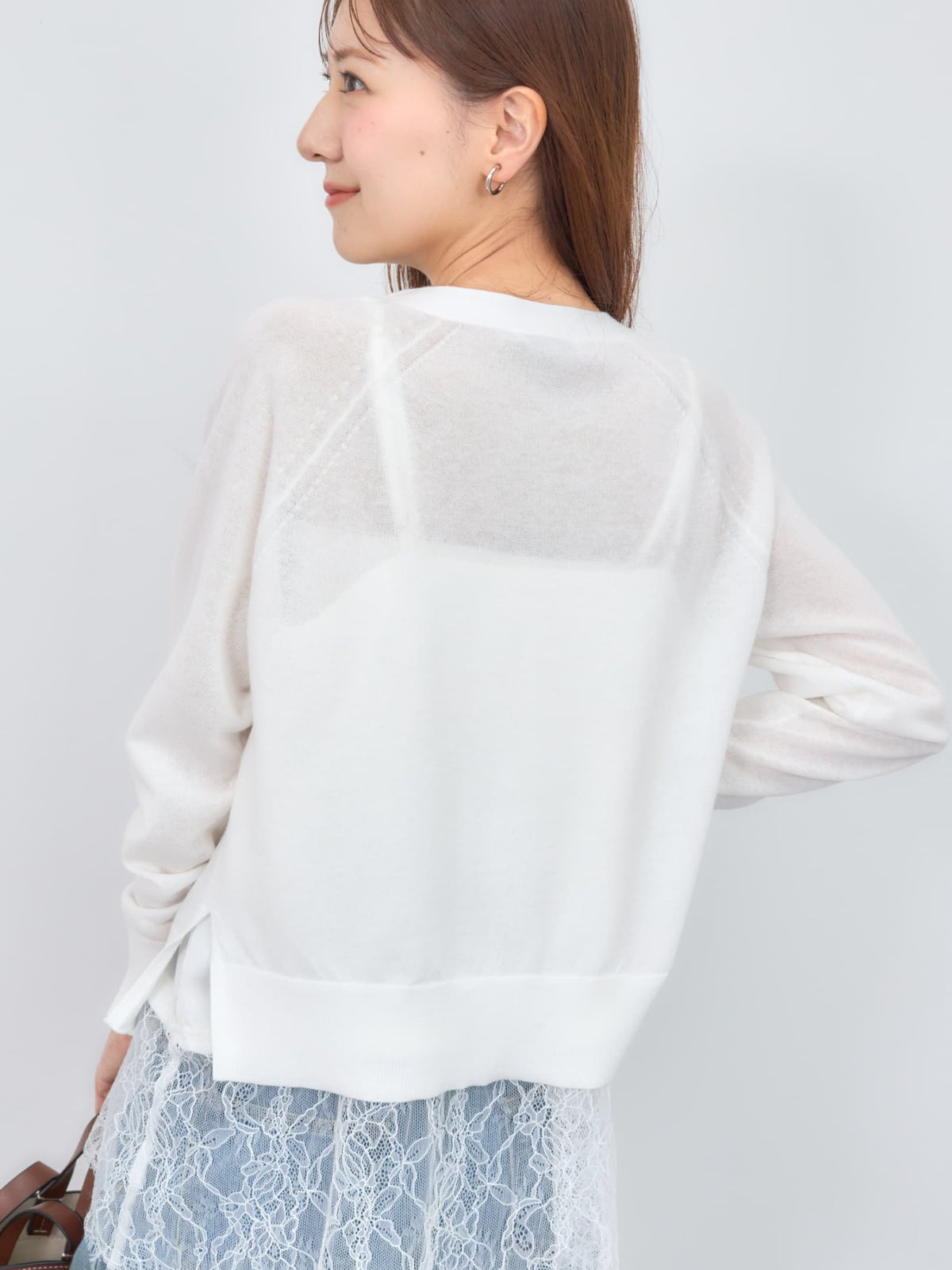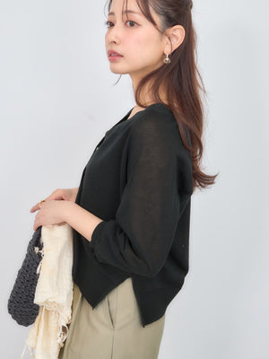 程よい透け感がありこれからの時期に羽織りやすいシアー素材のカーディガン。横のスリットで抜け感をプラスし、144cmで骨盤が隠れるくらいの丈感もポイント◎