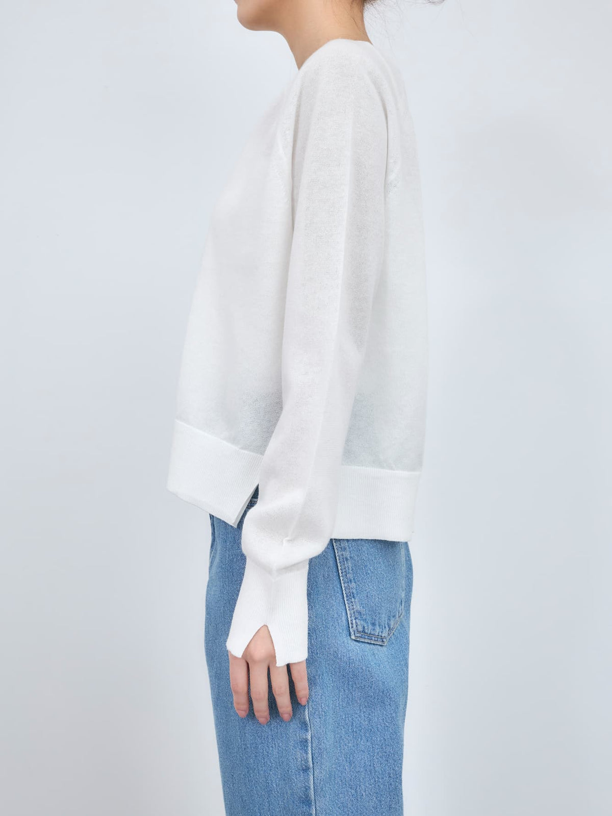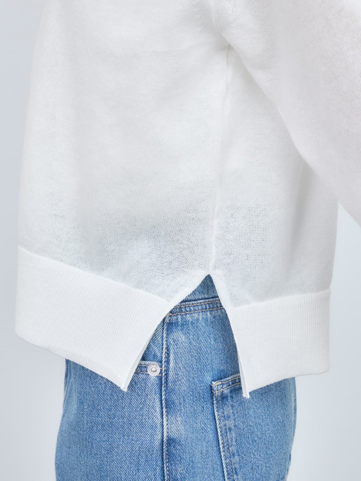 顔まわりをすっきりと見せる深めのVネックデザインとリラックス感のあるサイジングがこなれた印象へ導きます。程よいゆとりがありながらもミニマルなシルエットで、きれいめにもカジュアルにも馴染みます。袖口やサイドに入れたスリットがさりげない抜け感をプラスします。