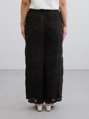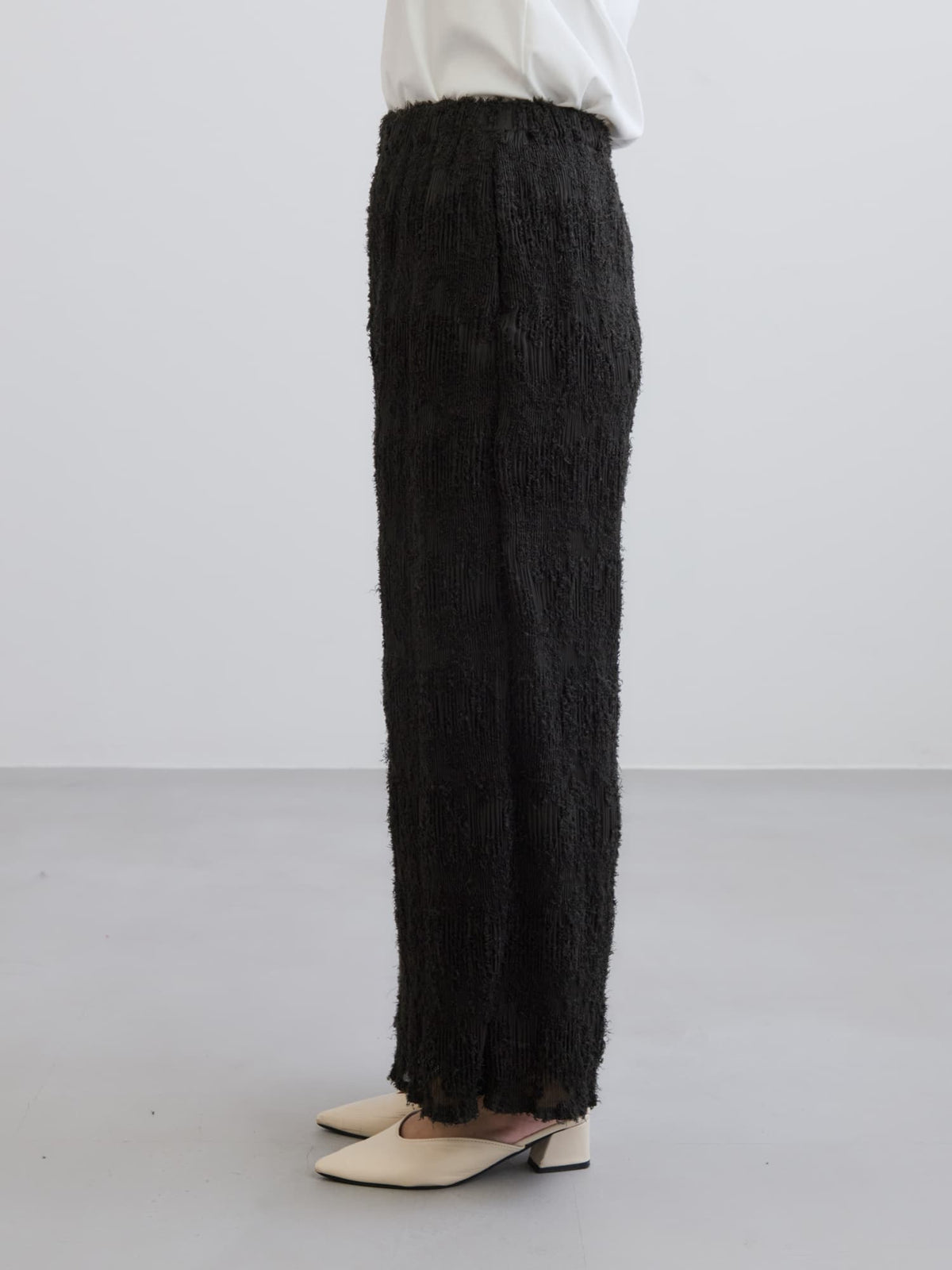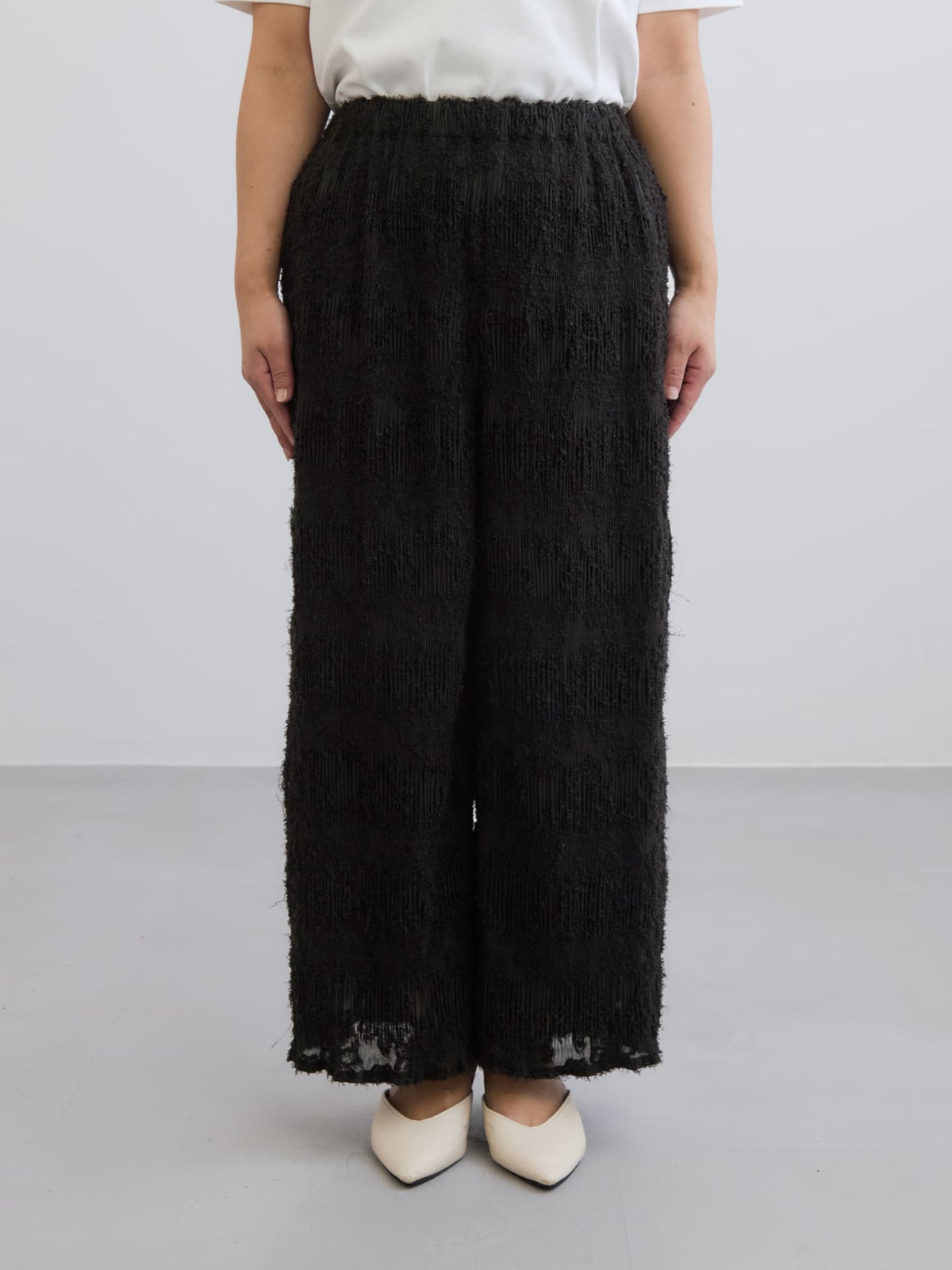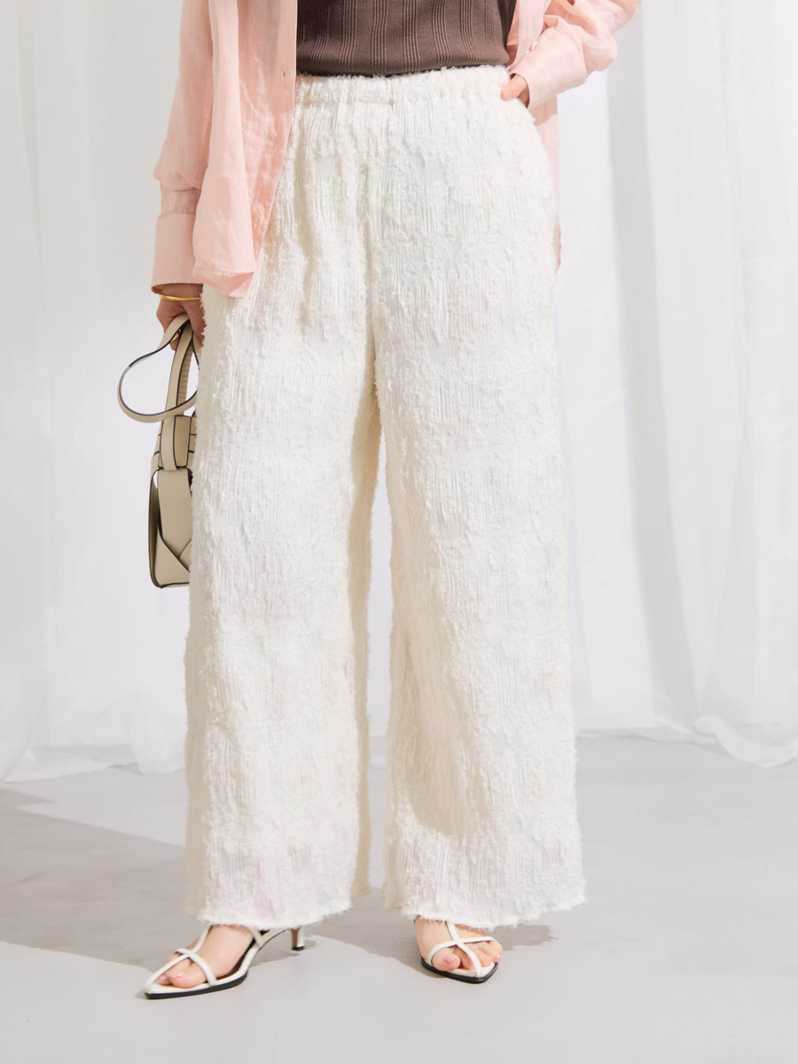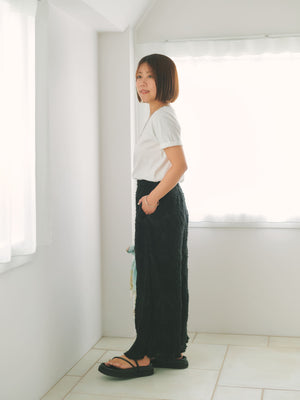 1枚で着映えが叶う表面感が印象的なイージーパンツ。プリーツ加工を施しているので伸縮性があり、ウエストはゴム仕様でリラックスした穿き心地が魅力。