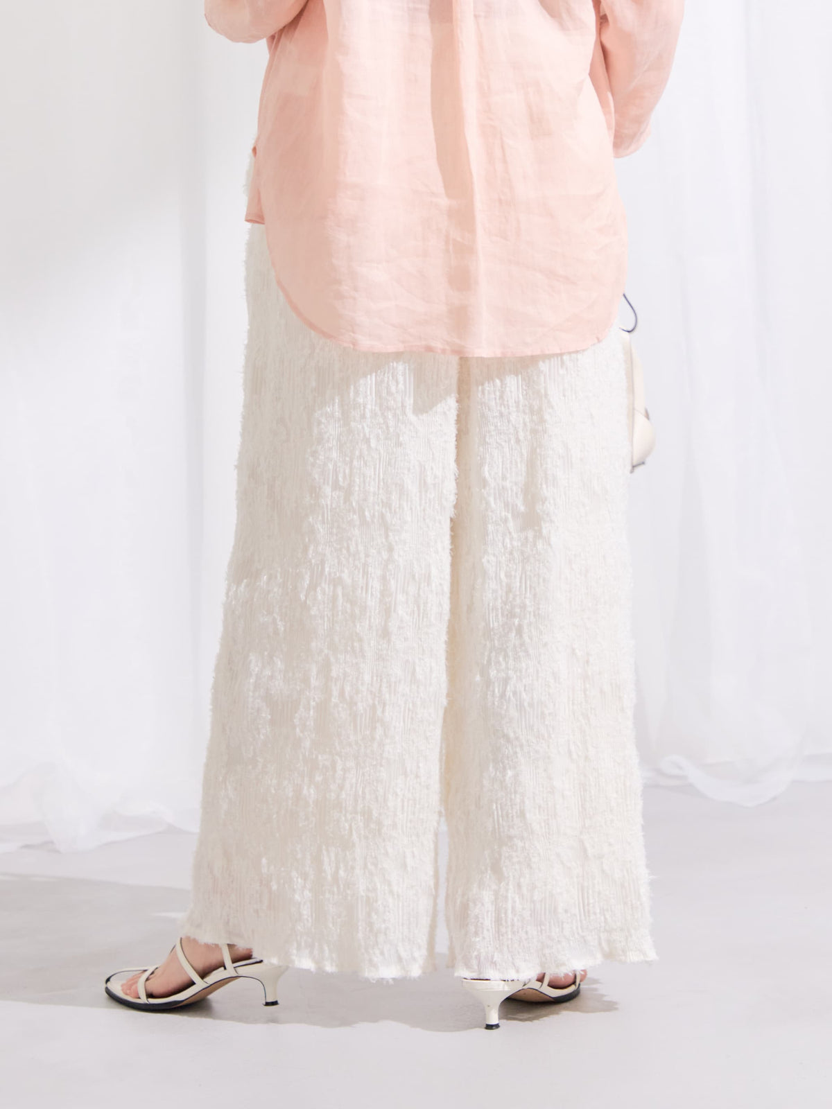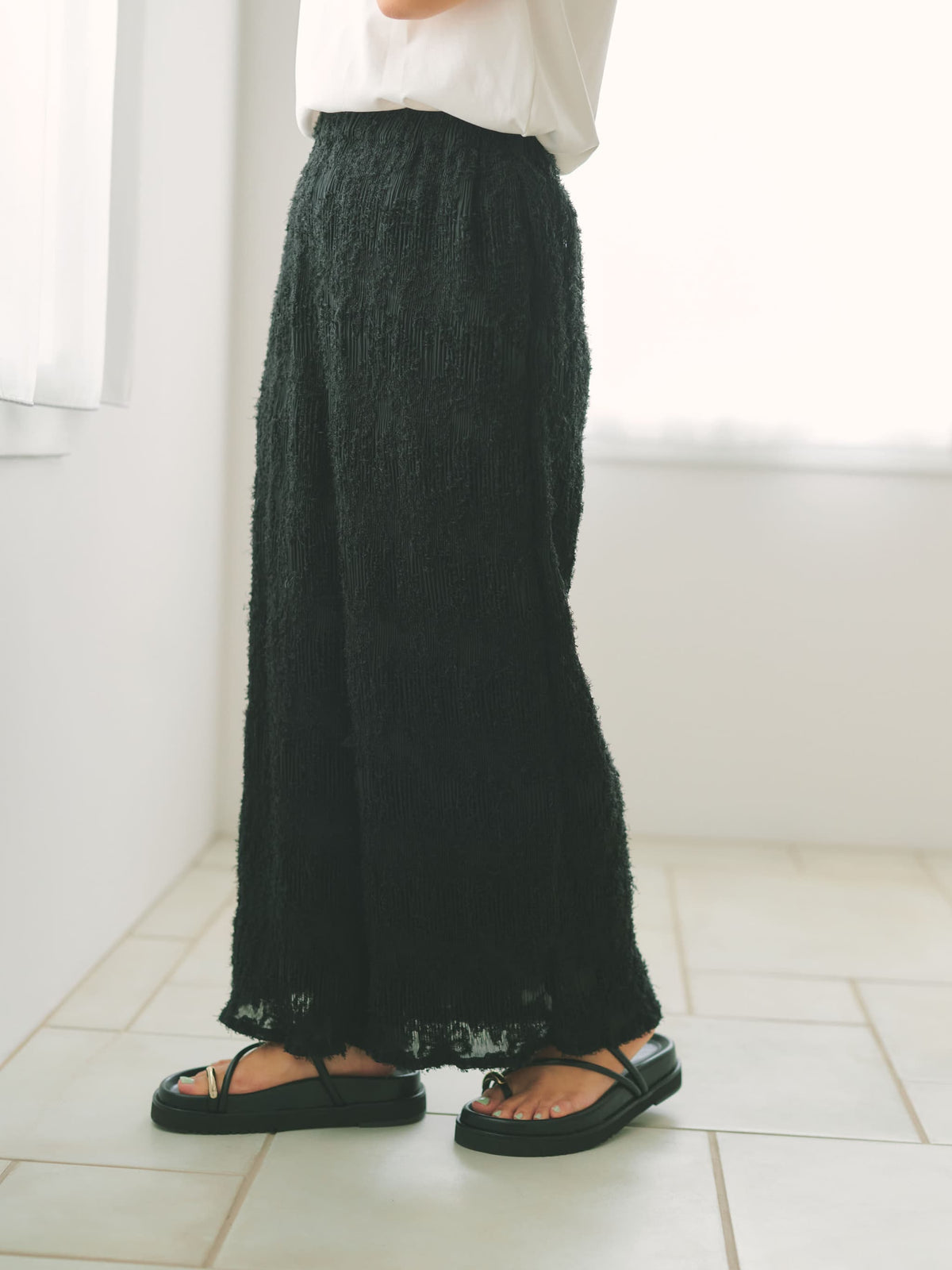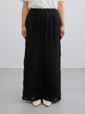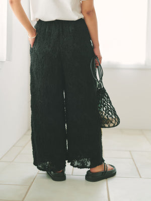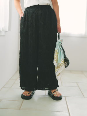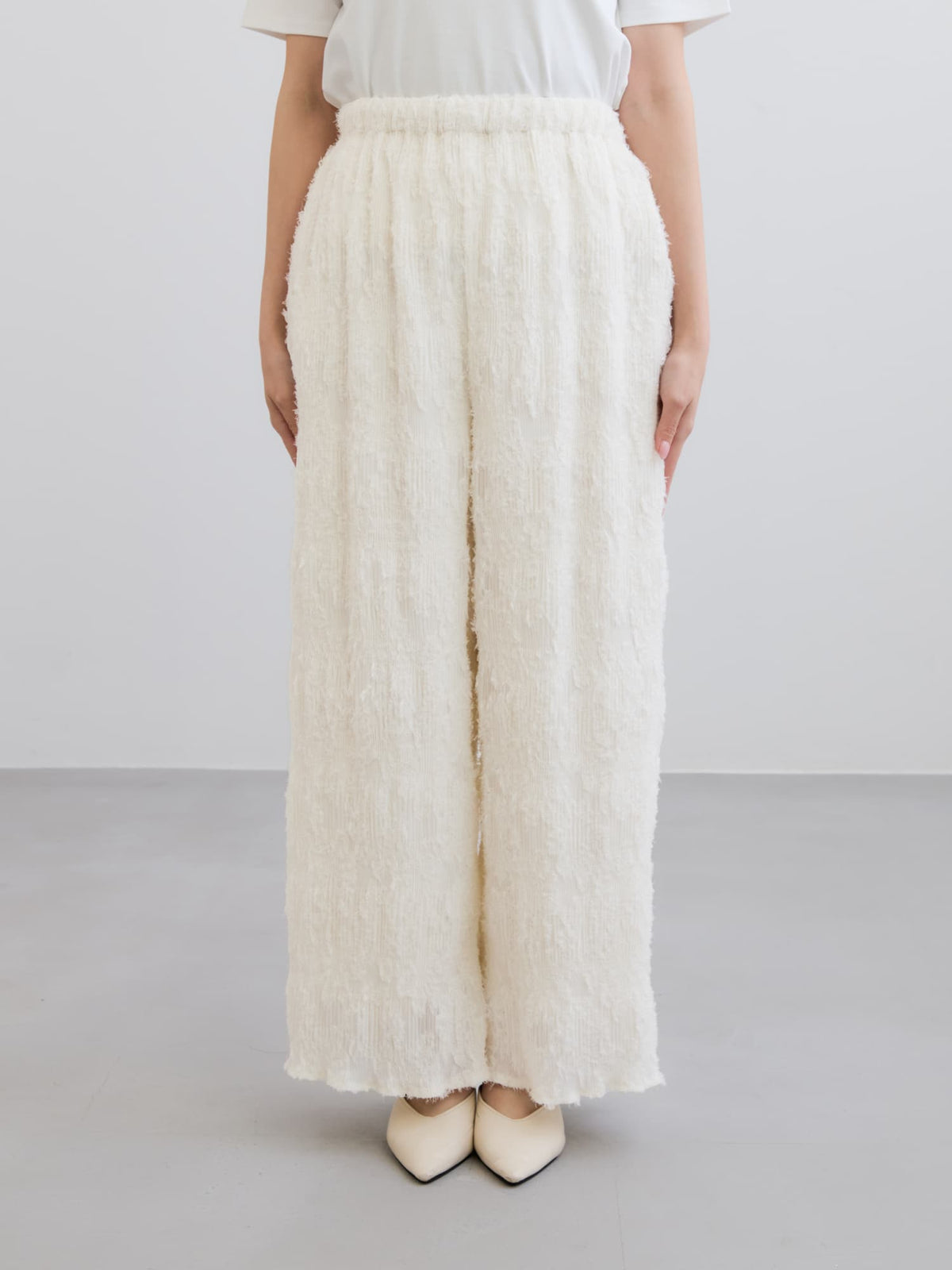 1枚で着映えが叶う表面感が印象的なイージーパンツ。プリーツ加工を施しているので伸縮性があり、ウエストはゴム仕様でリラックスした穿き心地が魅力。