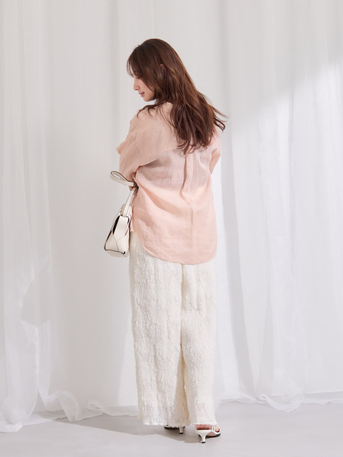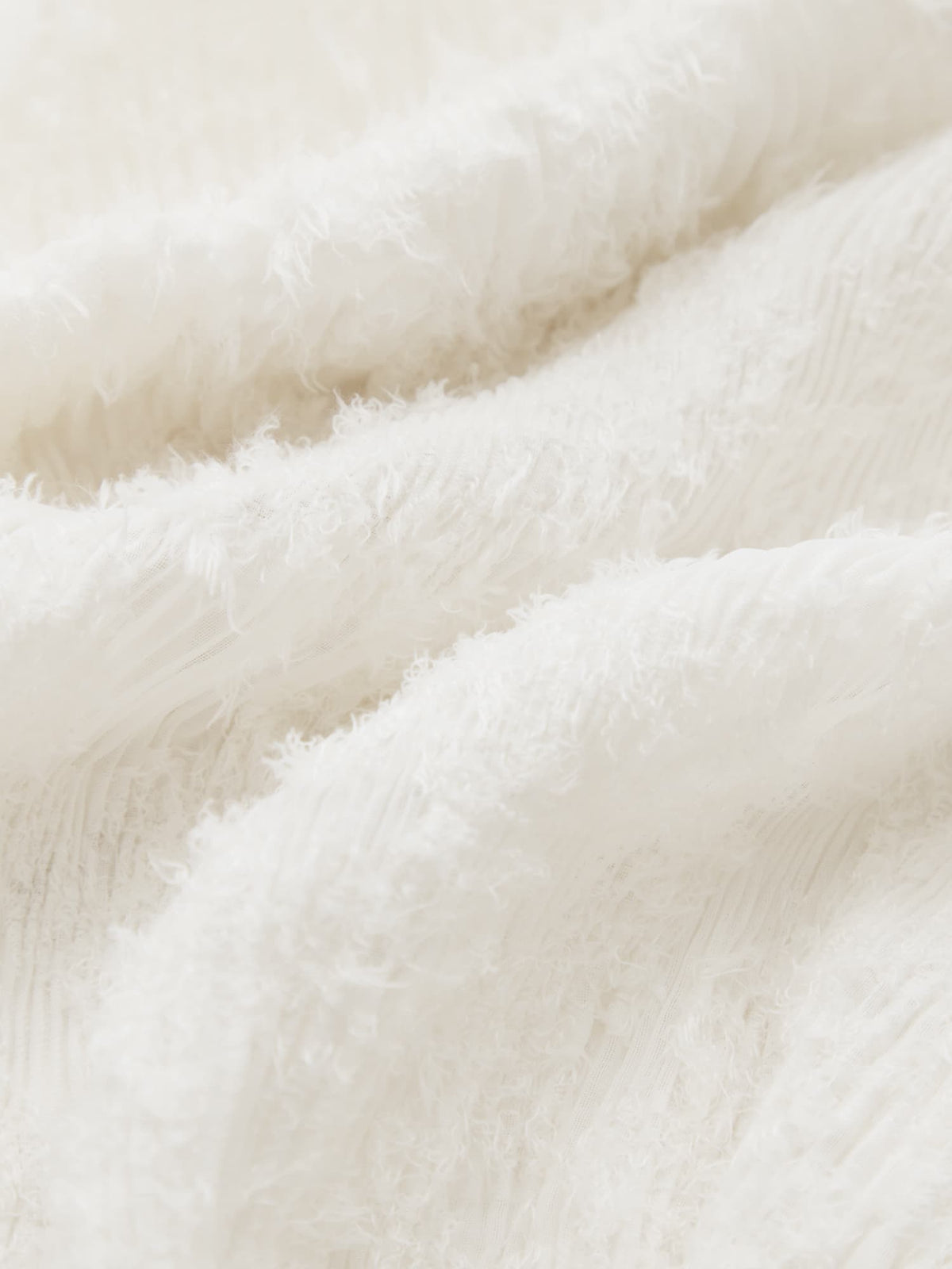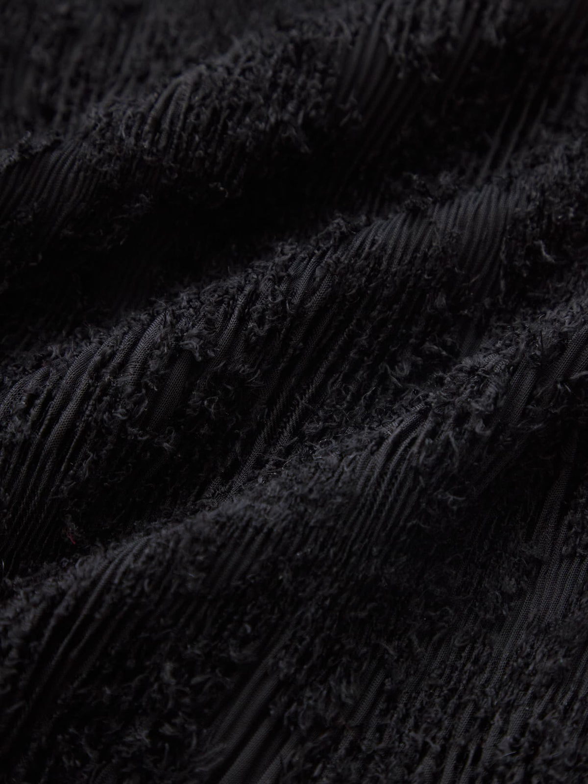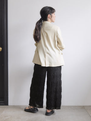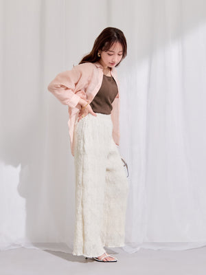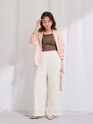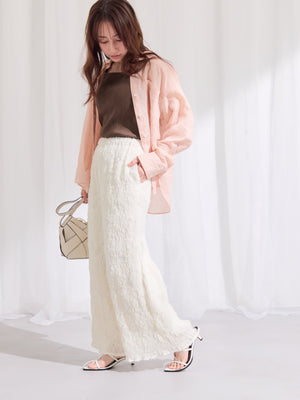 表面に立体感のあるシアージャカードにプリーツ加工を施した素材を使用。シアー感がありながらも透けすぎず、裏地付きのため安心して着用いただけます。
