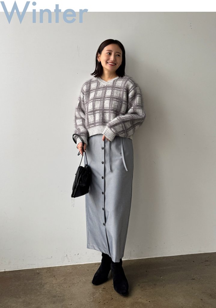 スカートの主役感を活かしながら、トップスと小物でバランスを整えた上級者コーデ。縦のラインを強調することで、スタイルアップ効果も抜群◎