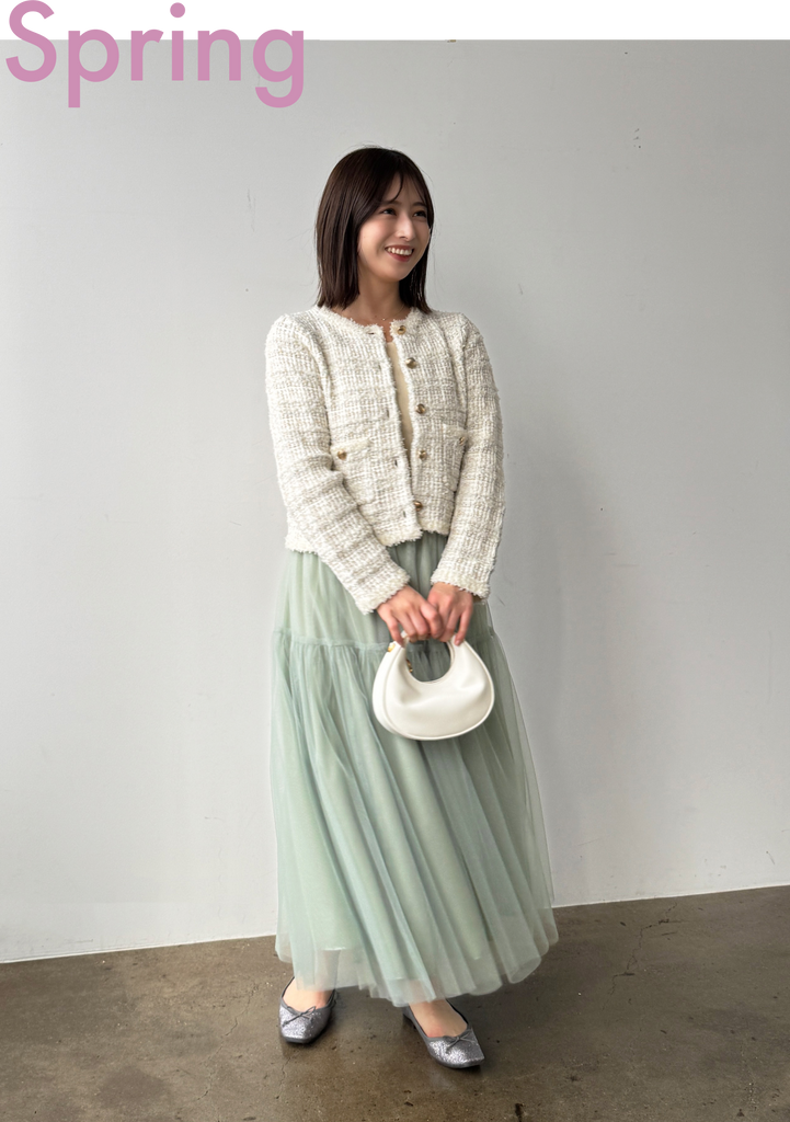 春の軽やかなスタイルには、アイボリーミックスのラメツイードカーディガンと揺れるチュールスカートのコンビネーションがぴったり。シンプルながらも洗練された雰囲気で、春のお出かけにもぴったりなスタイリングが完成♪