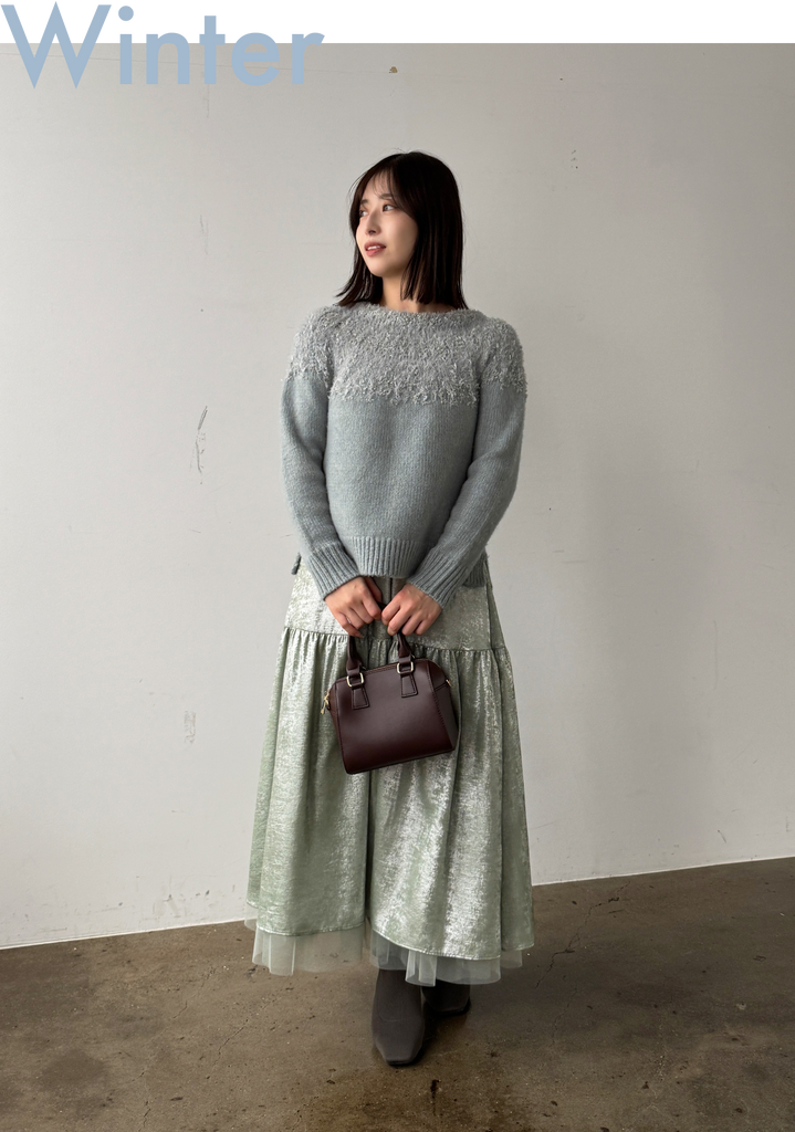 軽やかなミントカラーでまとめ、今シーズンのトレンドを感じさせるスタイルに。華やかなチュールスカートが揺れるたびにフェミニンでエレガントな印象を与え、柔らかなミントのニットが優しさをプラス◎
