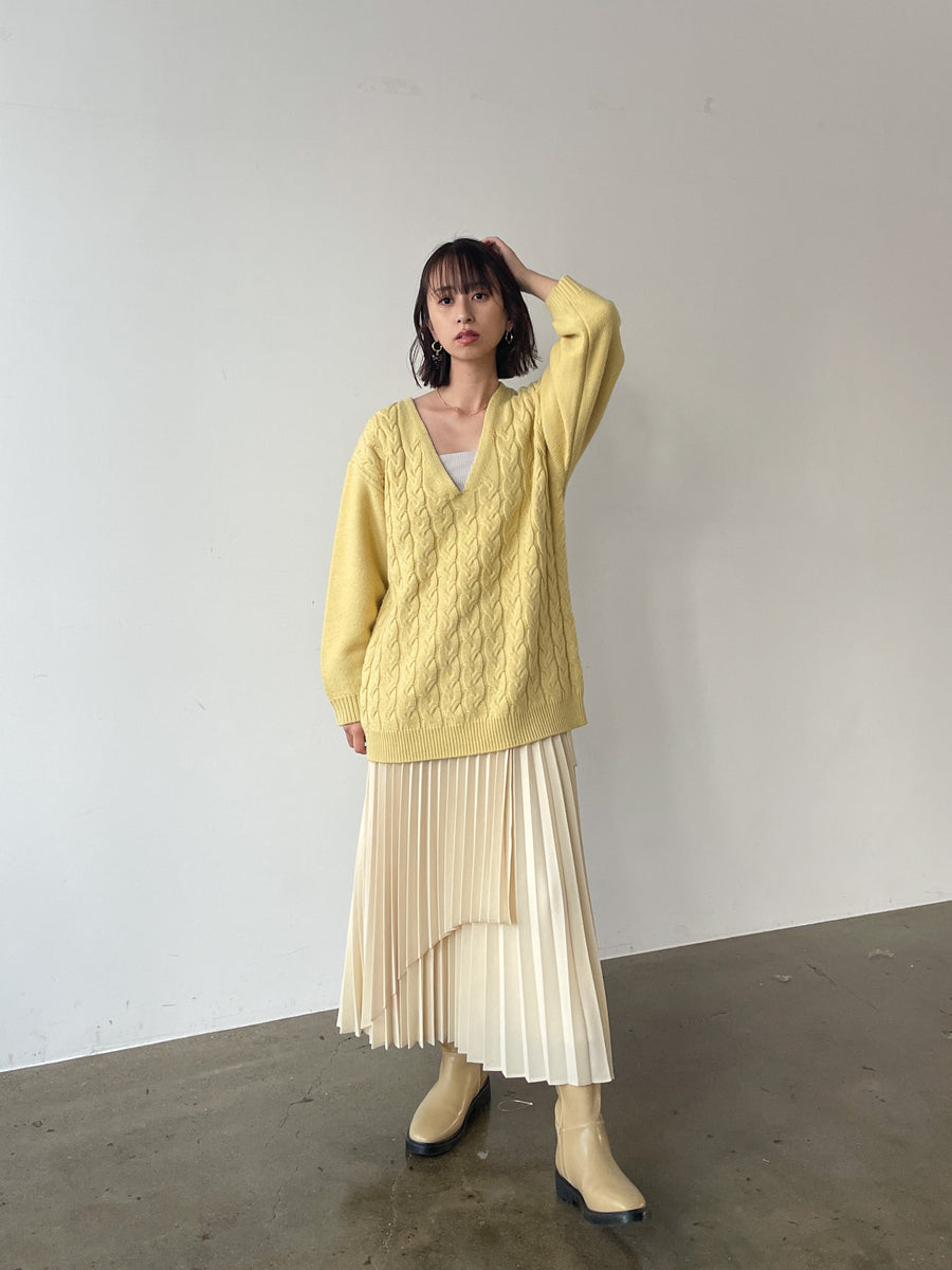 可愛らしい印象になりがちなケーブルニットを、大人の女性のワードローブに加えやすいアイテムにしました。