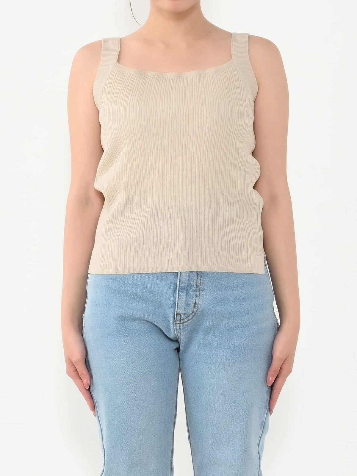タンクトップは、ストレッチ糸を一緒に編むことでほんのりシアー感を残しつつ、透けすぎないようにしています。