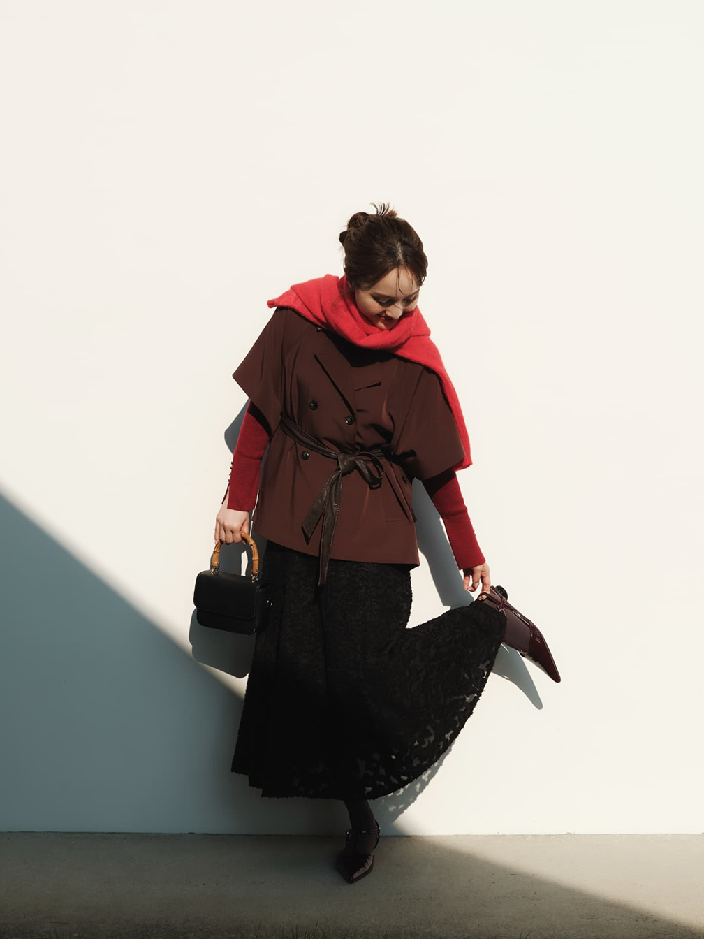 ケープの様に纏ったり、前を開けてジレの様に着こなしもサマになる1着。