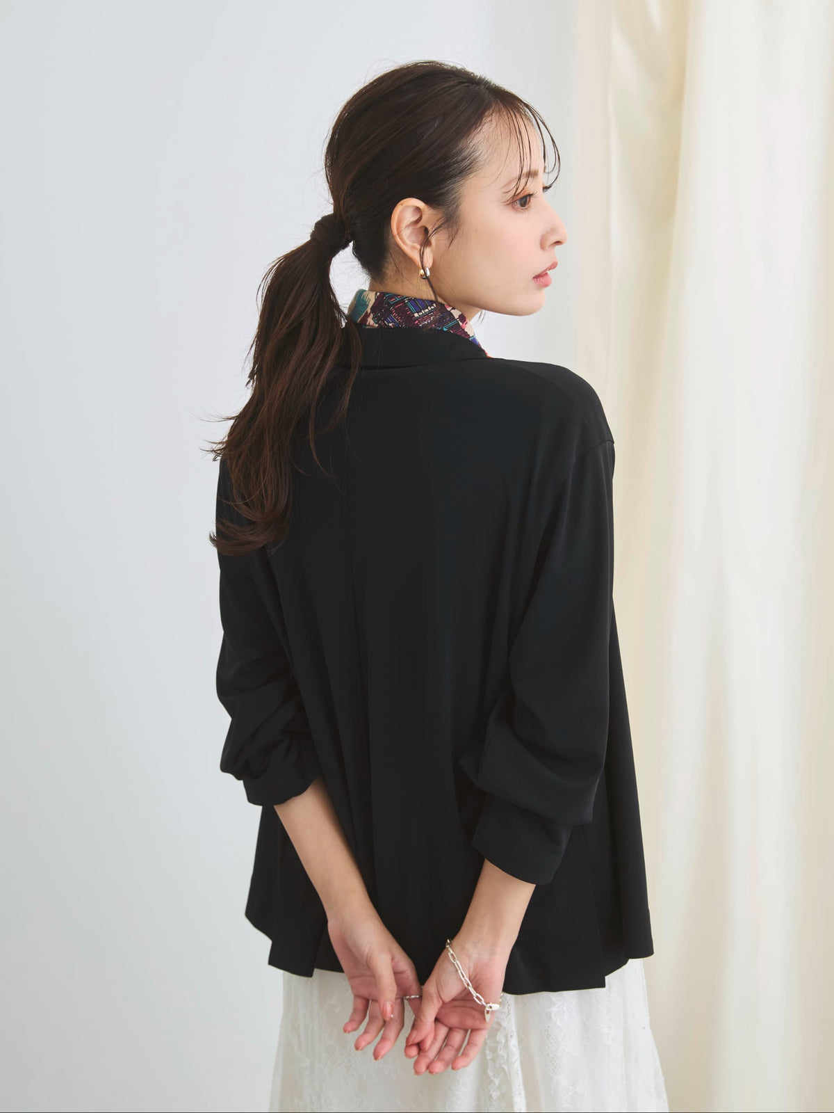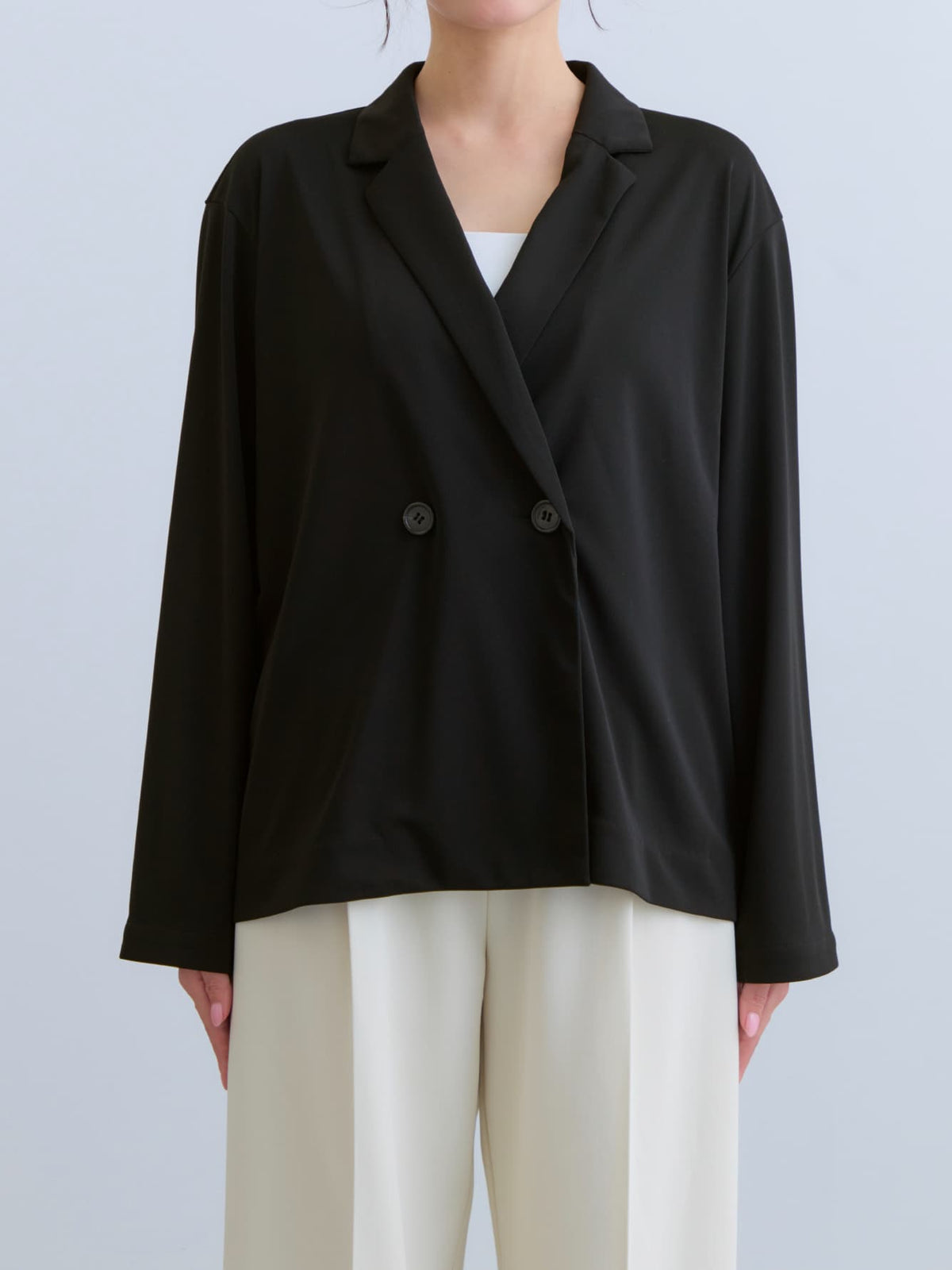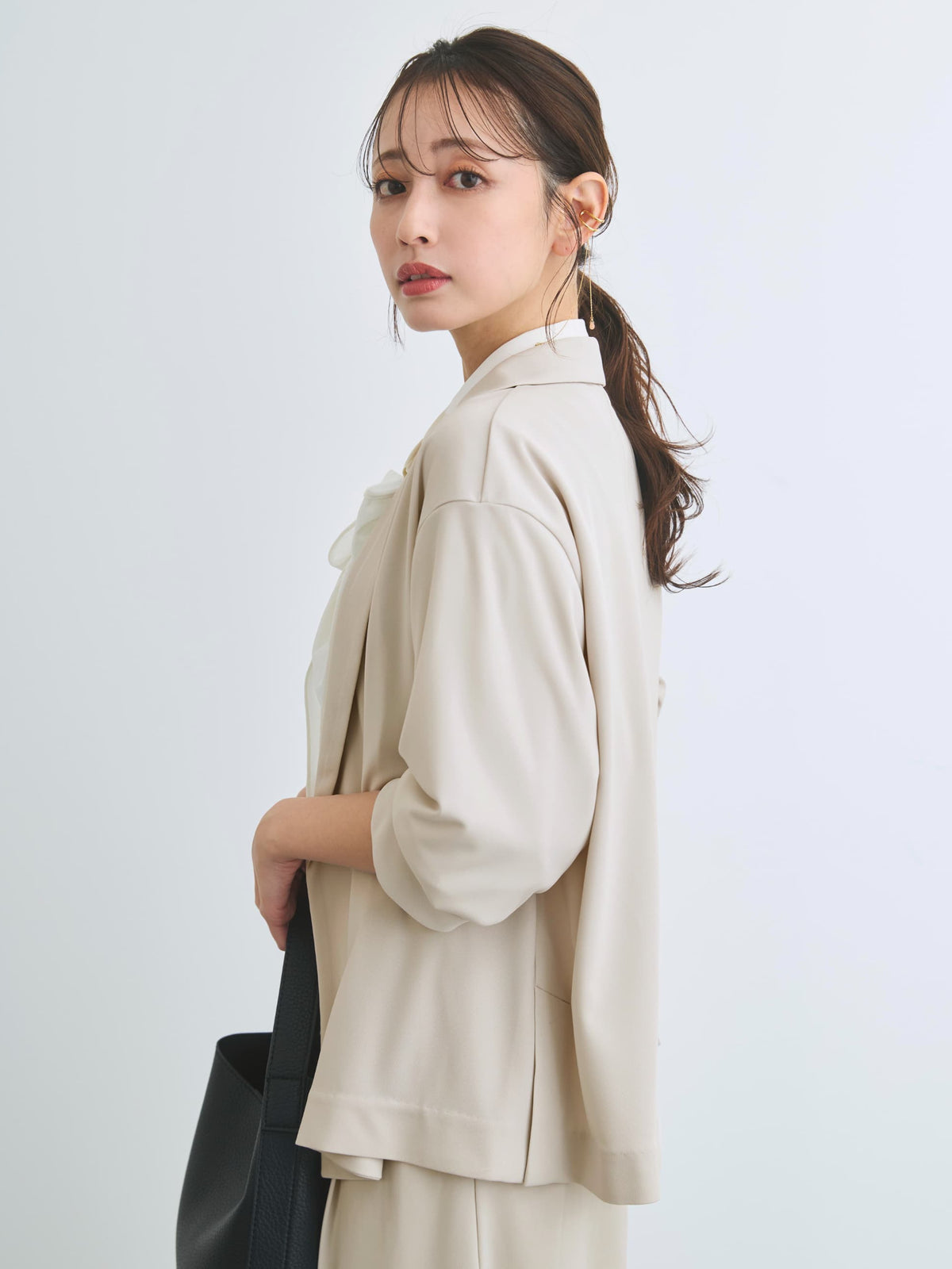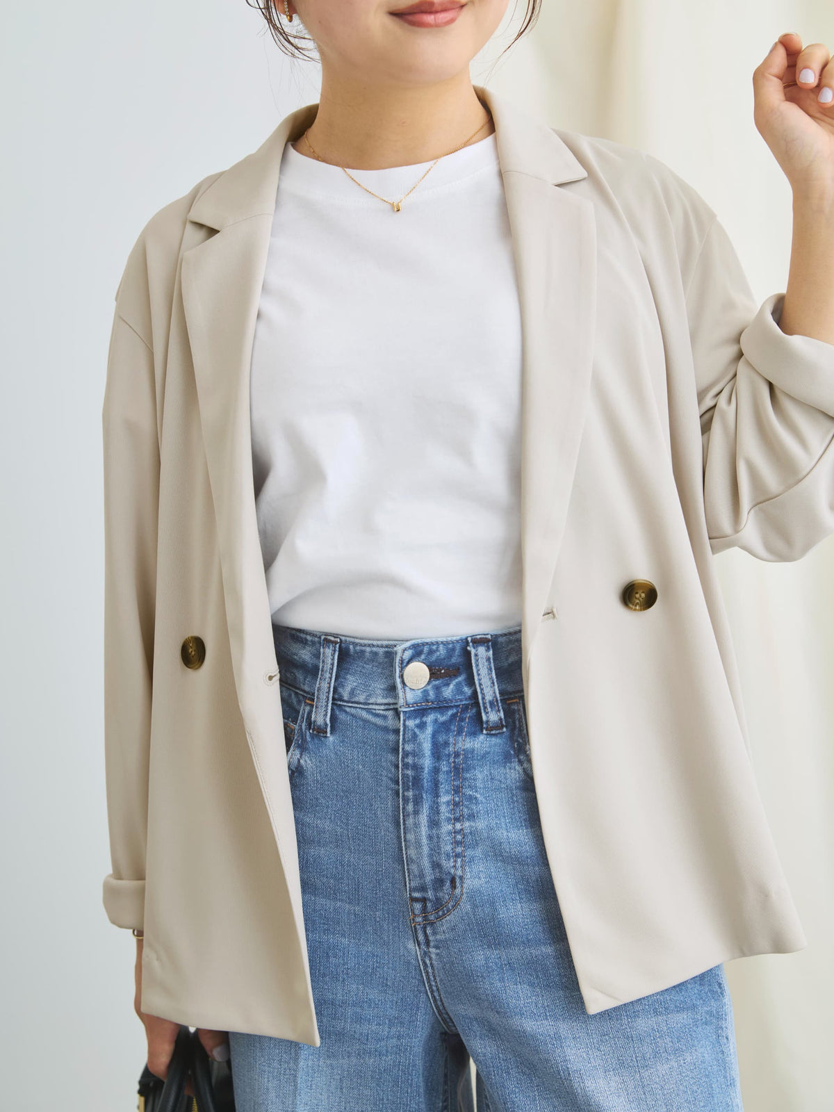 小柄さんに合わせて釦位置やラペルの幅を設計しているので、きちんと感がありながらも、カーディガンのように羽織れるラフさが魅力のアイテム。通勤シーンはもちろん、春夏シーズンから秋まで長く活躍してくれます。