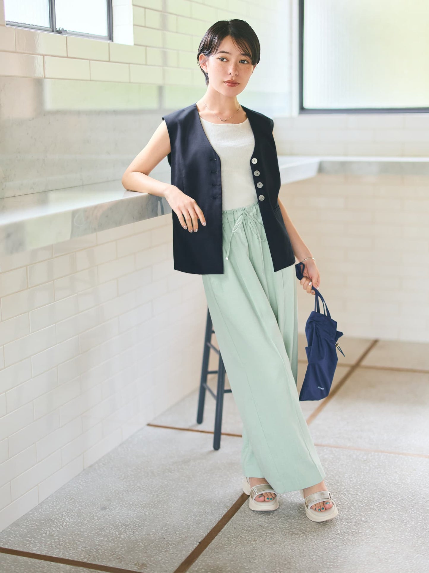 新色に一目惚れして購入しました!イージーパンツでセンタープレス?と思いきや消えないラインで、パジャマ感を出さずに着られます。リネンライクなので、表面はザラザラ感がありますが裏地付きなので何も問題なし。ただ、ウエストゴムとお腹周りは相当緩いです。COHINAのパンツはいろいろ持ってますが、過去一ゆったりしてるかもしれません。ワイドシルエットでボリュームが出ることも踏まえ、ウエスト絞って少し落として履こうとショート丈にしました。検討中でウエストが細い方、ジャストの位置から落としたくない方はご注意ください。