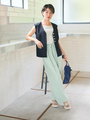 さらりとしたリネンライクな素材感が綺麗見えしつつ、イージーな履き心地も嬉しいワイドパンツが登場です!ウエストはALLゴム+ドロストで幅広い体型の方にノンストレスでご着用いただけます。