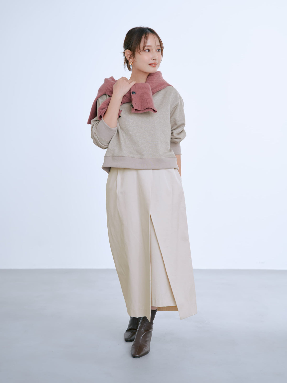 フロントのラップデザインがアクセントになってくれるので、シンプルなトップスを合わせるだけで大人カジュアルにほんのりモード感がプラスされたスタイリングに。綺麗めなトップスや甘めのブラウスと合わせて甘辛なスタイリングも◎サンダルからフラットシューズ、スニーカーなど足元の合わせも選びません。
