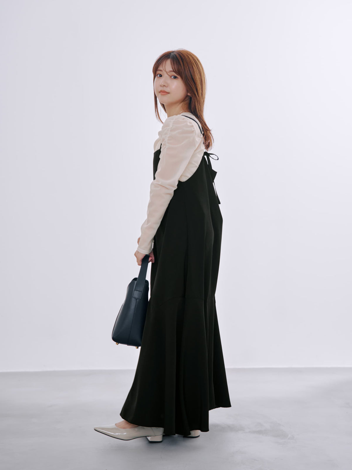 程よいツヤのあるとろみ素材のキャミワンピは、たっぷりとした裾まわりで歩くたびに揺れる足元が着映えします。