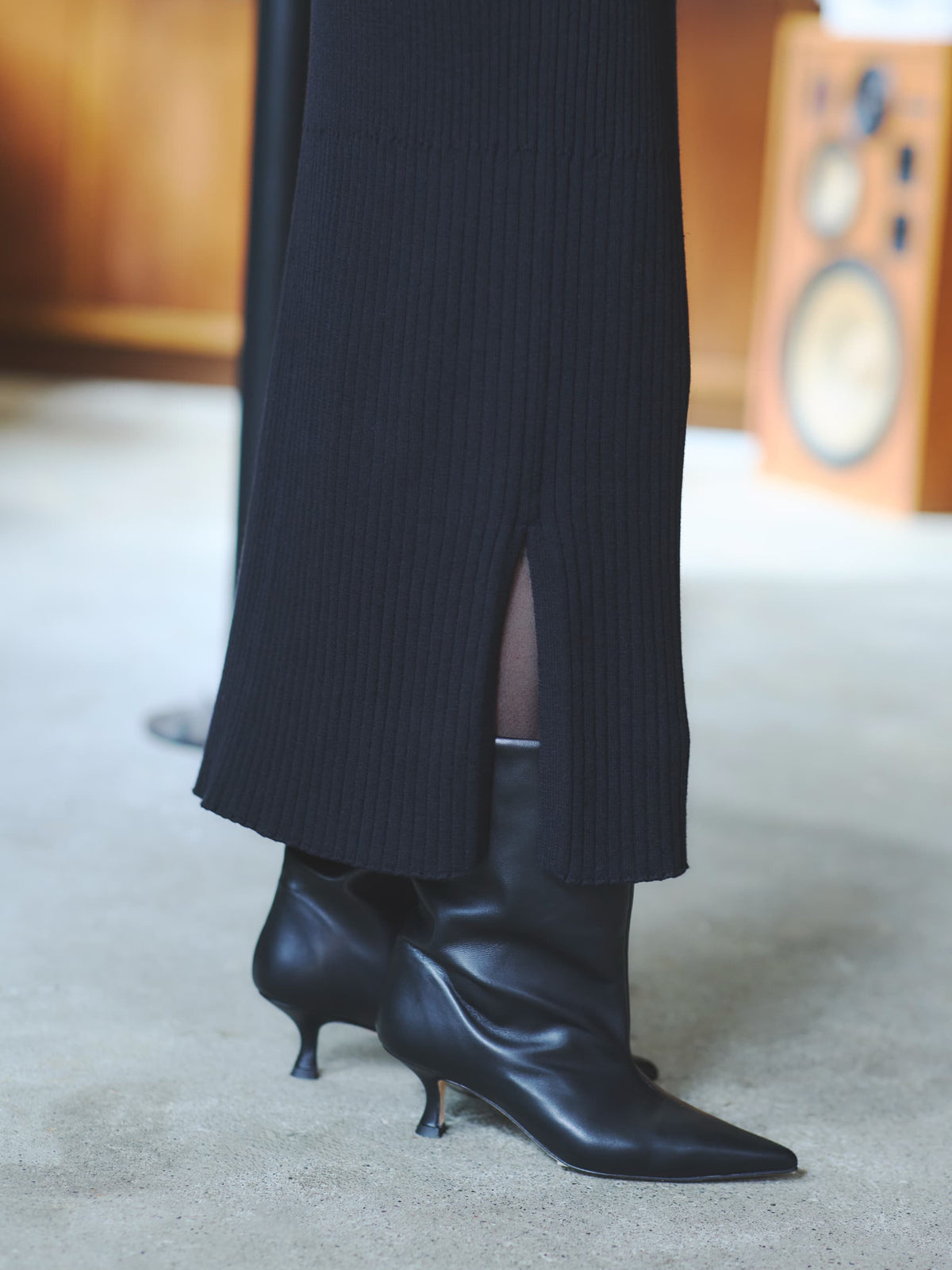 ウエスト周りを細かいリブピッチ、裾にかけてリブが太くなる設計にすることで、縦のラインを強調したデザイン。