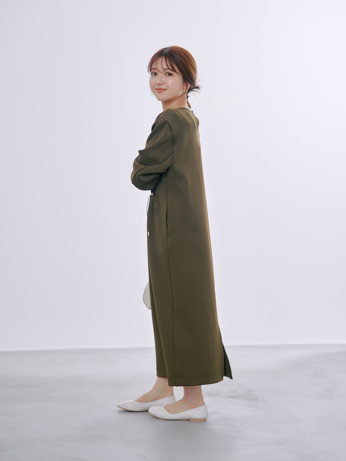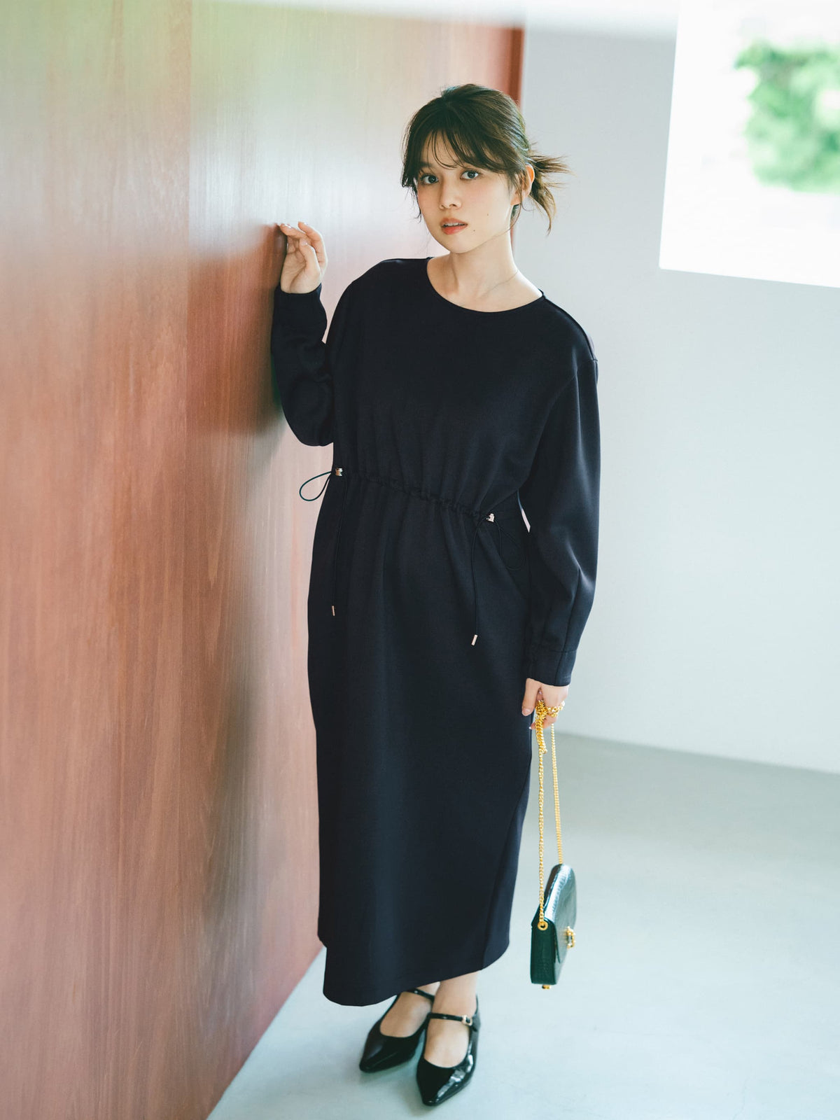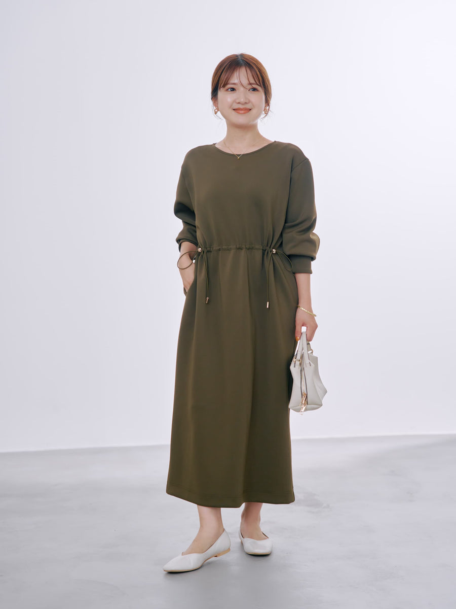 ウエストのドロストデザインがポイントのワンピース。ゆとりがあって体型カバーはもちろん、小柄さんをスタイルアップして見せてくれるのが嬉しいデザインです♡