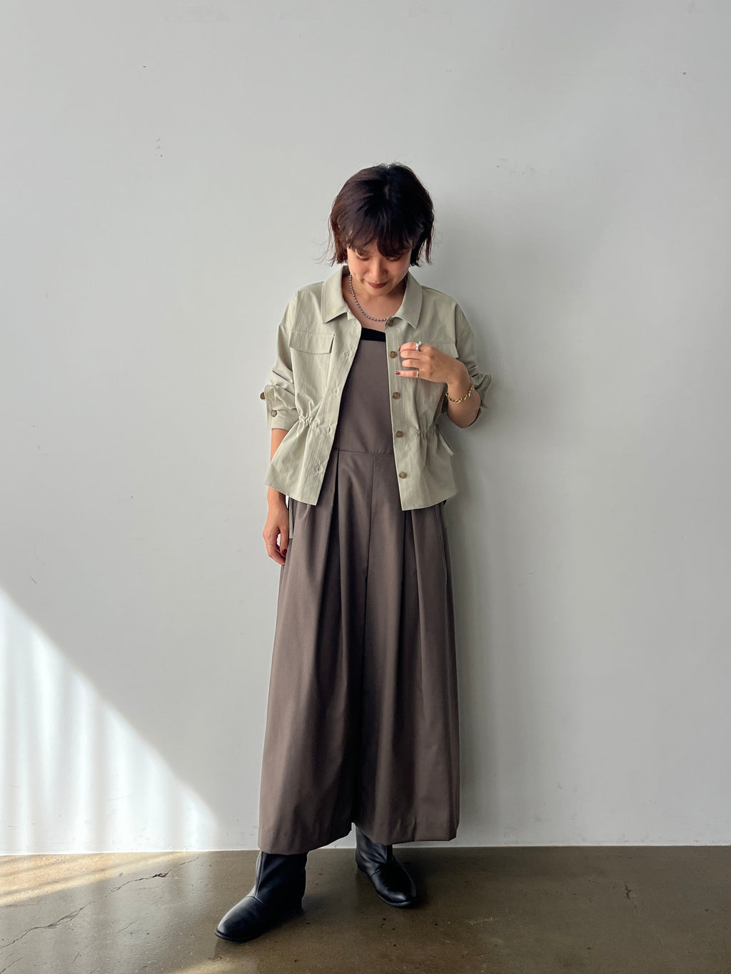ボトムを選ばないアイテムなので、さまざまなスタイリングにマッチします。