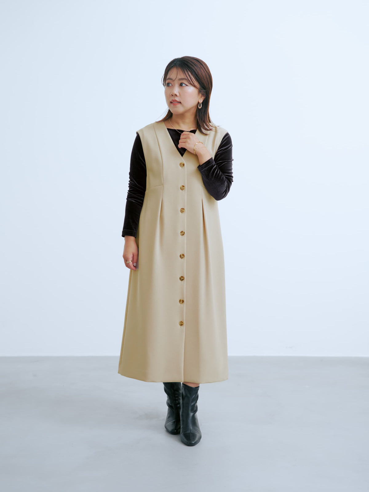 程よく光沢があり品のあるベロア素材を使用。 柔らかい印象のオフホワイト、トレンド感のあるブラウン、着痩せ効果のある定番ブラックのオリジナルカラー3色展開です。