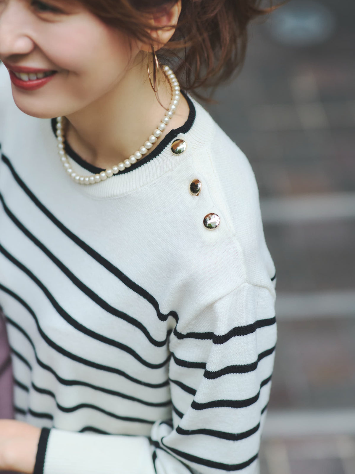 【首元のゴールドボタンがアクセントに!着心地抜群の大人見えボーダーニット】