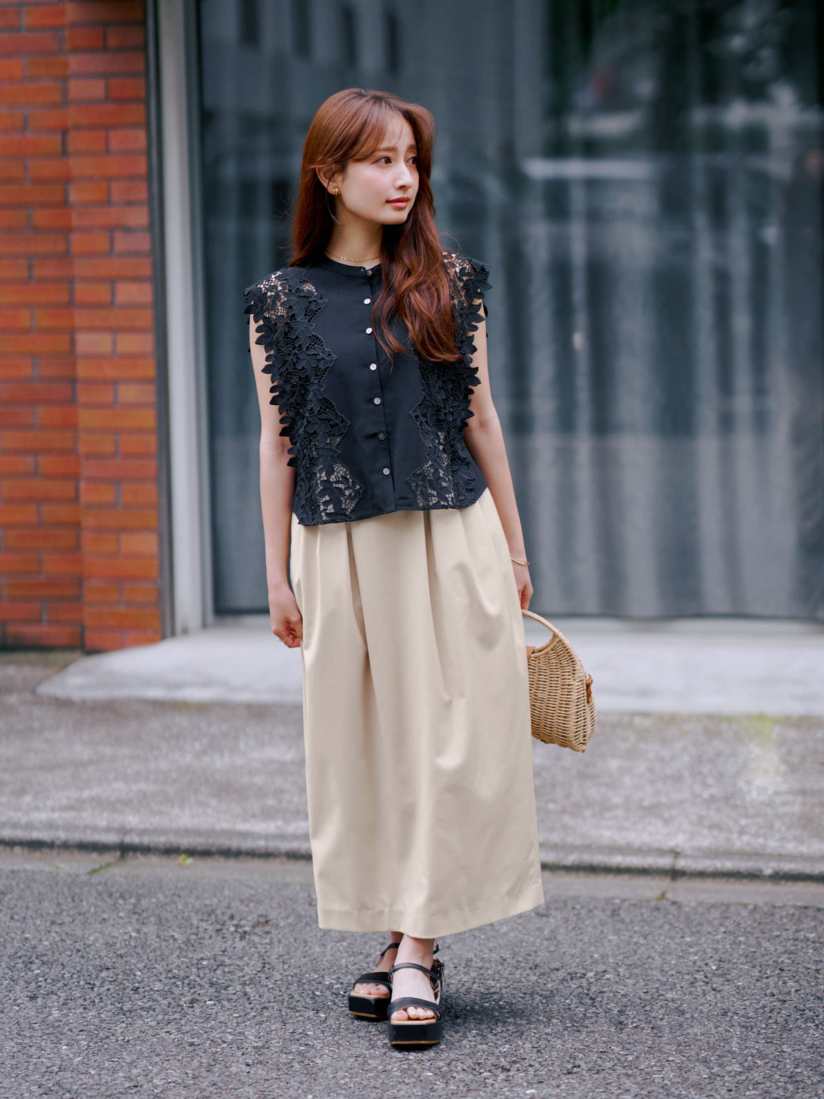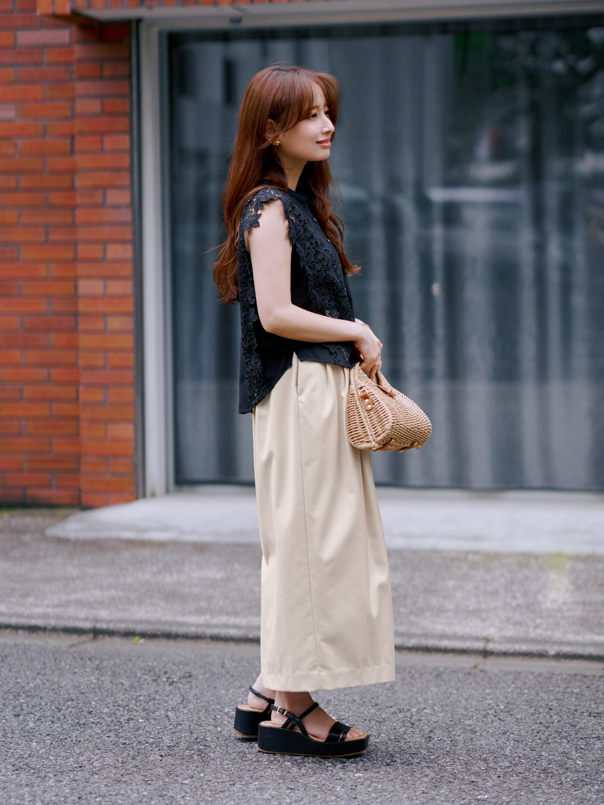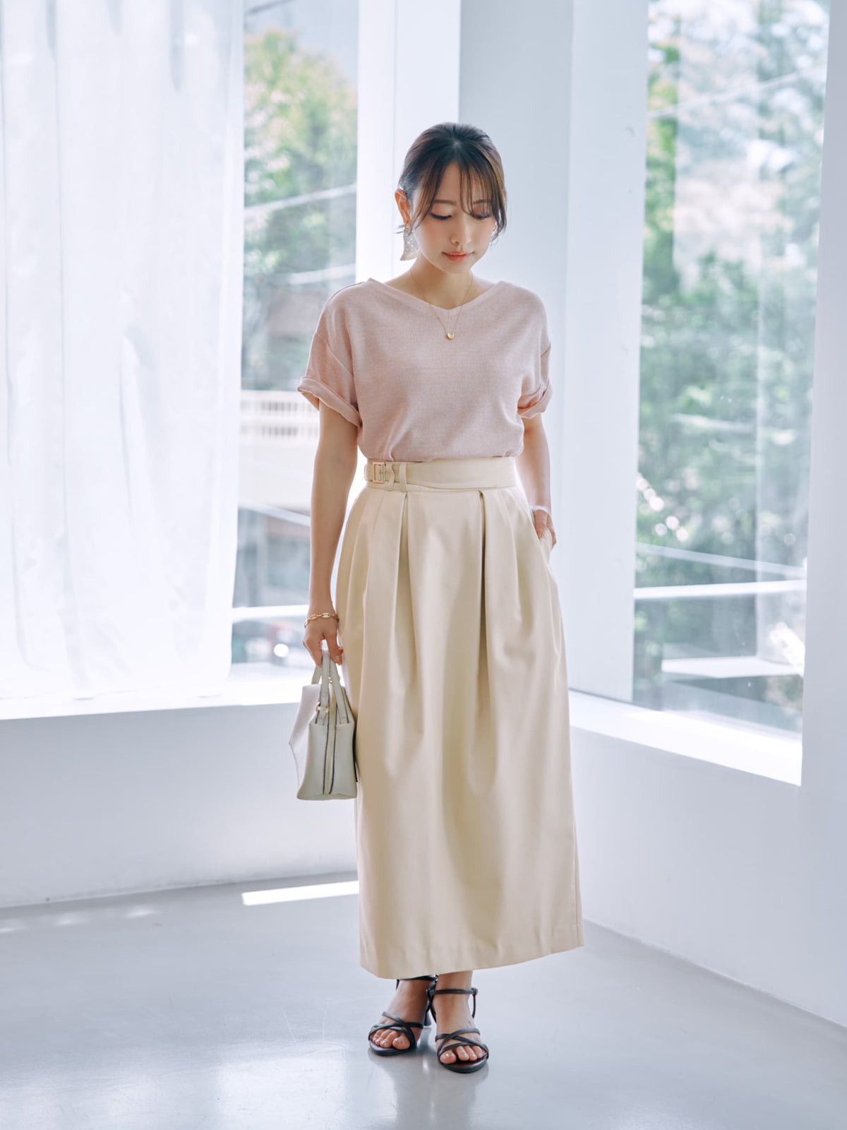 ハイウエストデザインをいかしたインスタイルはもちろん、ショート丈のニット合わせもおすすめ。ブラウス、カットソー、ニットなどさまざまなトップスと相性抜群でスタイリングの幅も広い1着です。