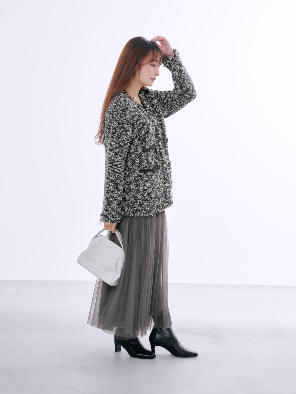 ふわふわのニットと相性抜群なスカート。コンパクトなニットをインしても◎