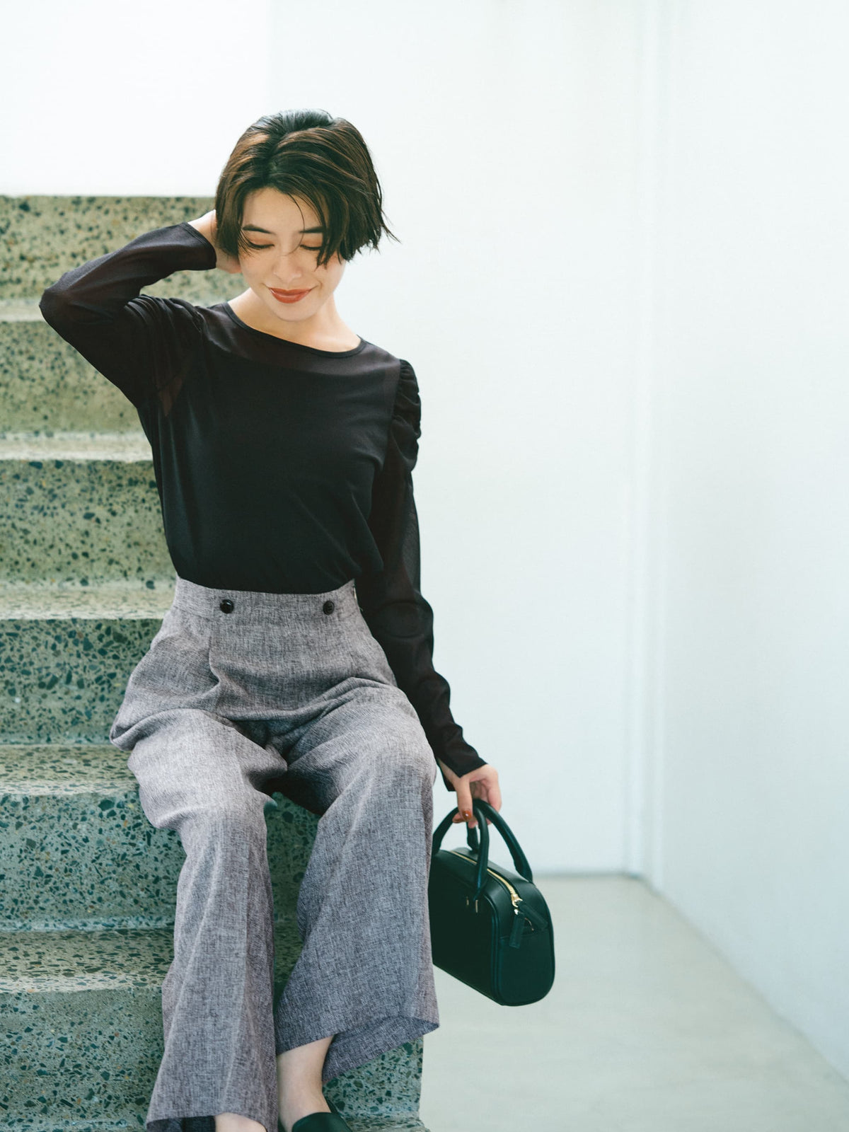 カラーはON /OFF兼用できる汎用性の高いグレージュとブラック。華やかさをプラスしてくれるグリーン。新色のブラウンでご用意しております。