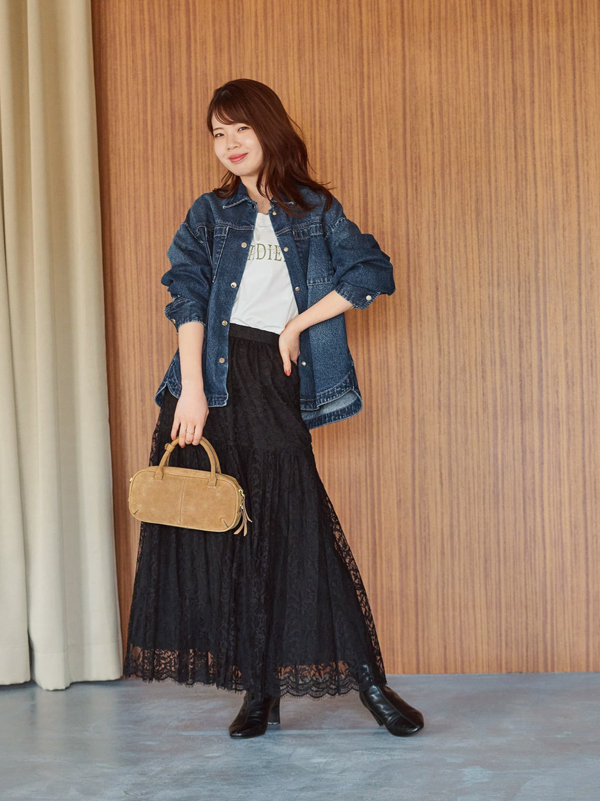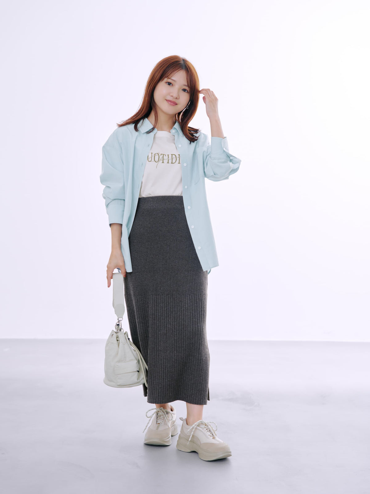 カジュアルなパンツスタイルから、フェミニンなスカートスタイルまで幅広いボトムと相性抜群です。