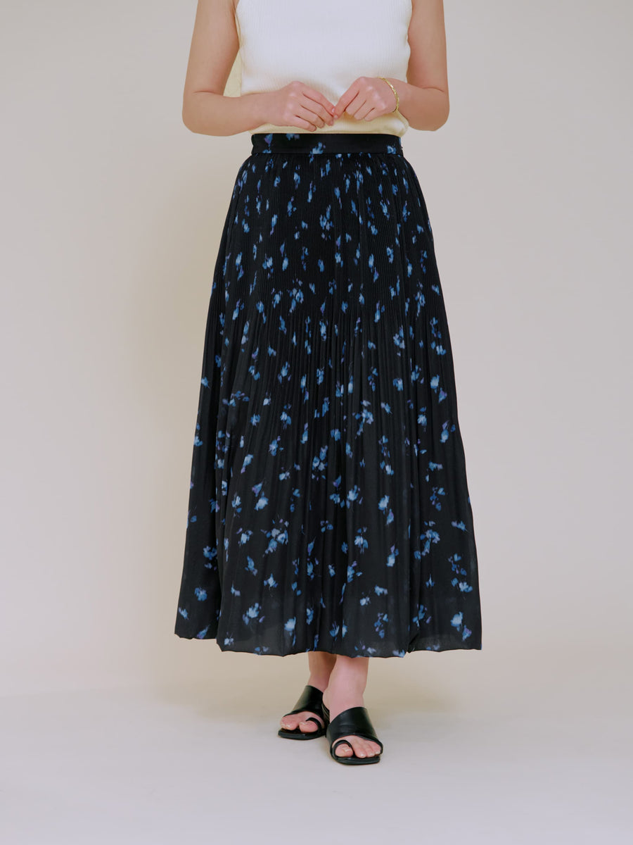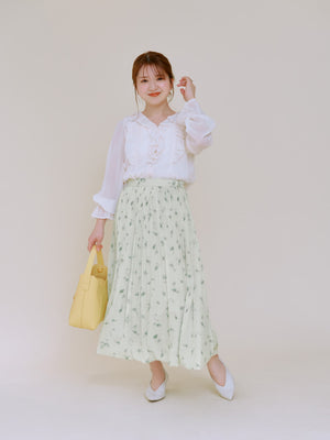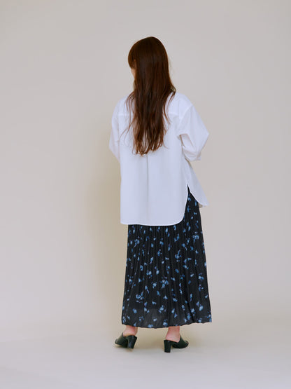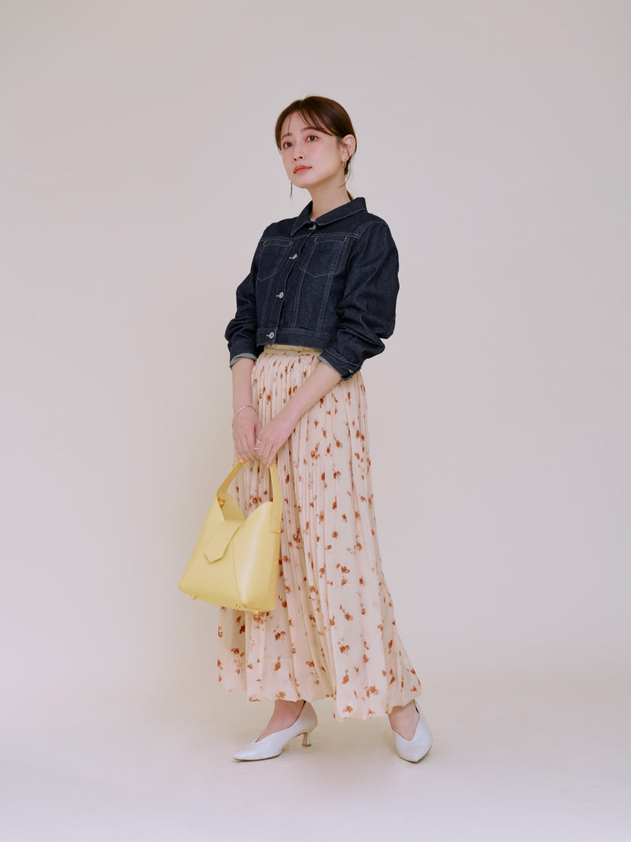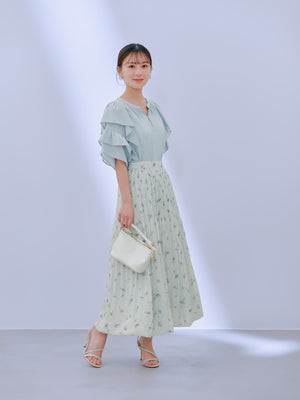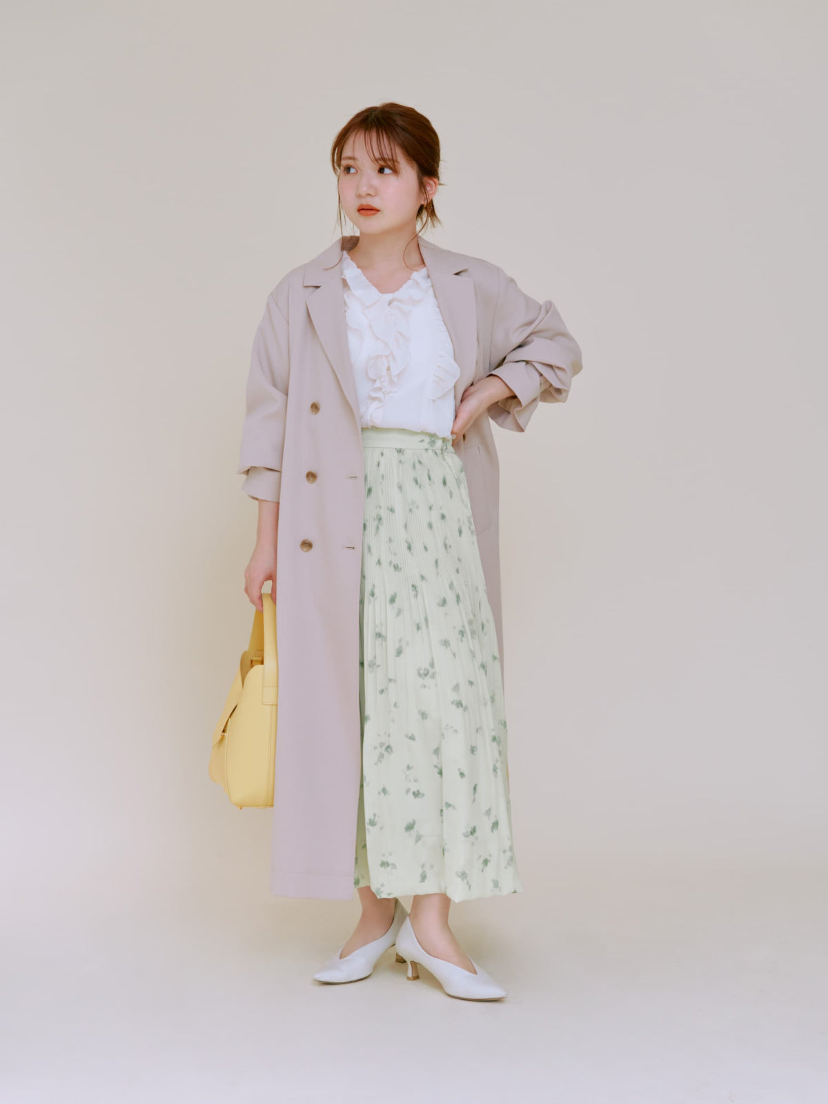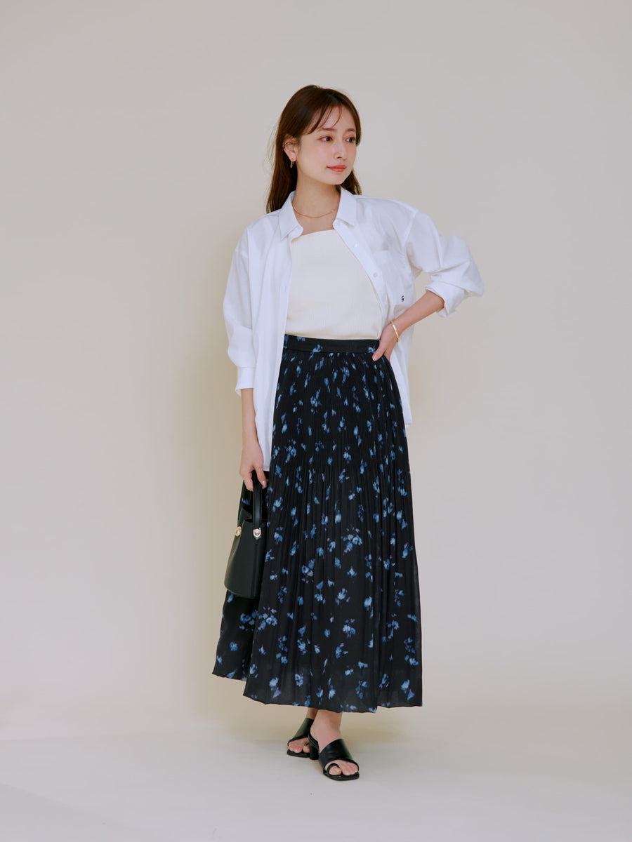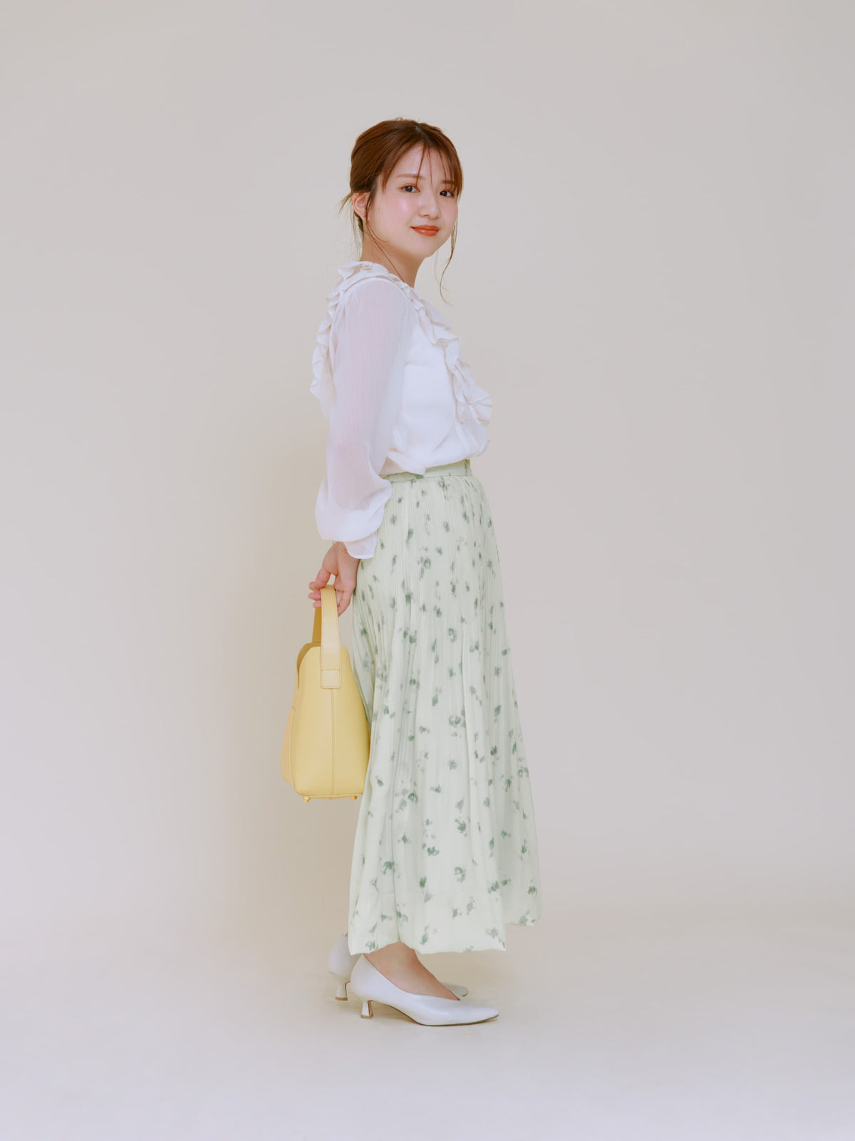 儚げなシャドーフラワープリントが上品な印象に仕上げてくれます。トレンド感のあるバルーンスカートを小柄さんに合わせた程良いボリュームに仕上げました。裾に向かってプリーツの幅を変えることでより動きのある表情に魅せてくれます。