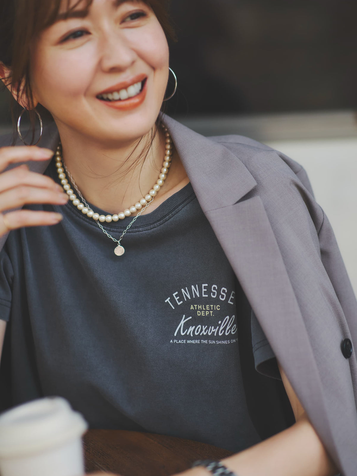 カレッジ風にオリジナルロゴを作成し、小柄さんに合わせて、サイズ感やロゴの位置などにも拘りました。ロゴの1番下にはCOHINAのブランドコンセプトである"あなたに陽が当たる場所"という文言が入っています。ピグメント加工を施したヴィンテージ感のある加工感が魅力で、コンパクトすぎず、大きすぎない程よいシルエットに。それぞれロゴの配色にも拘り、さりげない差し色がポイントになったロゴTシャツです。