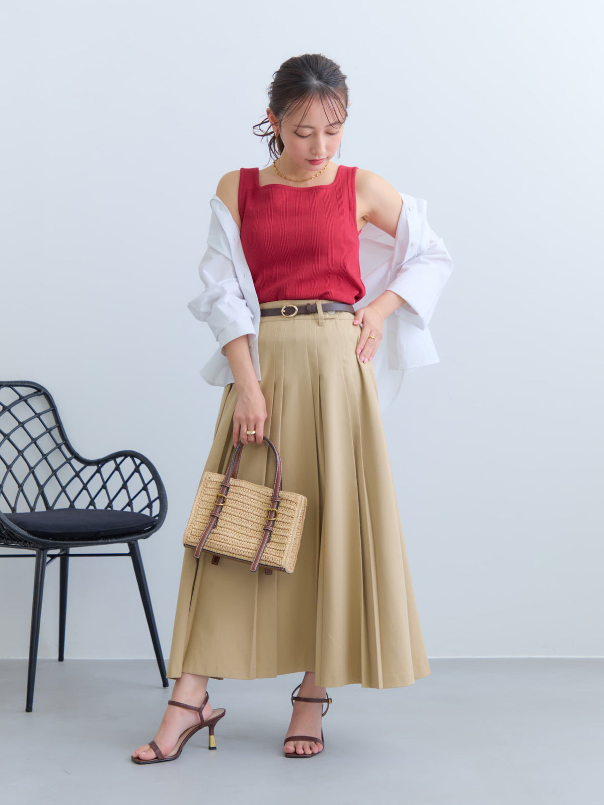 程よいハリ感のある素材で、シルエットをキープしつつ、動くたびに軽やかな印象を演出。ベーシックなオフホワイト・ベージュはオン/オフ問わず着回しが広がります。テラコッタはコーデのアクセントにぴったりなカラーです。