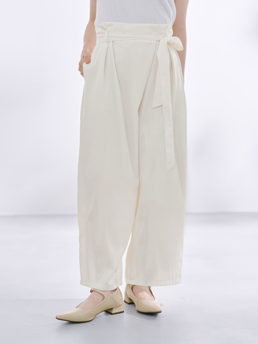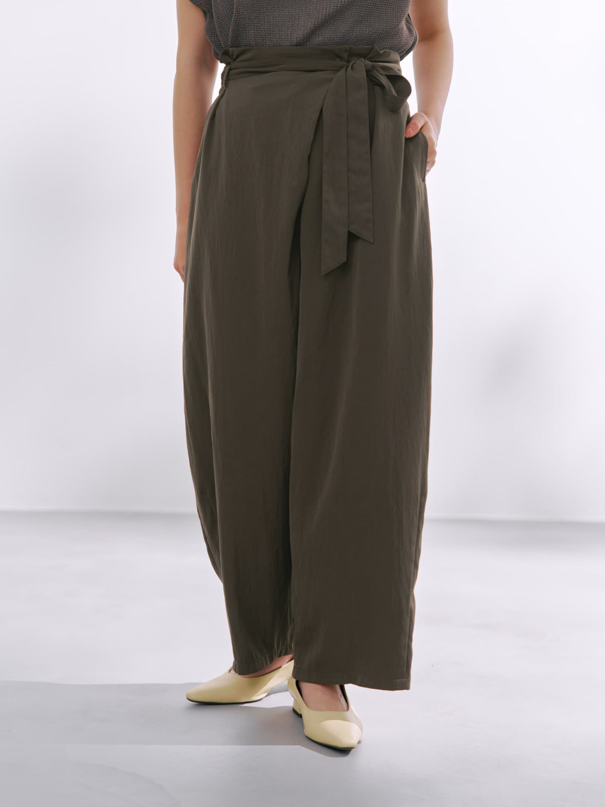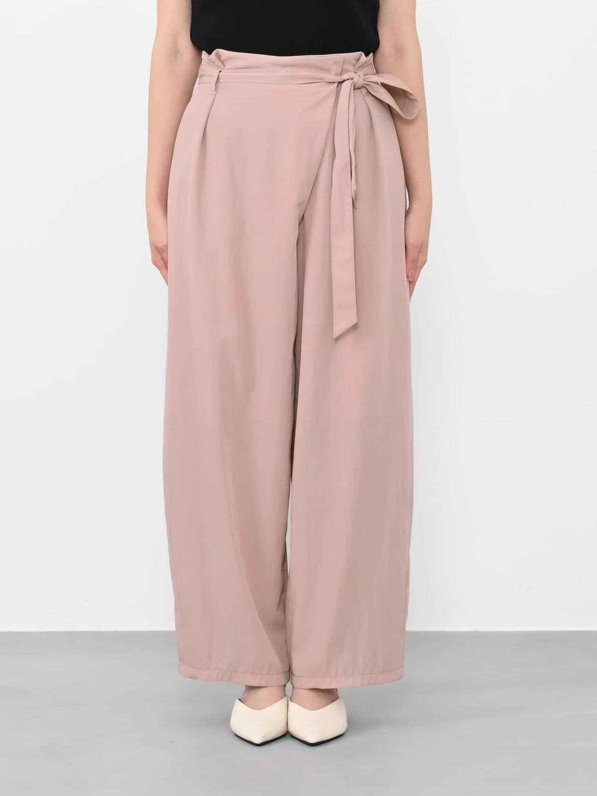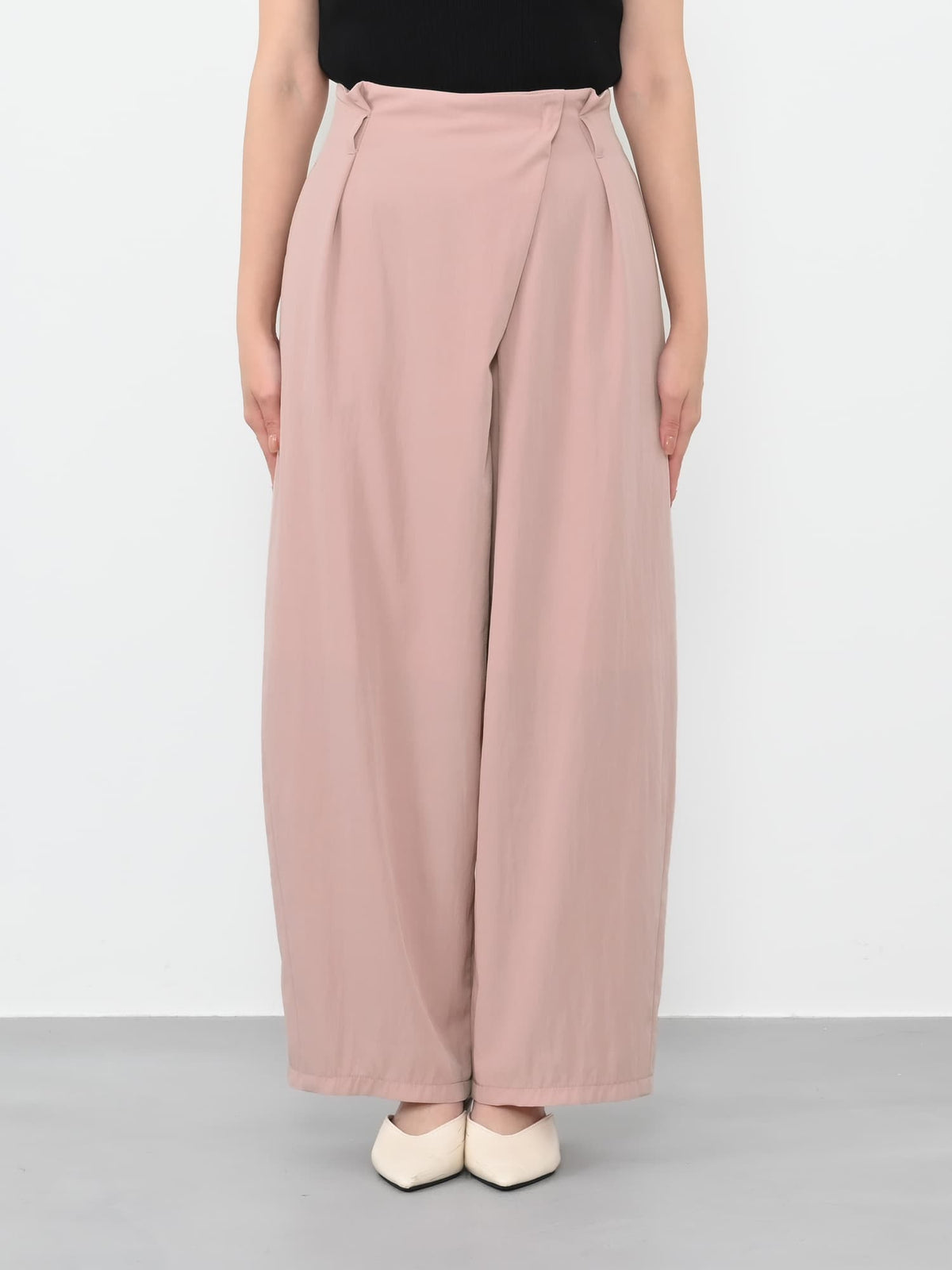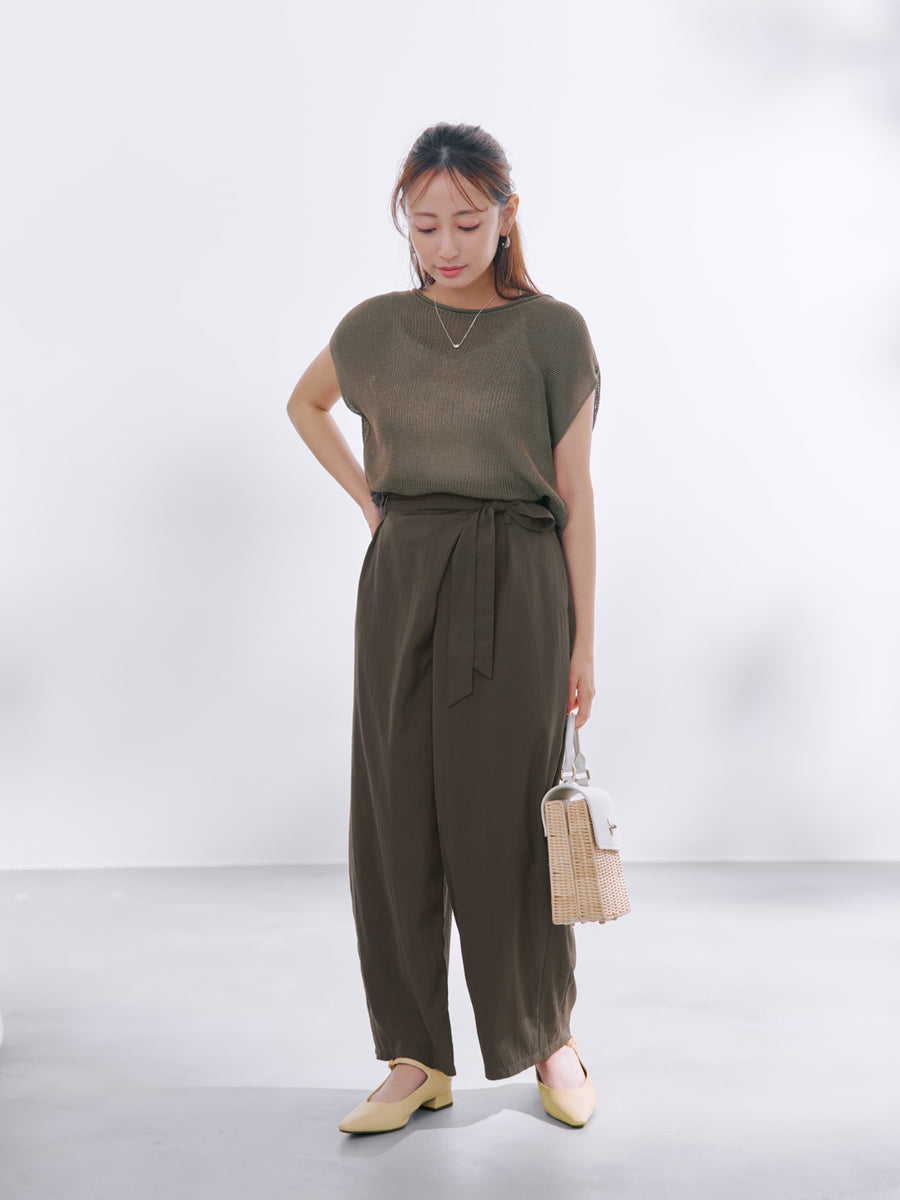 フロント部分がラップデザインのカーヴィーパンツ。着心地は、とても楽なのに1枚でサマになり、シンプルなトップスを合わせるだけでコーディネートが完成します。