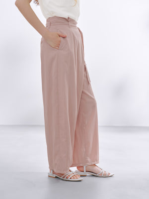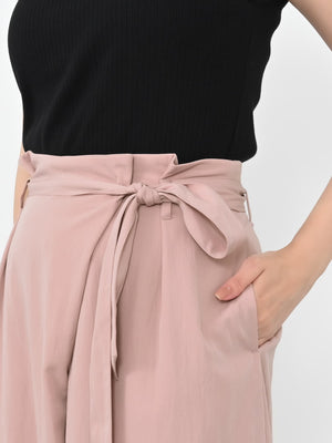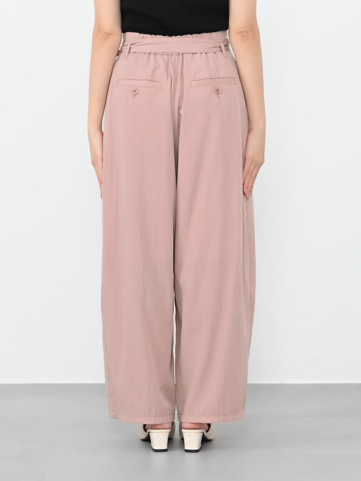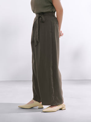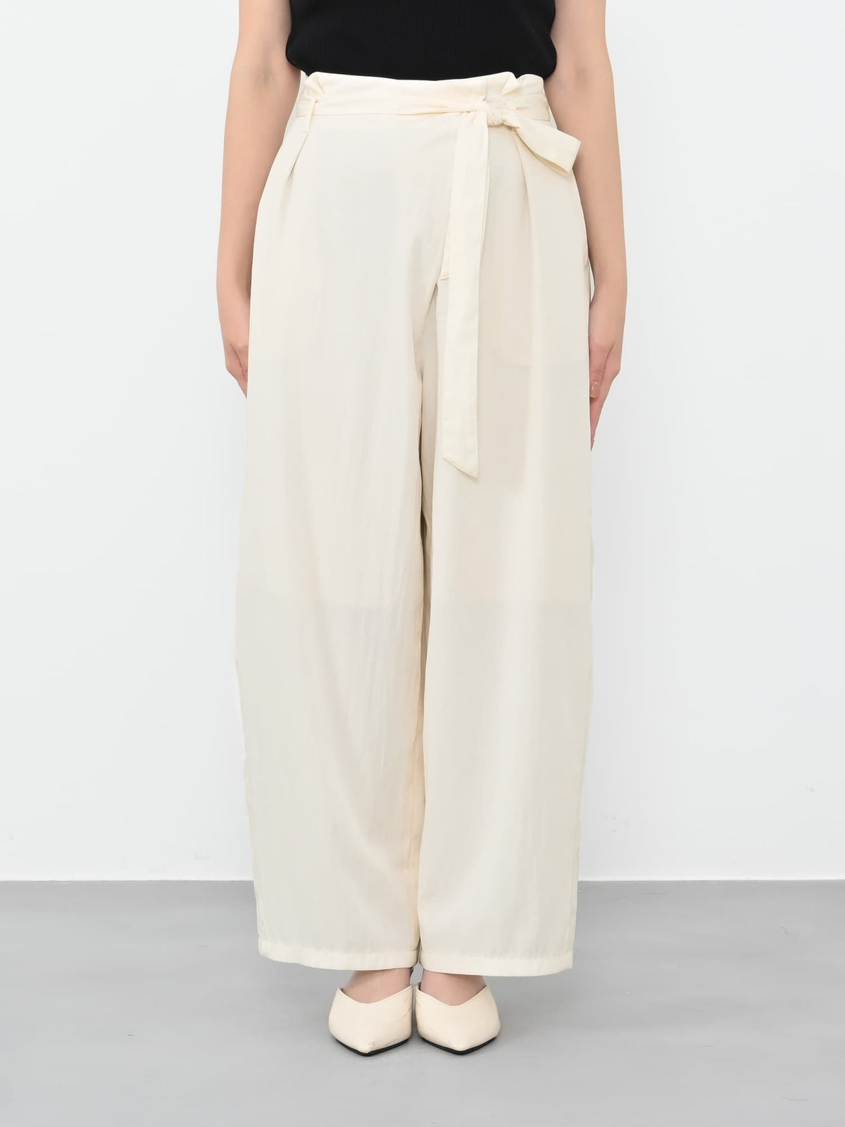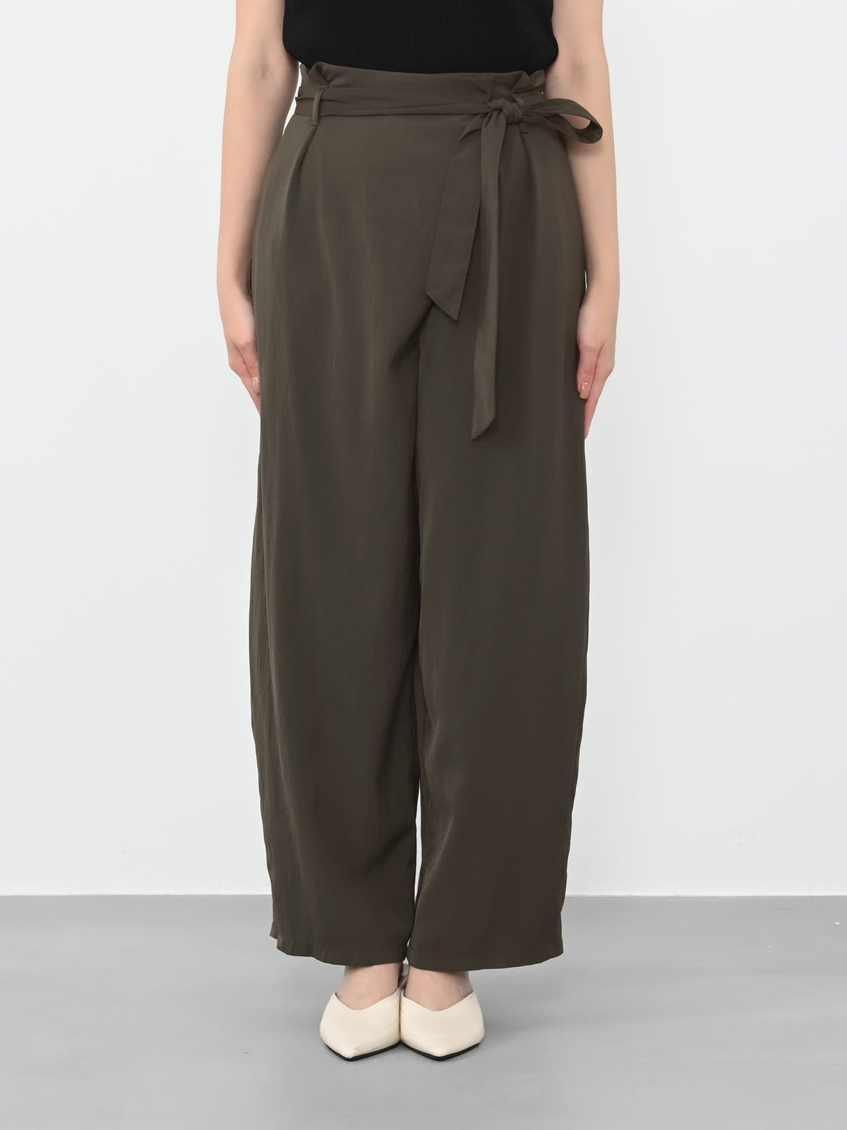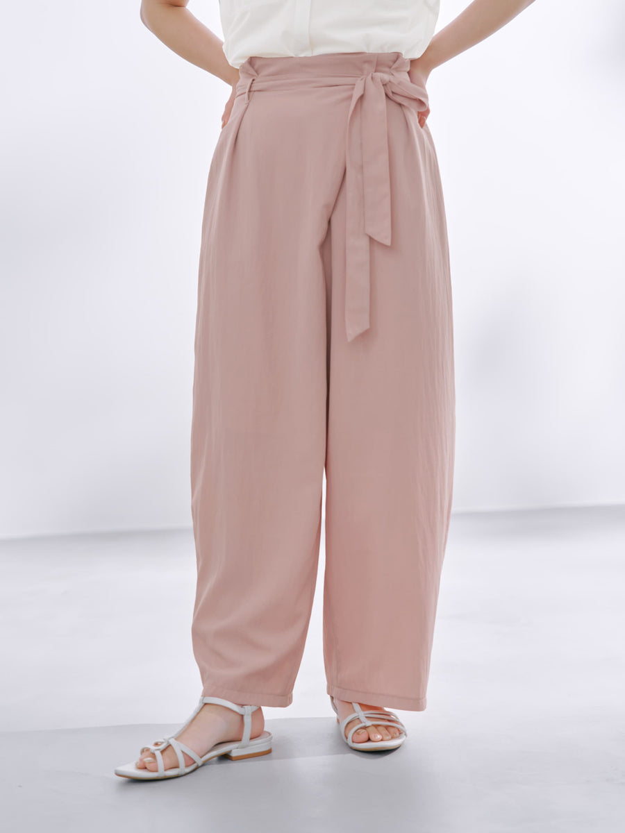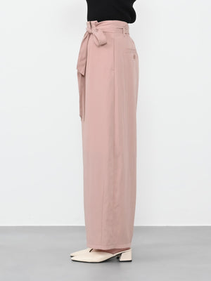 フロント部分がラップデザインのカーヴィーパンツ。着心地は、とても楽なのに1枚でサマになり、シンプルなトップスを合わせるだけでコーディネートが完成します。