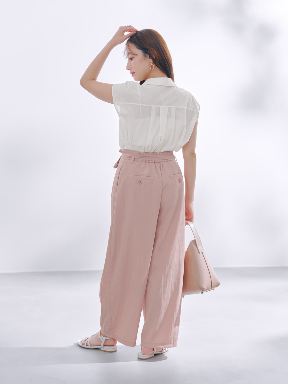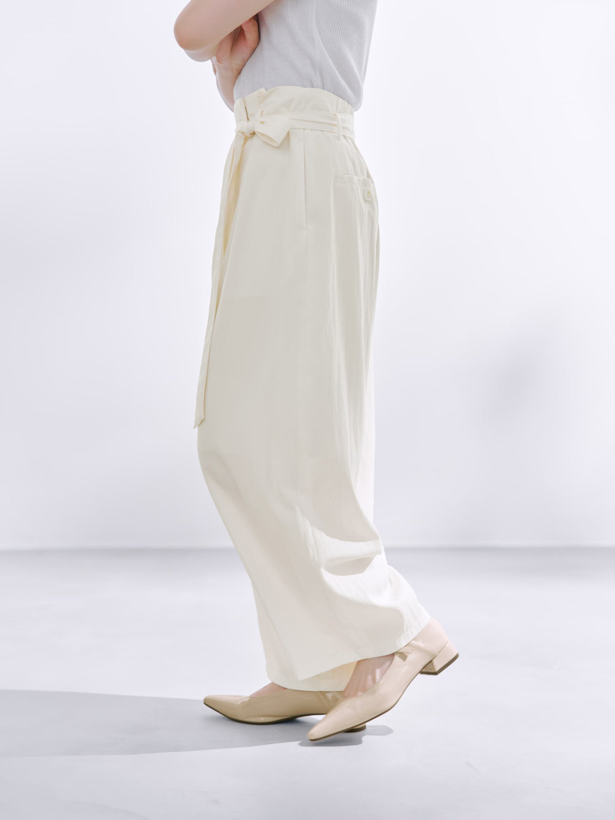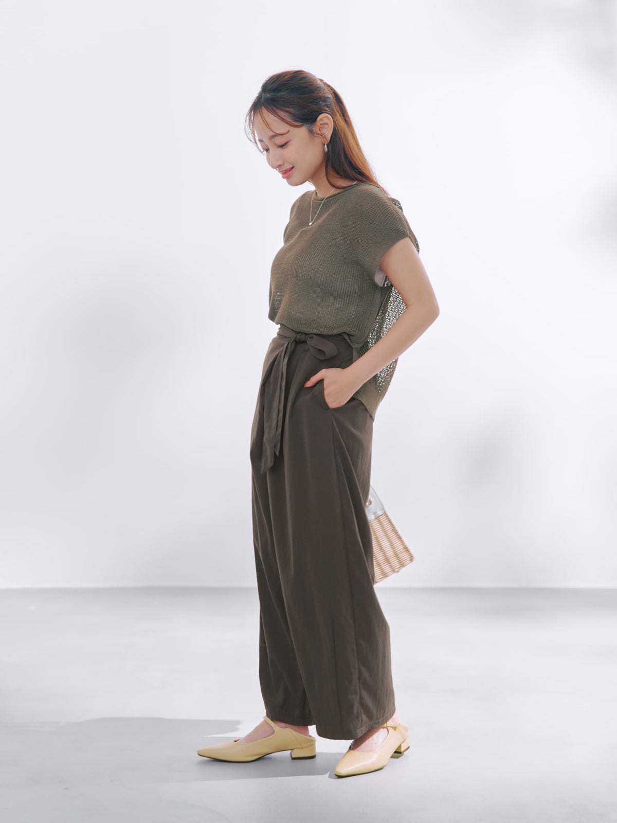 小柄さんに合わせたほんのりカーブシルエットも今期らしいムードを高めてくれます。生地と身体の間に風をはらんだようなゆとりのあるサイジングが脚のラインをカバーしてくれます。