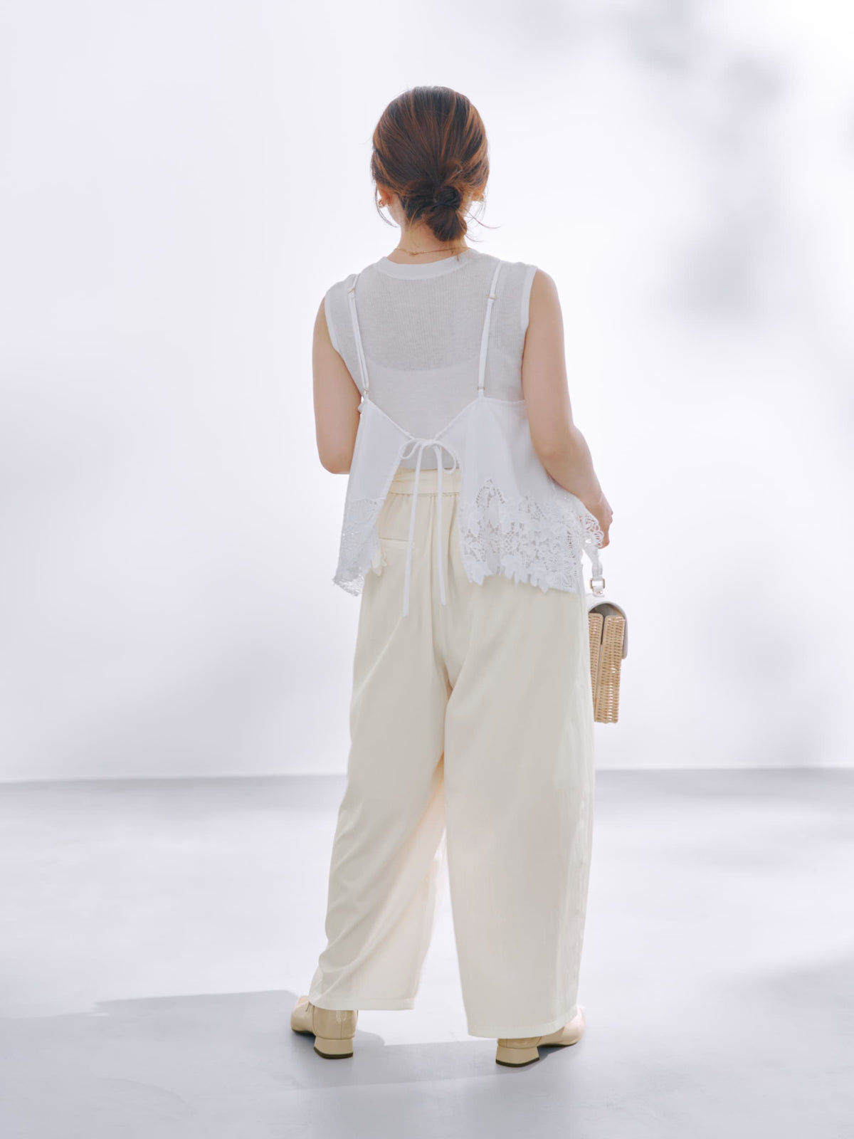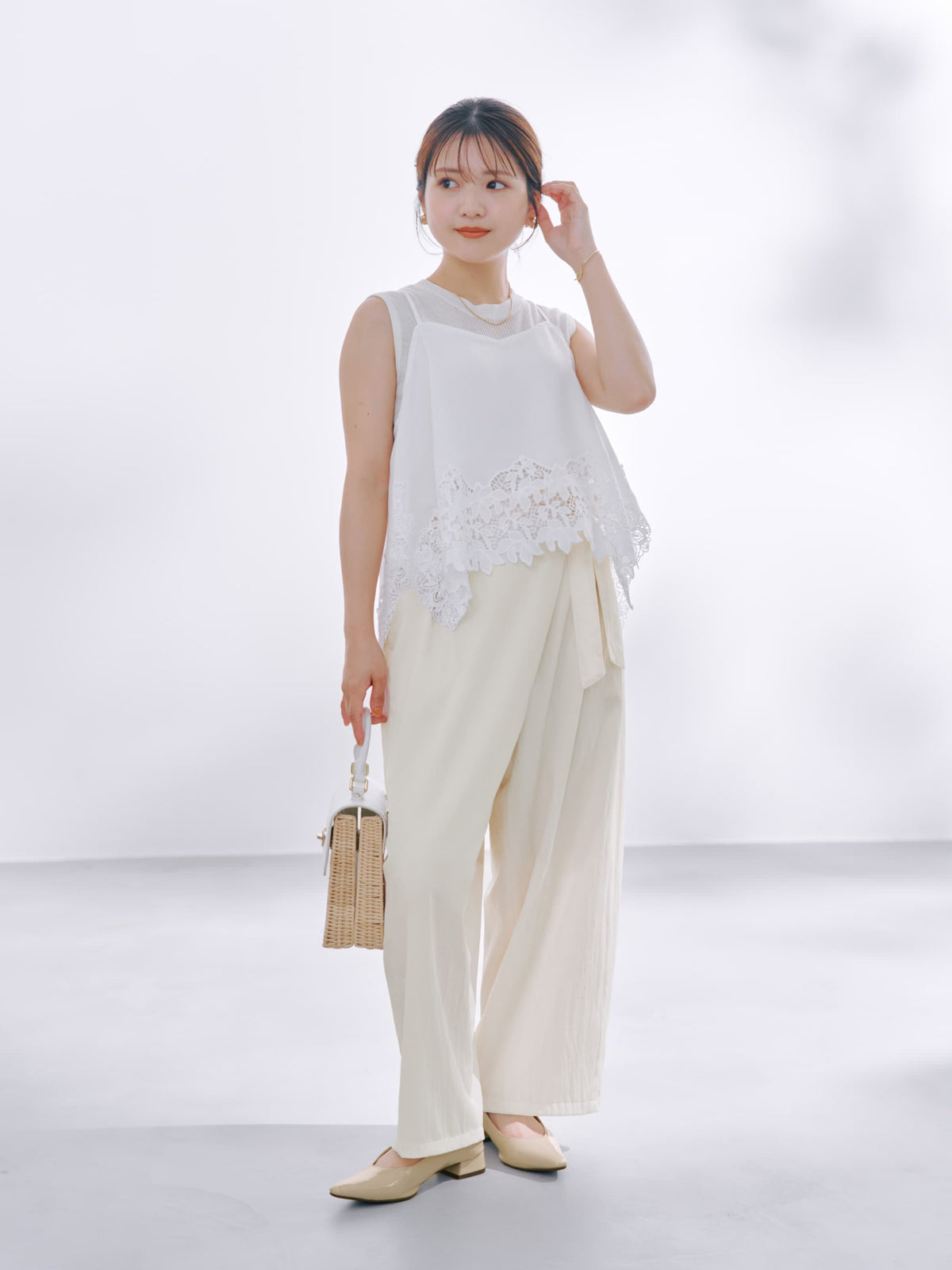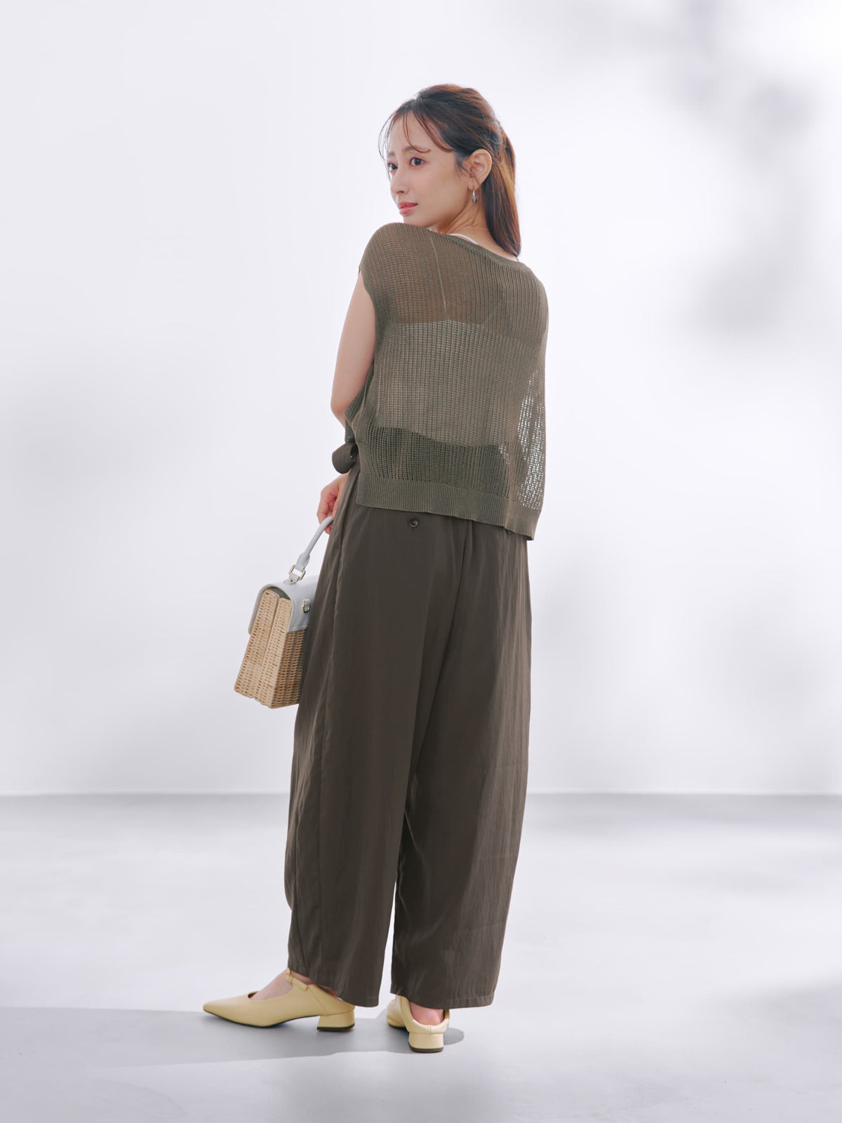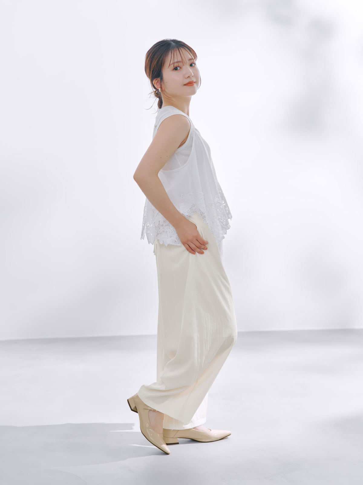 小柄さんに合わせたほんのりカーブシルエットも今期らしいムードを高めてくれます。生地と身体の間に風をはらんだようなゆとりのあるサイジングが脚のラインをカバーしてくれます。