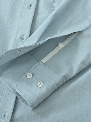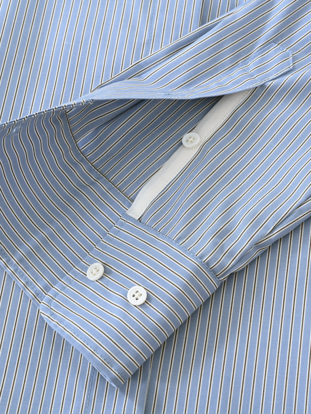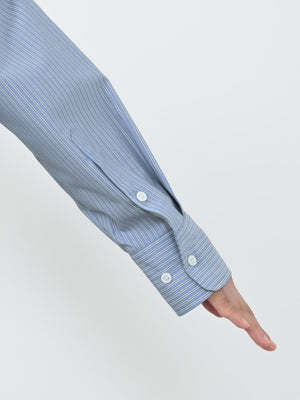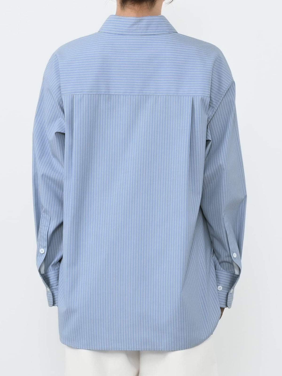 袖口はボタン調整が可能で、袖口の開き部分が配色パイピングになっているので、腕をまくった時にもさりげないポイントに。襟を開いた時の適度なボタン位置の設定や程よい抜け感のあるシルエットが魅力で、きれいめスタイリングにもぴったりな万能アイテムです。
