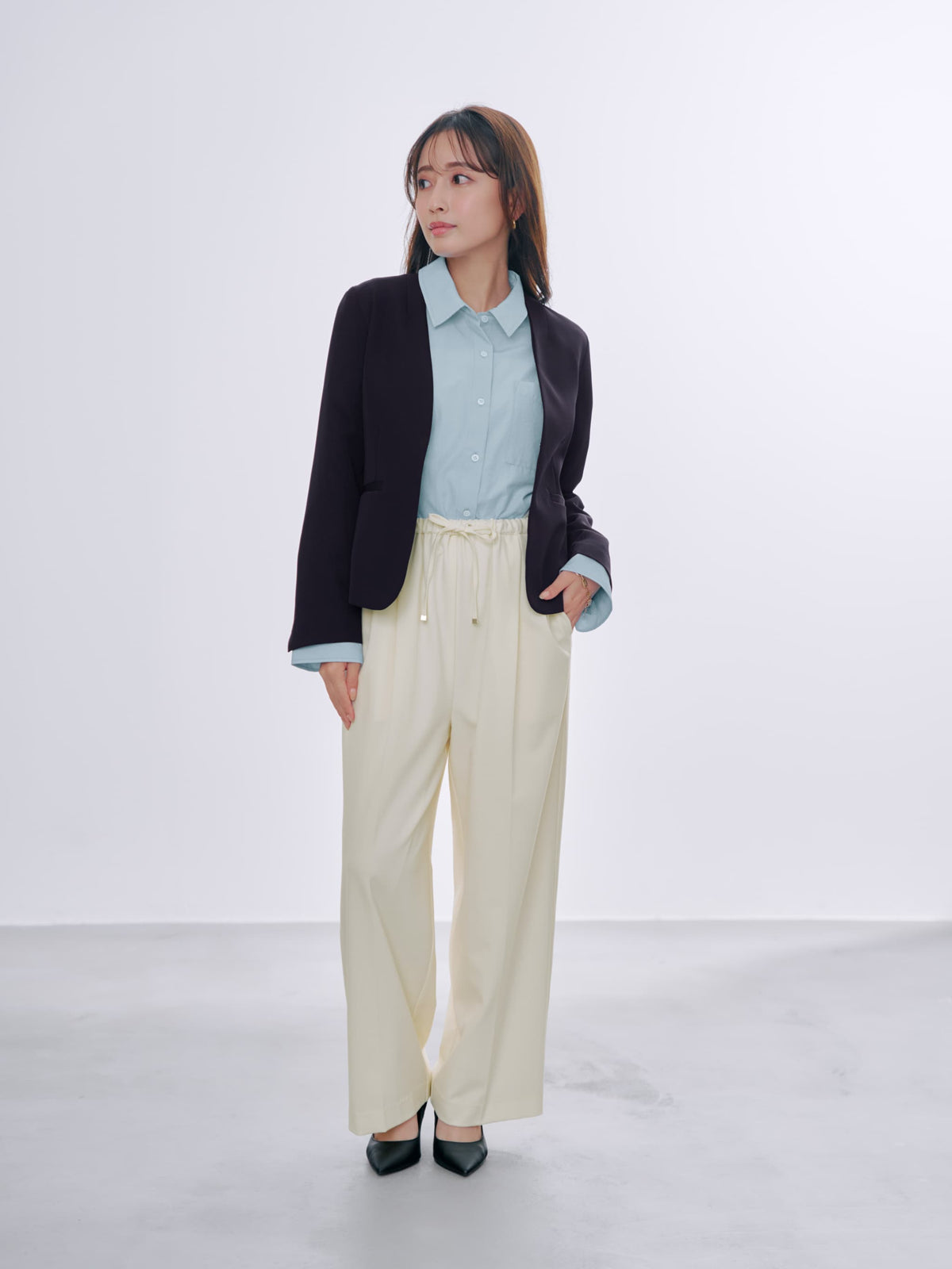 身長148cmで腰周りにかかる丈感なので、襟を抜くとよりリラクシーな雰囲気で着ることができます。今時期は羽織としてキャミに合わせるのはもちろん、季節が進んだらハイネックのリブニットをレイヤードして着るのもおすすめです!