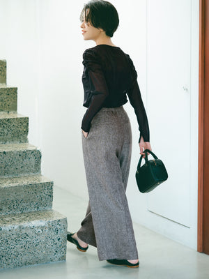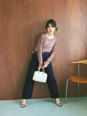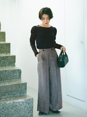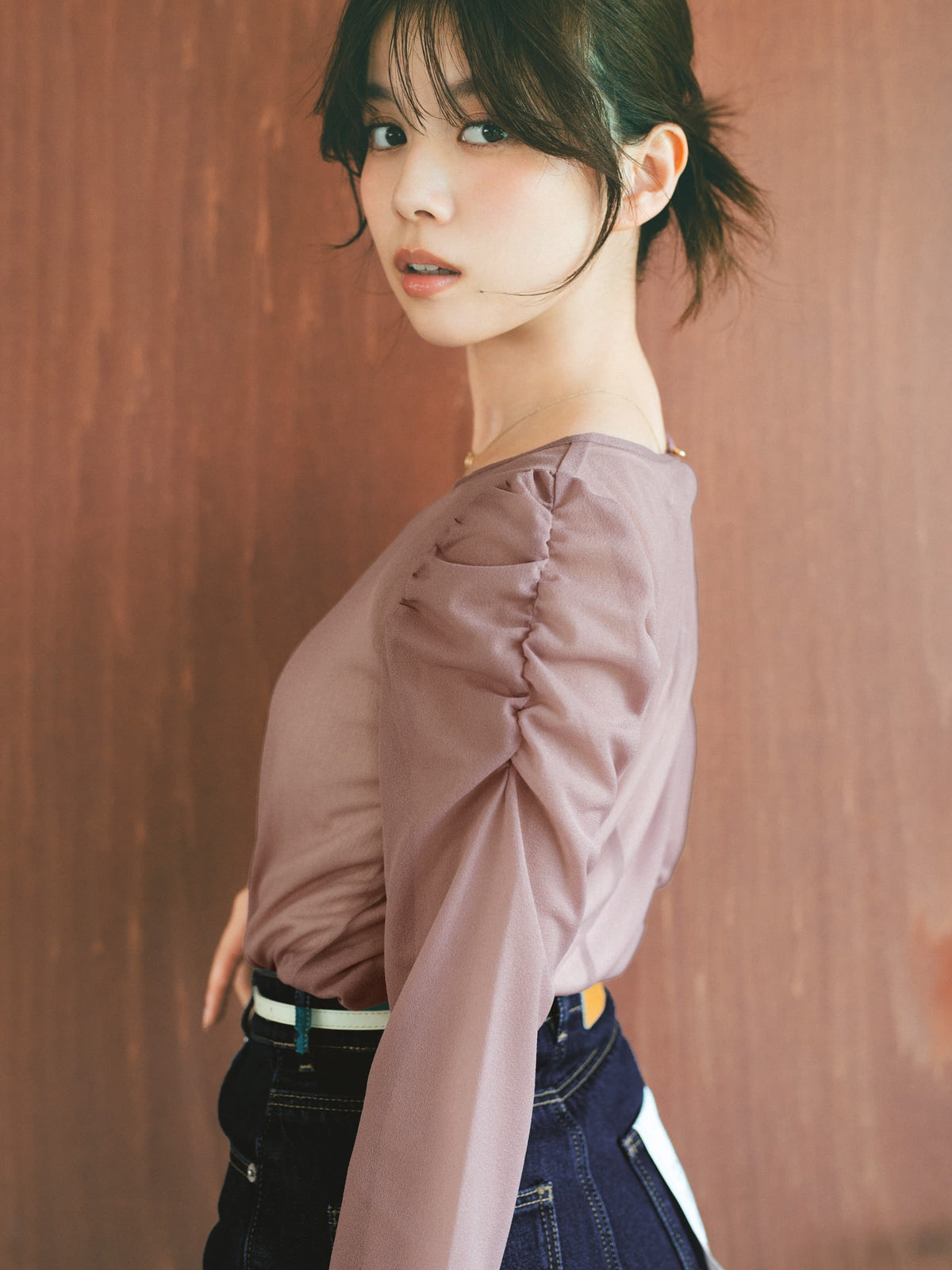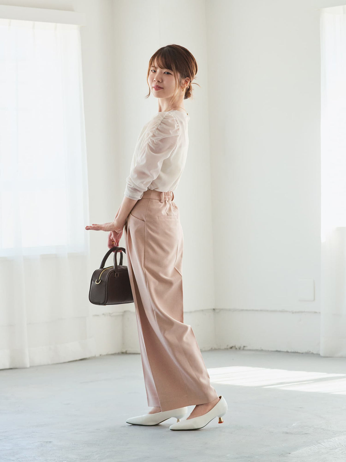 袖にデザインがあるトップスも薄手の素材なのでもたつかず、上からジャケットやブルゾンなども羽織りやすいです。スカートと合わせてフェミニンなスタイルから、カジュアルなパンツと合わせて甘めカジュアルなスタイリングまで幅広く着回していただけます。