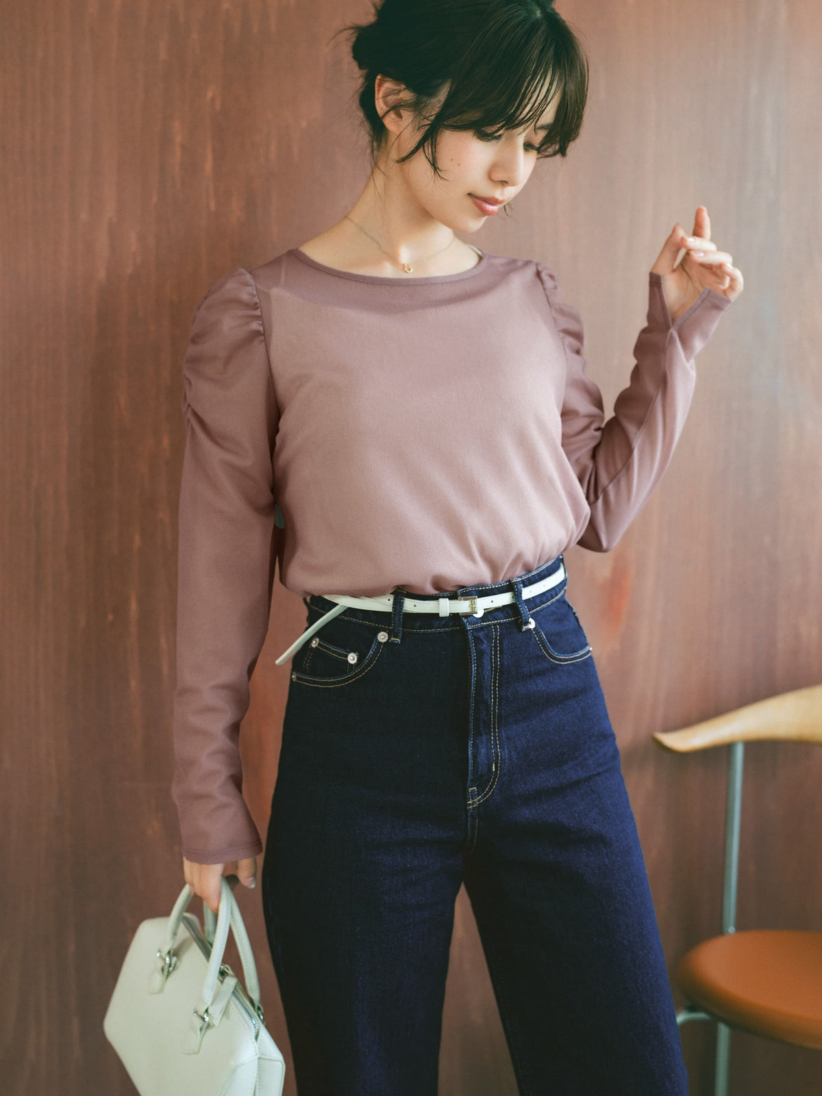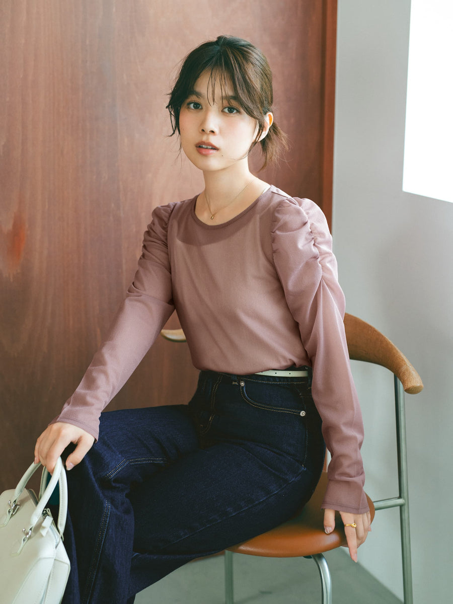 肩から袖にかけてふんわりと入れたギャザースリーブがフェミニンな印象のカットソートップス。