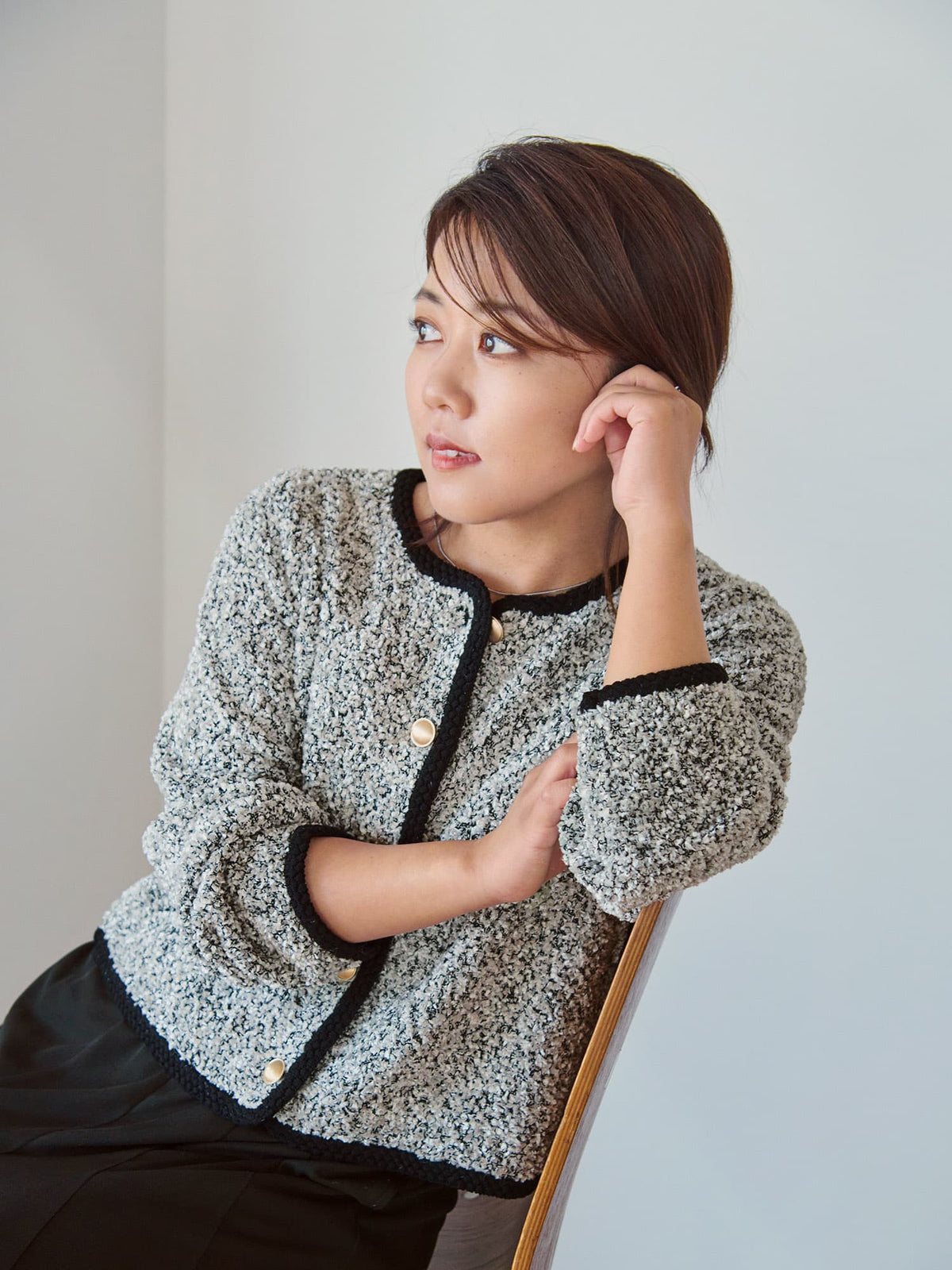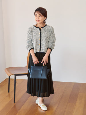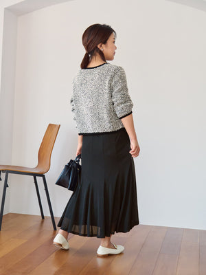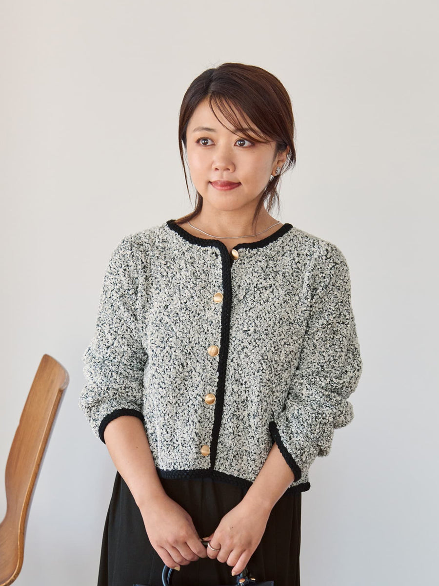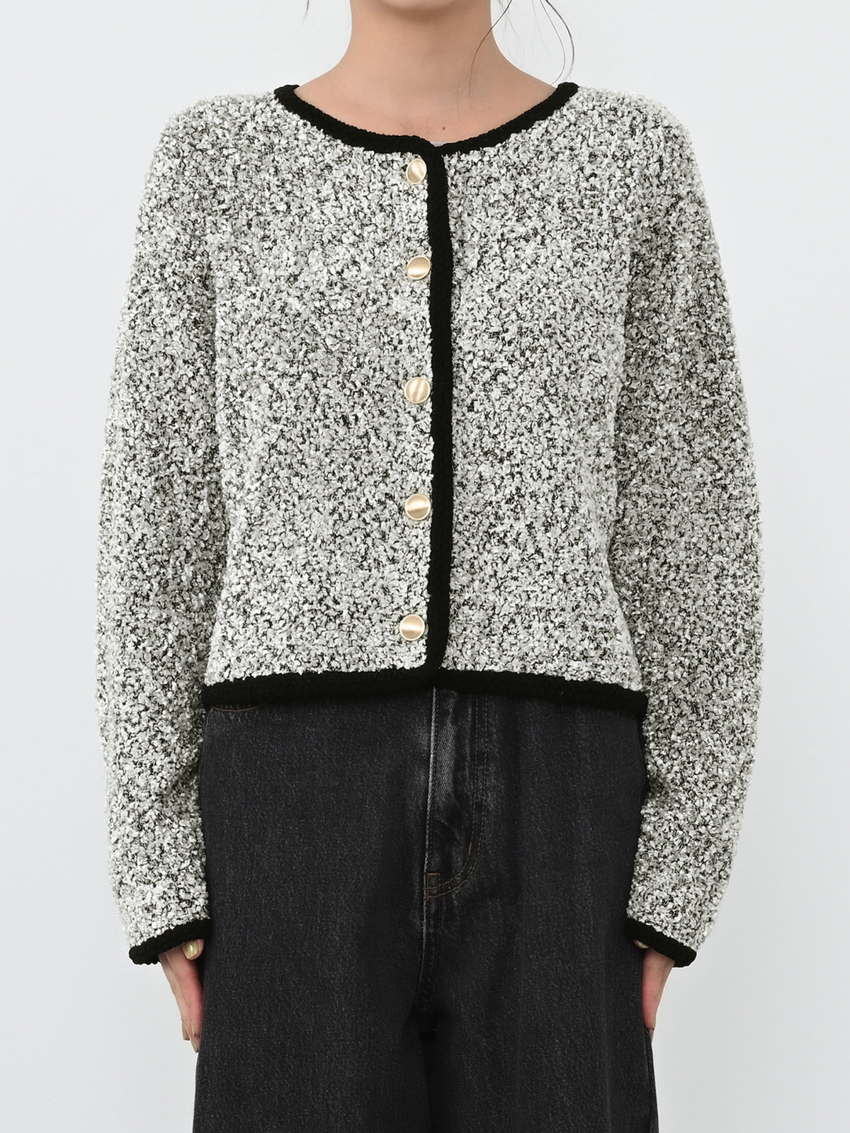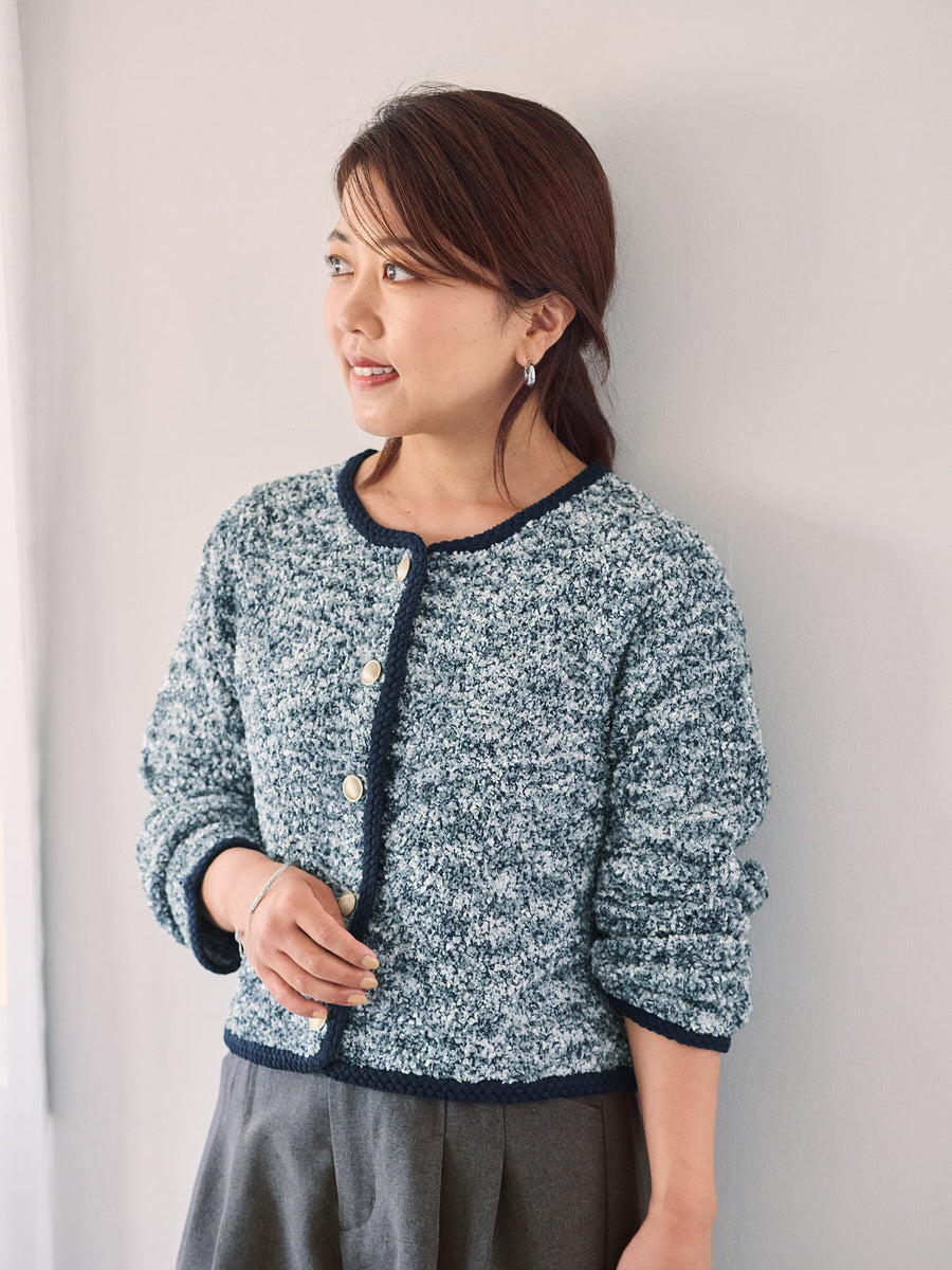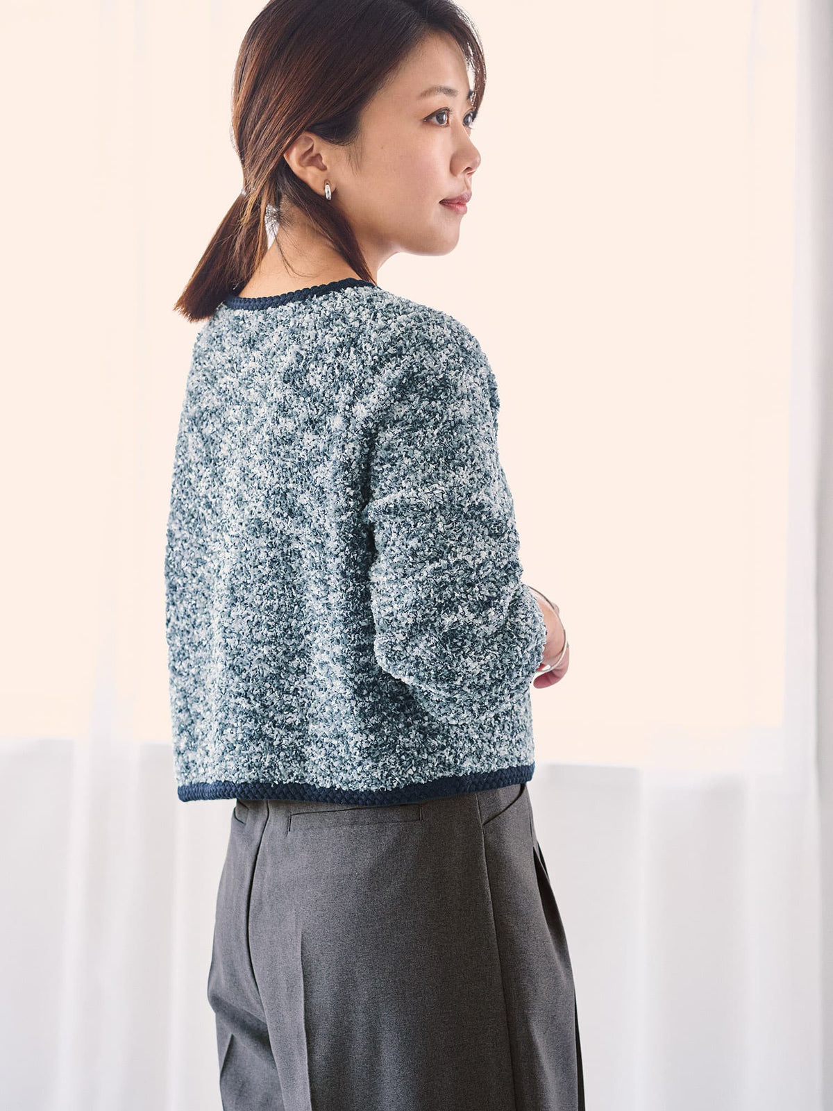 光沢感のあるミックス調のツイードが華やかに着映えるニットカーディガン。ツイードジャケットのような上品さと華やかさがありながらも、サラッと羽織りやすい手軽さと着心地の良さがニットならではの魅力。