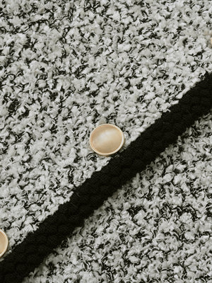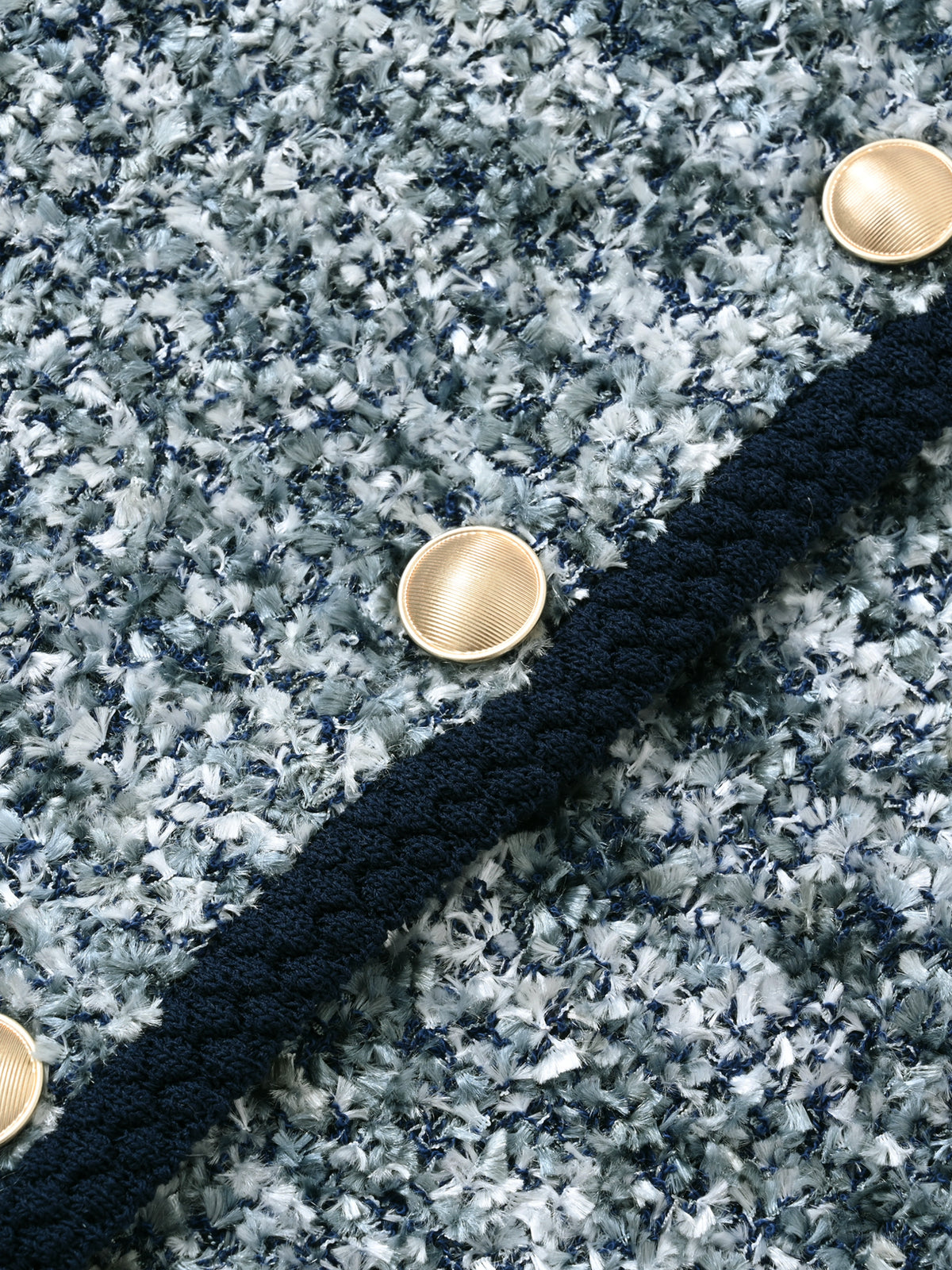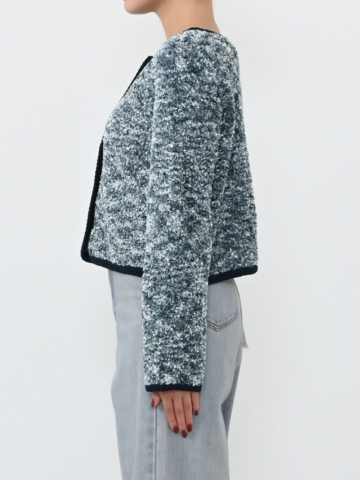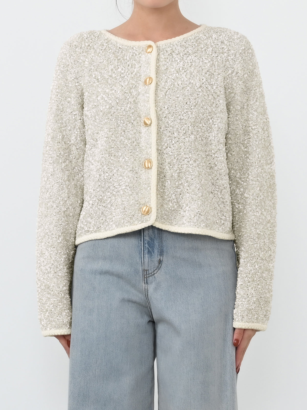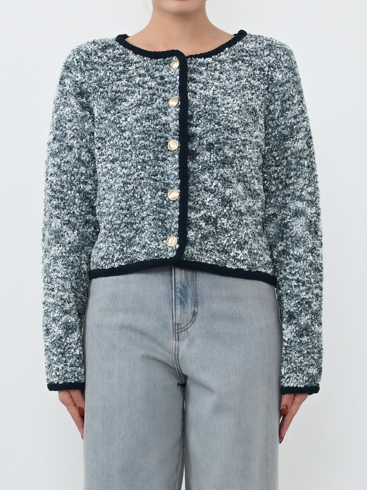 光沢感のあるミックス調のツイードが華やかに着映えるニットカーディガン。ツイードジャケットのような上品さと華やかさがありながらも、サラッと羽織りやすい手軽さと着心地の良さがニットならではの魅力。