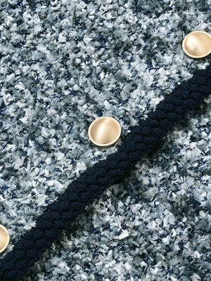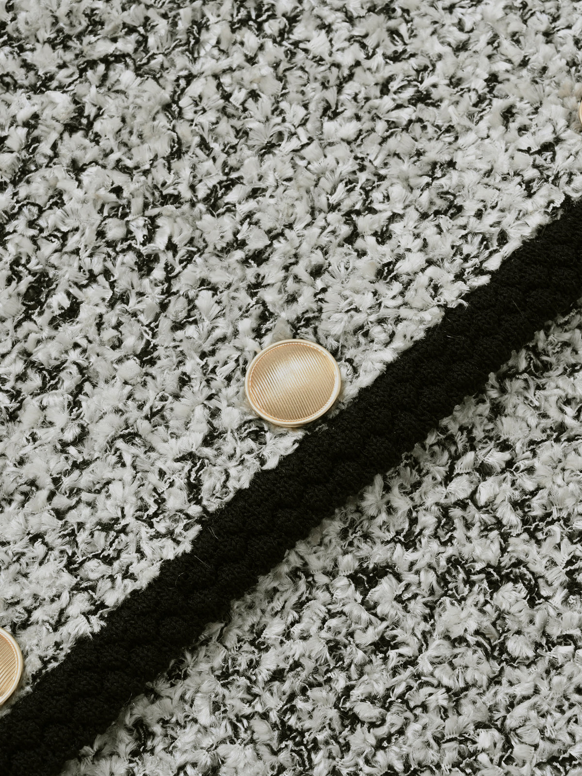 柄編みで仕上げた縁取りとゴールドボタンがさりげなくクラス感をアップしてくれるデザイン。