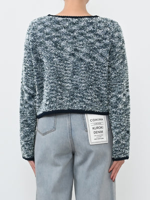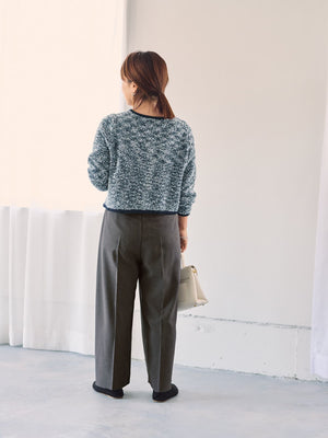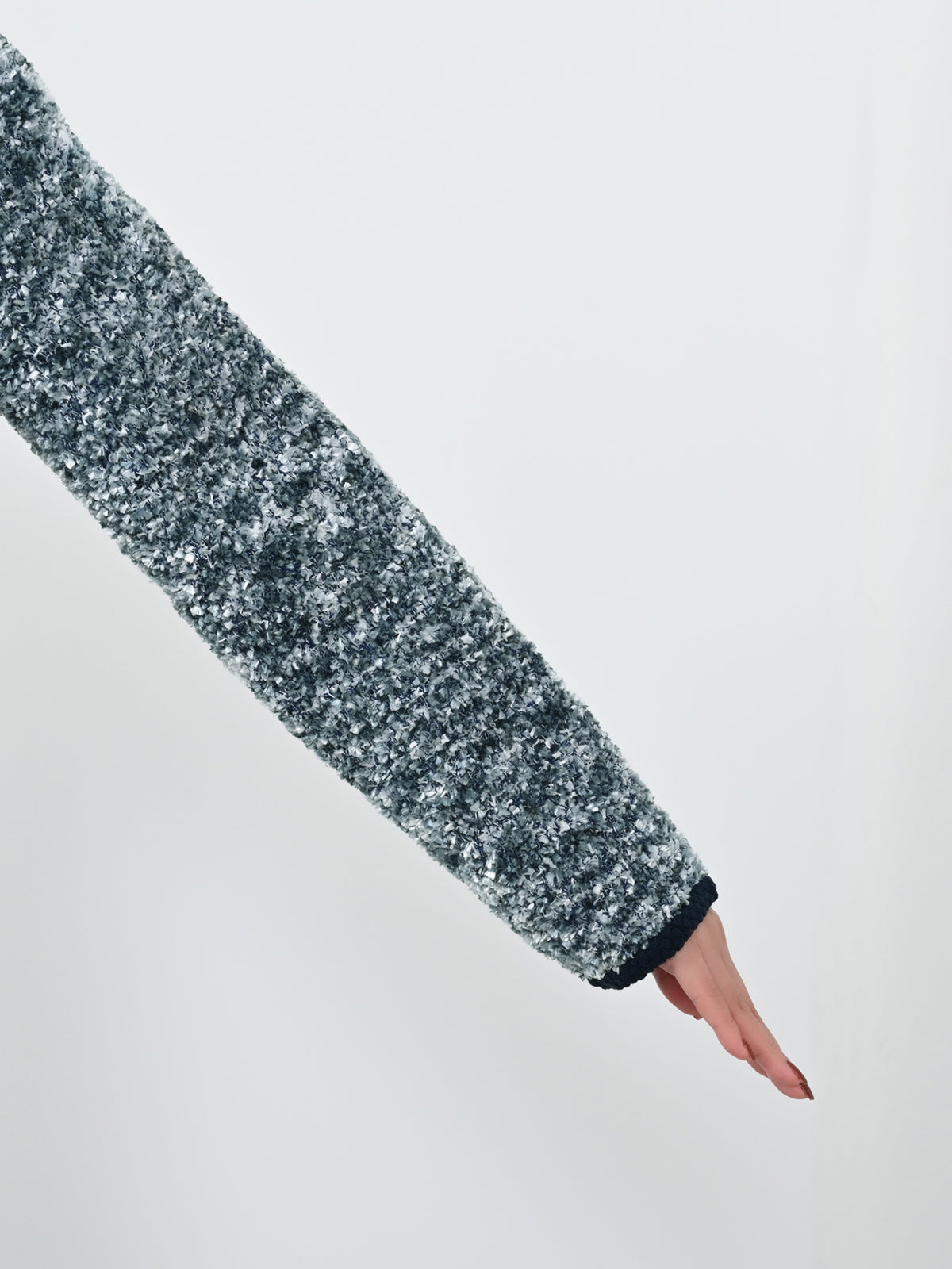 ブークレ糸とフラッグヤーンを組み合わせ、同系色が混ざり合った奥行きのある表情が特徴の編み地に編み立てました。