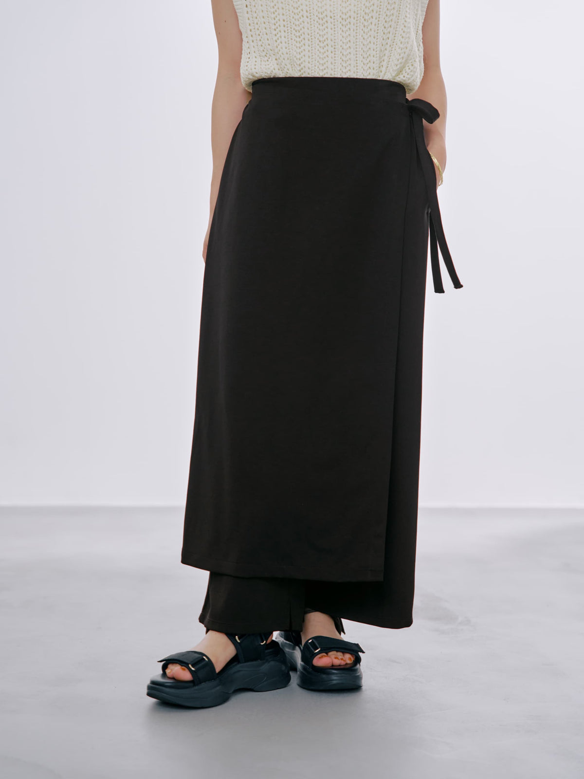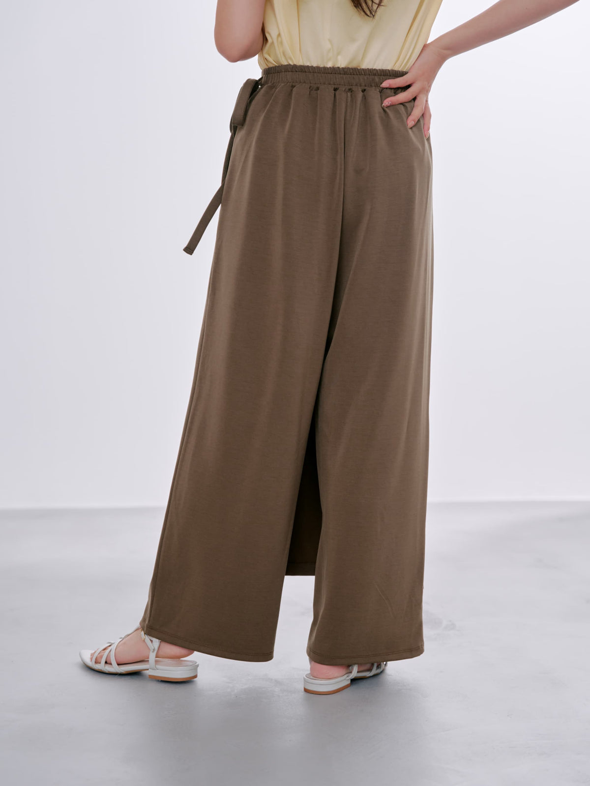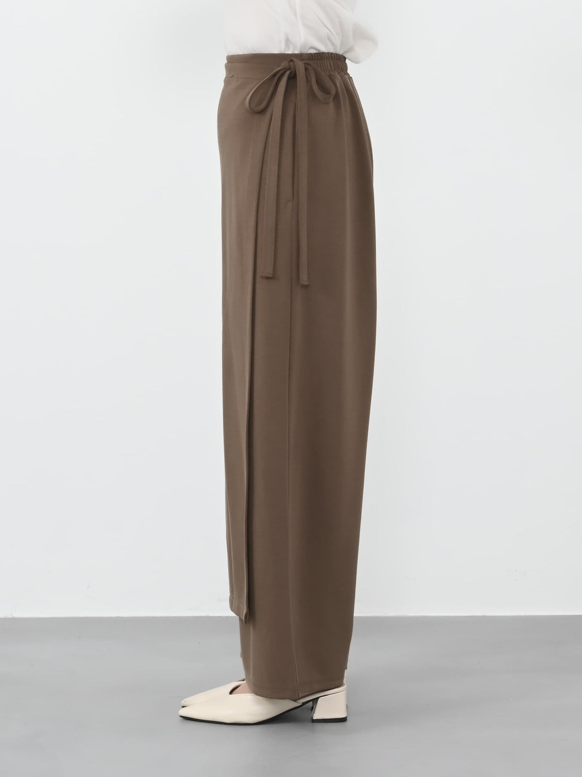 程よいワイドストレートシルエットのパンツで、ボディラインも拾いにくく、すっきりご着用いただけます。お腹周りもカバーしてくれるラップデザインは小柄さんに合わせたサイズ感でお作りしました