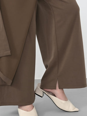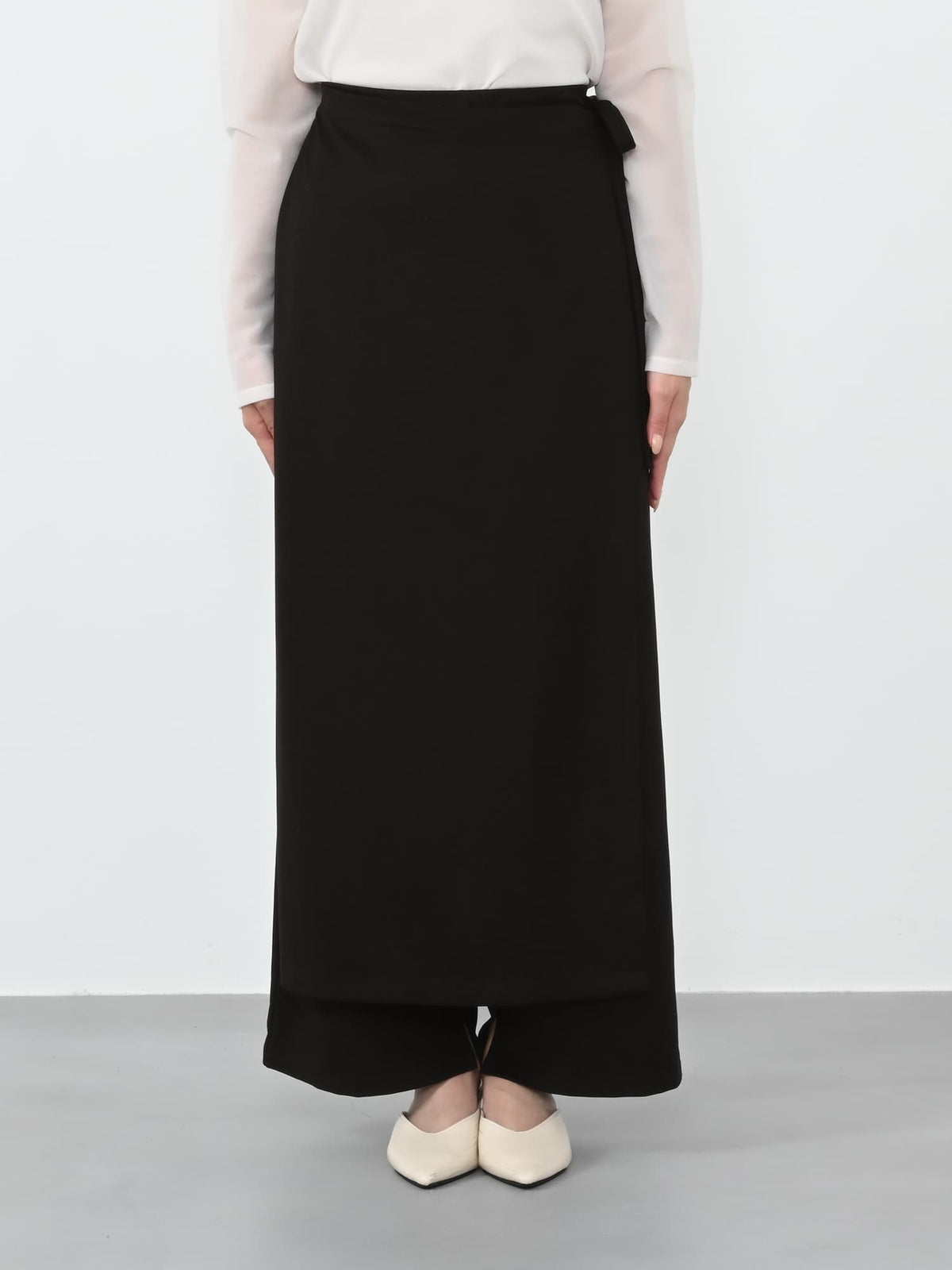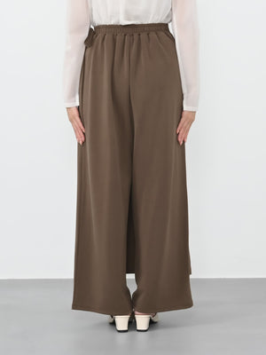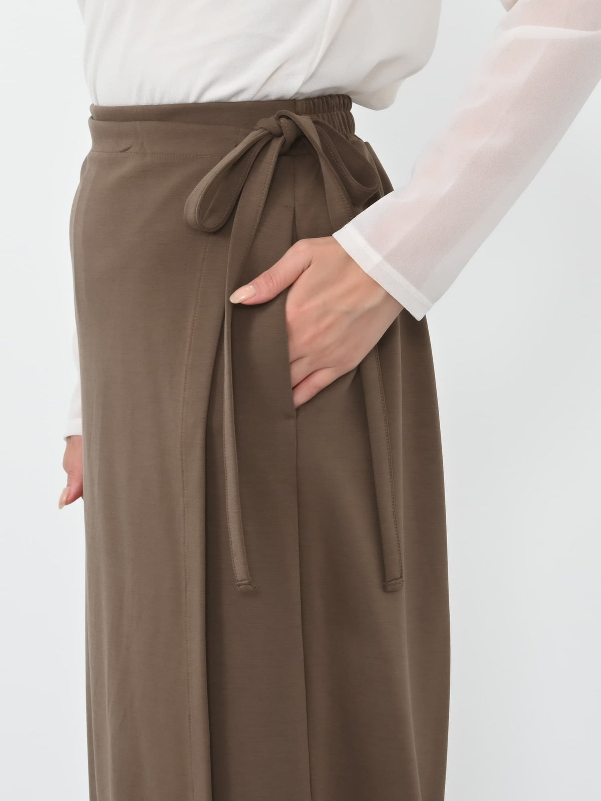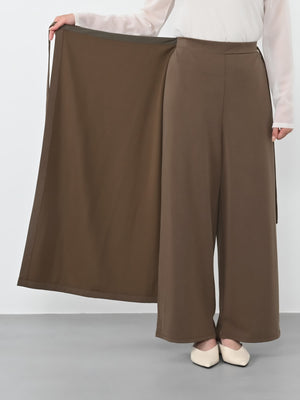 程よいワイドストレートシルエットのパンツで、ボディラインも拾いにくく、すっきりご着用いただけます。お腹周りもカバーしてくれるラップデザインは小柄さんに合わせたサイズ感でお作りしました